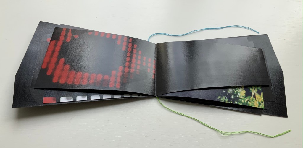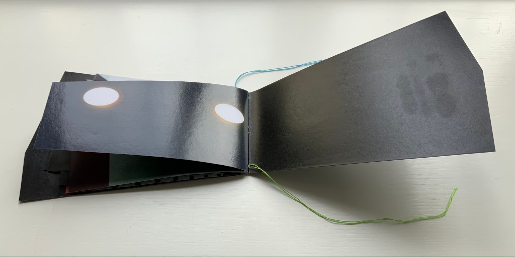 On the black pages, the artist has overprinted in black to give a shadowy depth to the images and surface. The images in the dark sometimes reflect the images in the light — sometimes from the facing page, other times from previous pages. Below, for instance, the film-sprocket shapes just visible on a previous verso page’s lower edge reappear faintly, enlarged and in black over the red lights. The red lights, in turn, reappear faintly, also enlarged and in black on the lower half of the narrowing recto page.