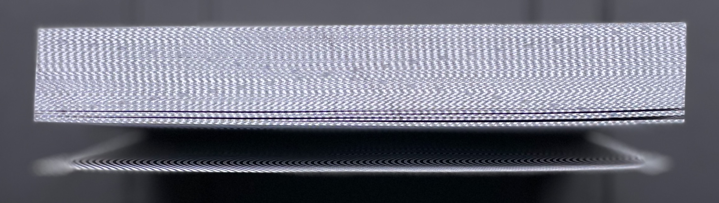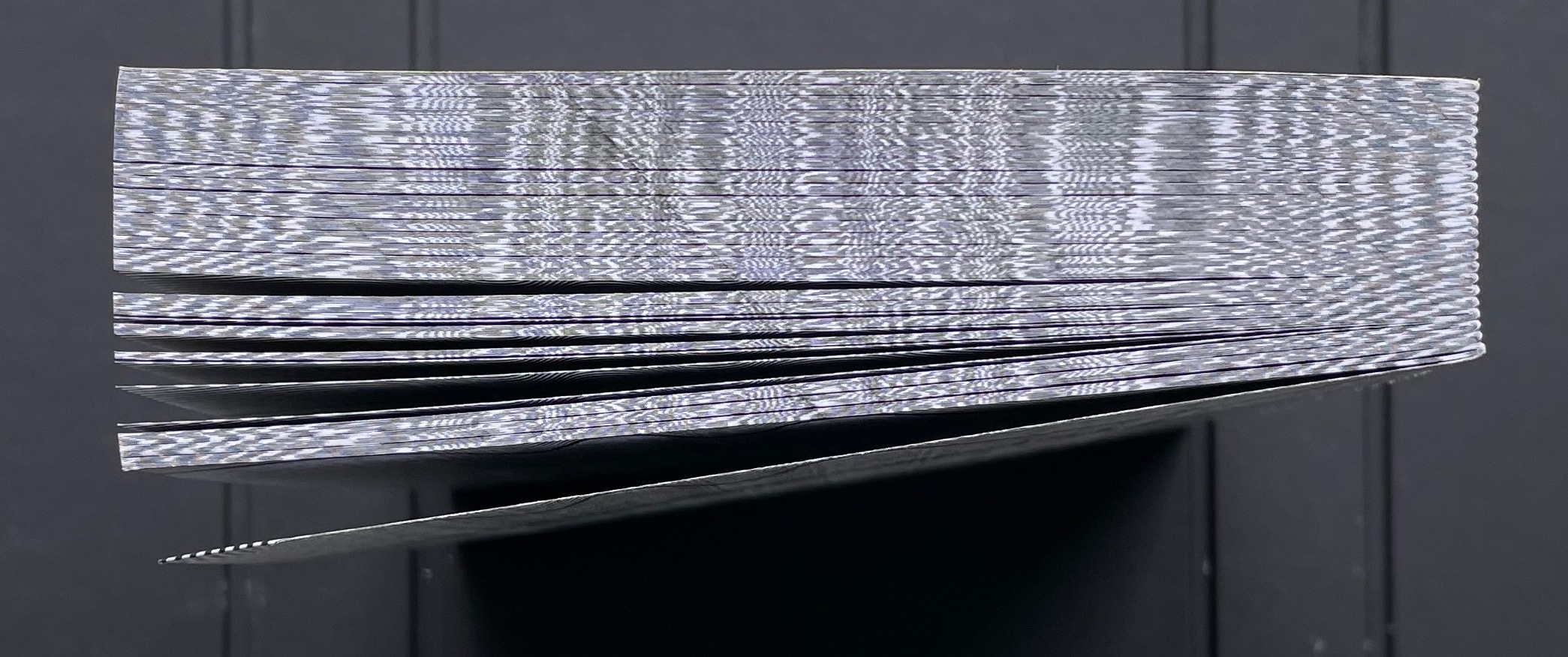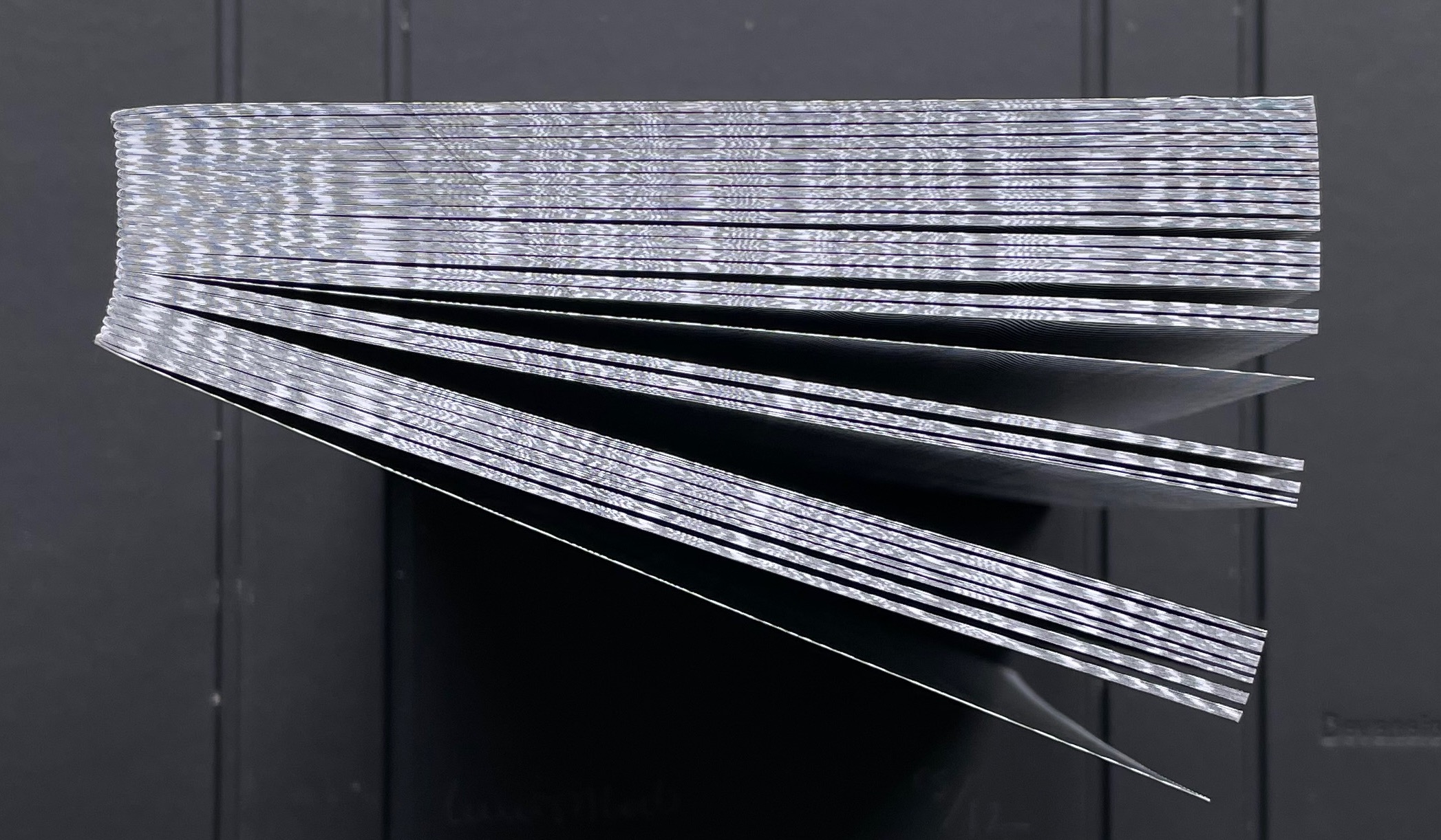 The crossover of the verso and recto thick lines can be observed on the book’s fore edge, and the thinner lines’ stroboscopic effect shows up even on the top and bottom edges.