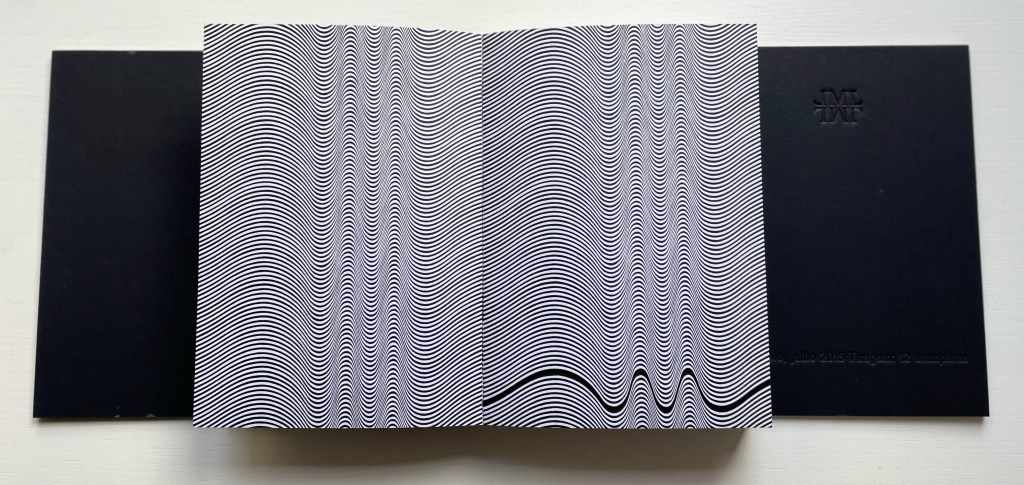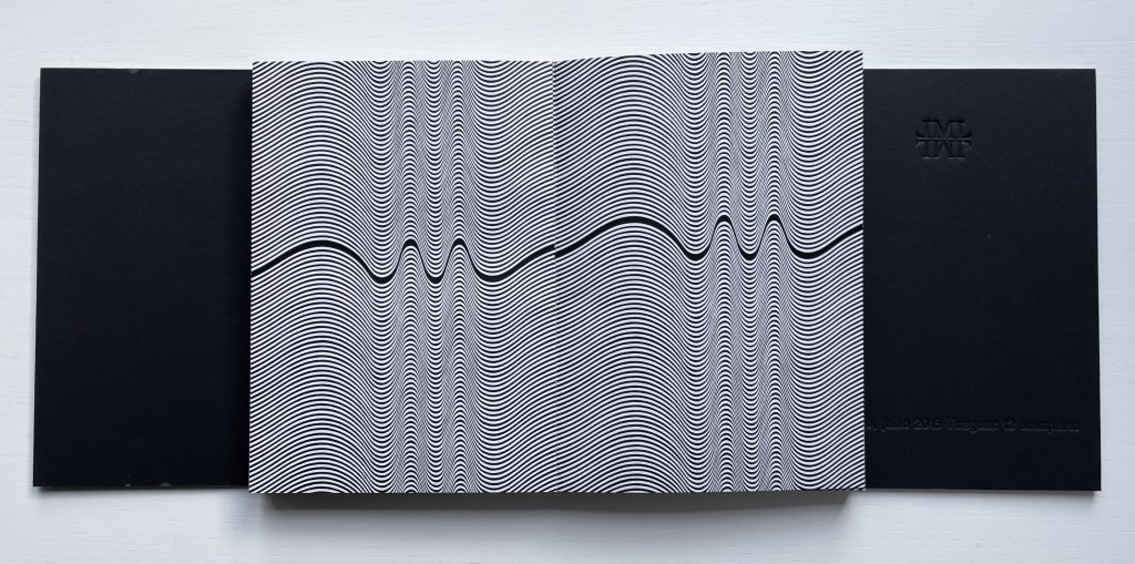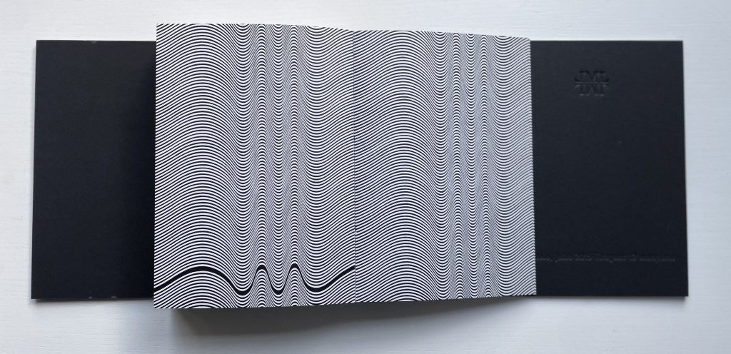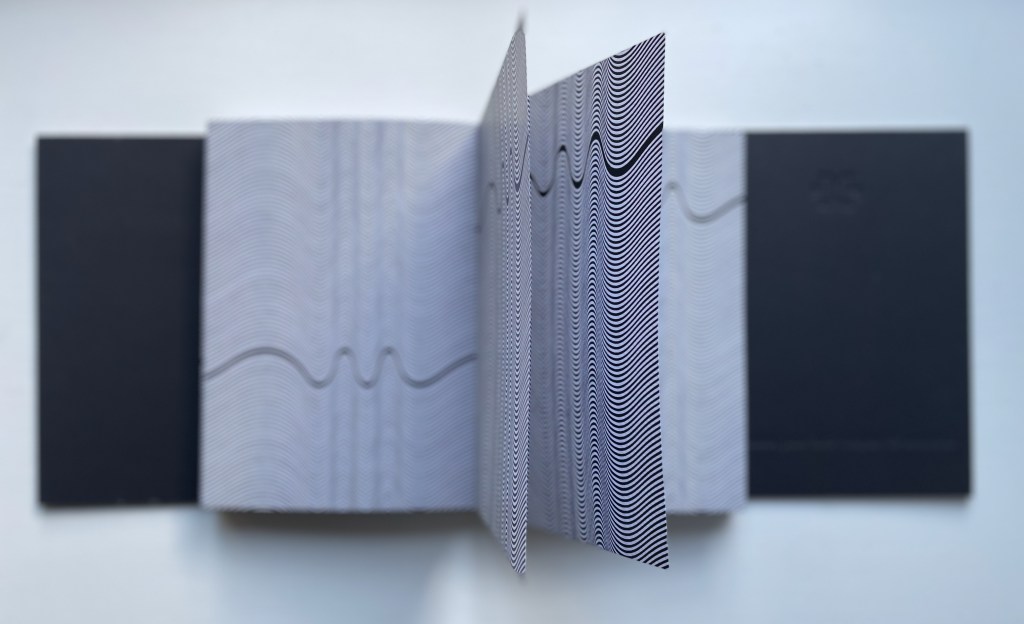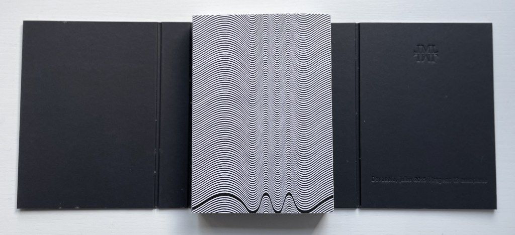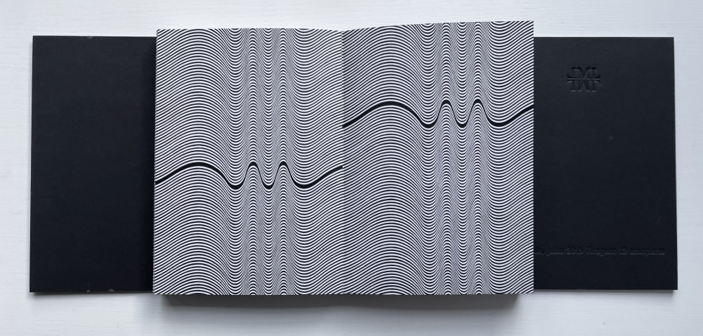 Devaneio means “daydream”, which is certainly elicited by the thick black line undulating over the hills and valleys optically created by the thinner lines parallel to each other and the thicker line. Over the first seventeen pages, the thick line appears only at the bottom of the recto page, but almost imperceptibly rises up the page.