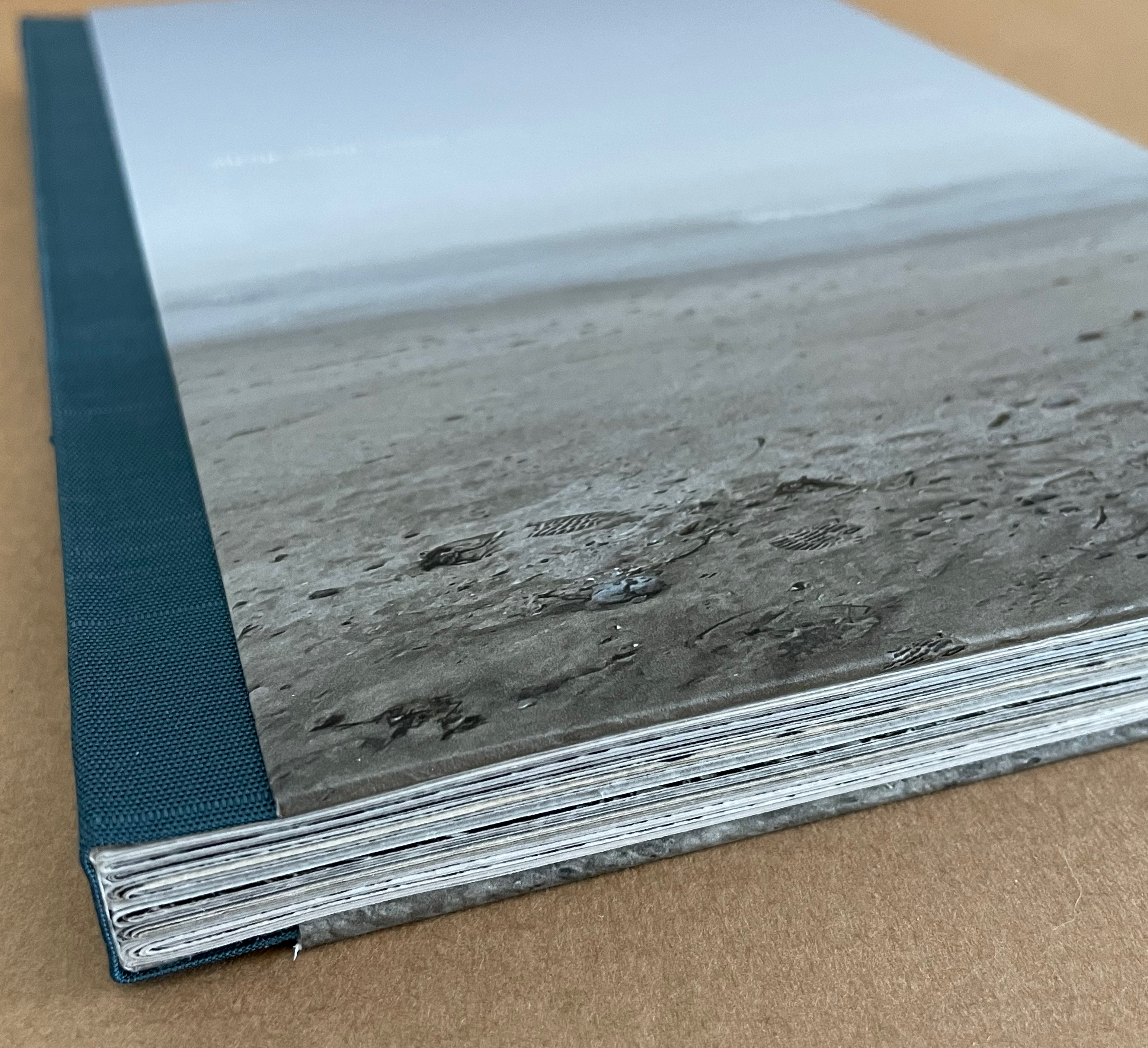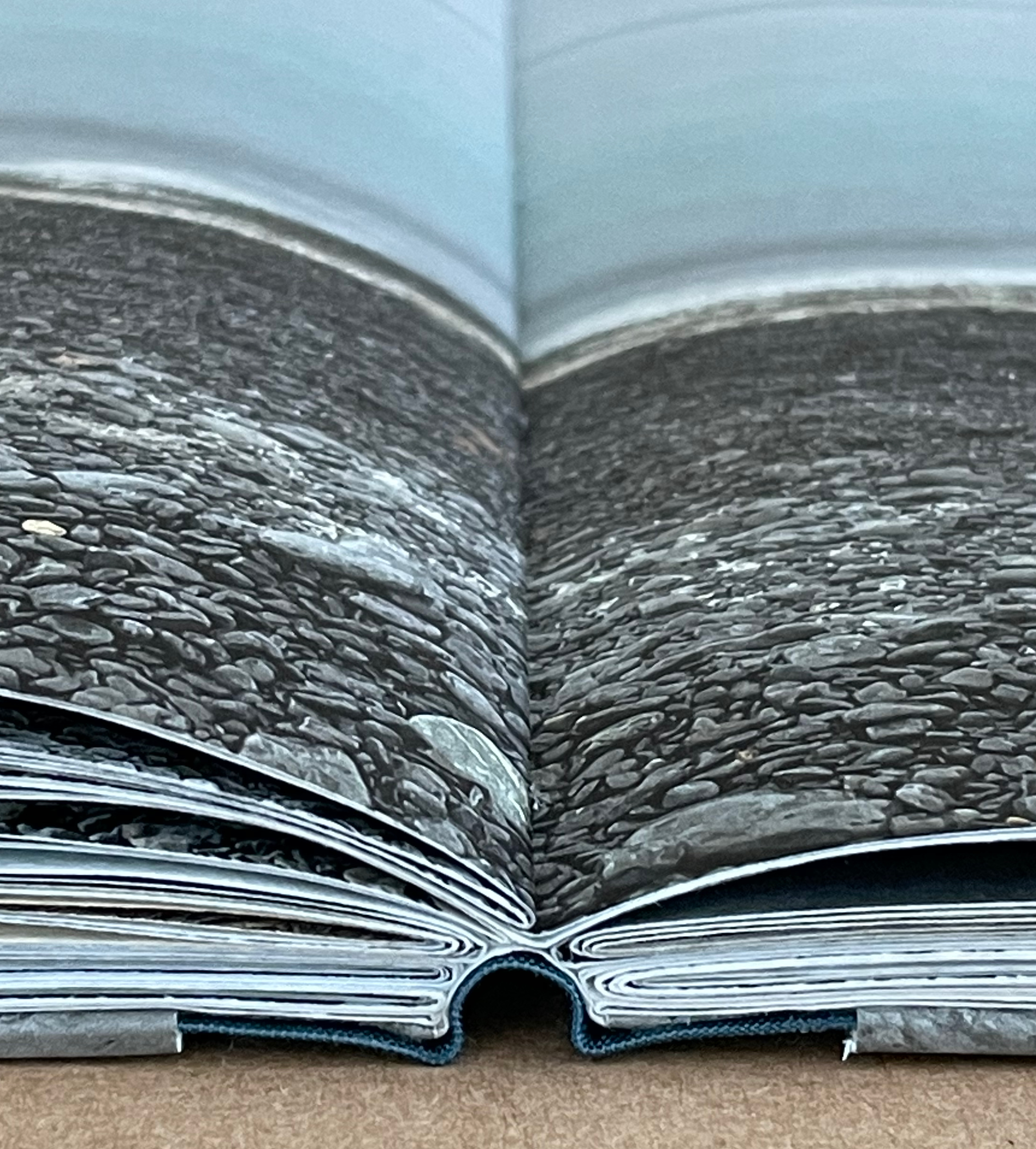 With the binding and her photography in Ebb and Flow, Jane Cradock-Watson has sculpted and painted the sea’s edge. Four digital photographs printed on Zerkal paper have been spliced together between two cloth-covered boards. The flexibility and extent of the concertinaed paper create an undulating structure that turns seascape stills into mesmerising cinema.