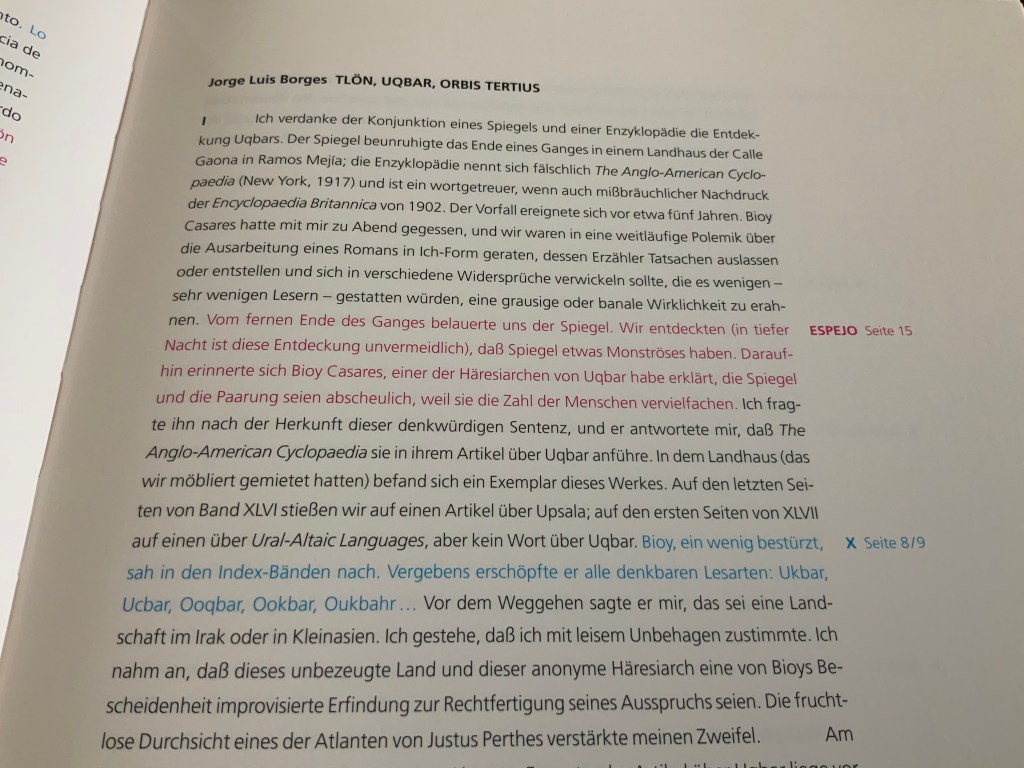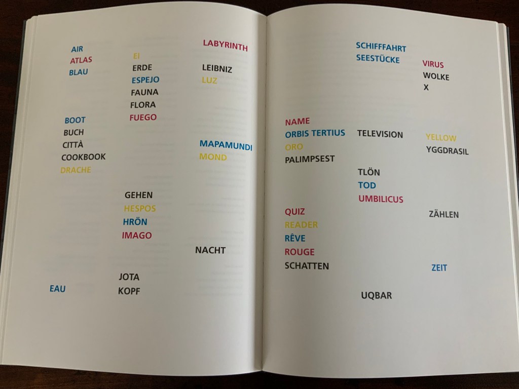 Sampling several paragraphs from the opening and closing of each language version, we can see the red, blue and yellow inks that are used to signal those portions of Borges’ text that appear somewhere in the fifty volumes. In the margins, the volume’s title and specific page number are called out in the relevant colour. The double-page spread separating the contributor’s essays from the section of photos of the fifty volumes applies the primary colours and black across the names of the fifty volumes, leaving space for future volumes. This is the sort of maker’s detail linked with the larger organisational elements that contributes to the unity of a work that, in Hanebutt-Benz’s words, is an “encyclopedic collection of creative possibilities, generating a book cosmos, closed within itself, playfully and yet following strict guide lines.”