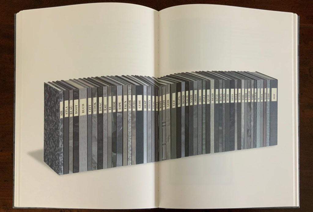 Through his fiction — especially his story ”Tlön, Uqbar, Orbis Tertius” — Jorge Luis Borges has played as inspirational a role for artists and book artists as have Lewis Carroll, Stéphane Mallarmé and Laurence Sterne. An incomplete list includes Katie Holten’s About Trees, Sean Kernan’s Secret Books, Aurélie Noury‘s “Pierre Ménard, El Ingenioso hidalgo Don Quijote de la Mancha“, Hanna Piotrowska (Dyrcz)‘s Jorge Luis Borges, The Maker, Liliana Porter’s prints, Elaine Sturtevant’s Sturtevant: Author of the Quixote and Daniel Temkin’s and Rony Maltz’s Borges: The Complete Works. For book art, though, Malutzki’s and Von Ketelhodt’s fifty-volume work must lead the list, closely followed by this descriptive catalogue, a bookwork in itself.