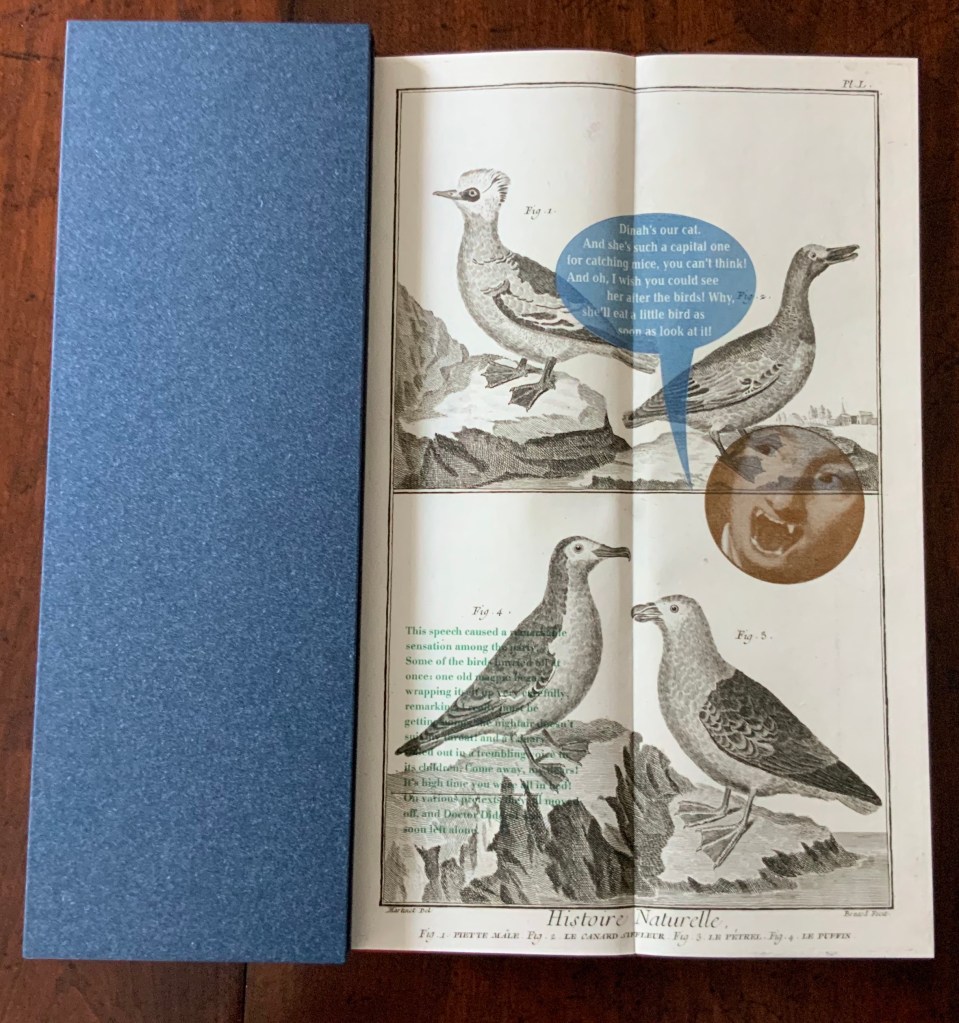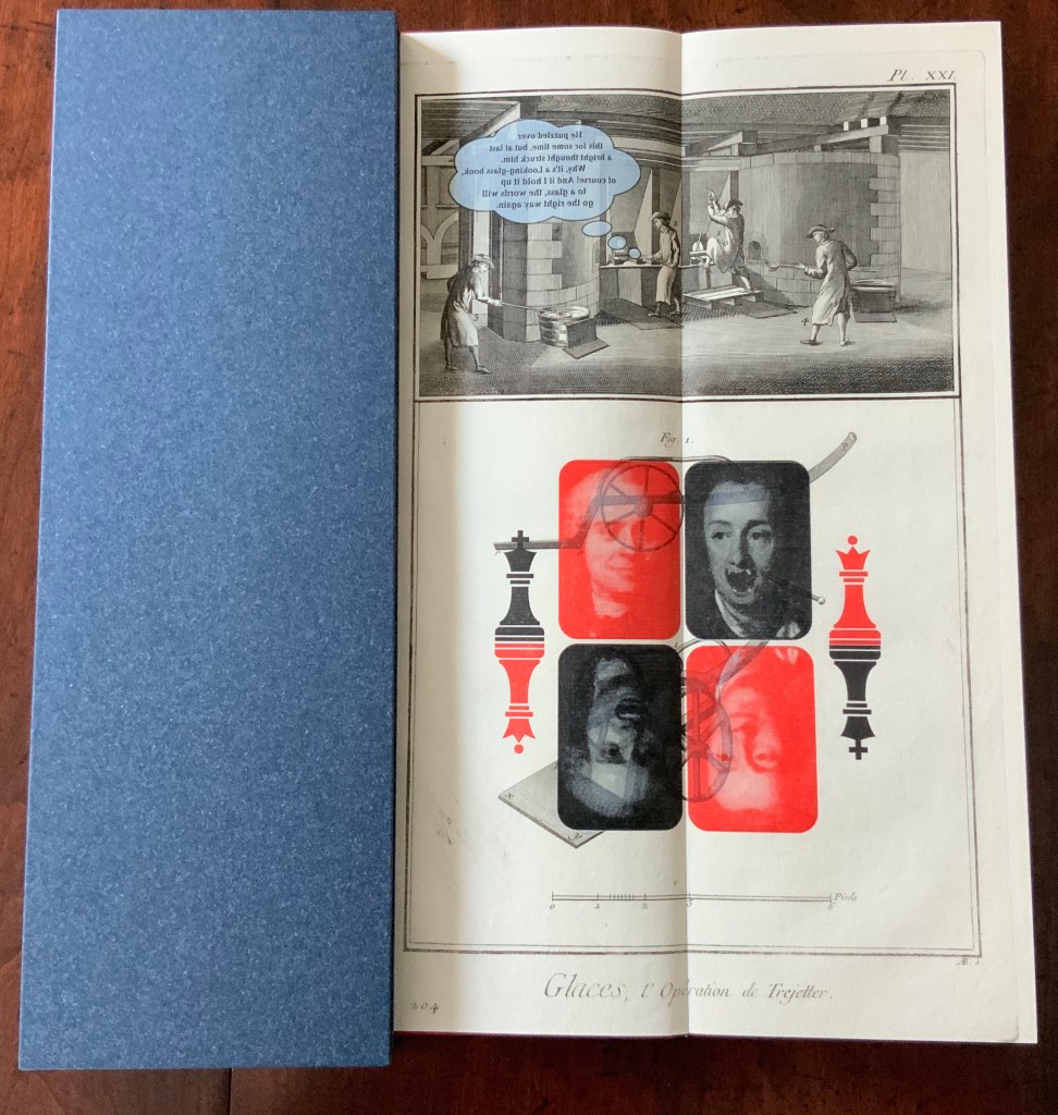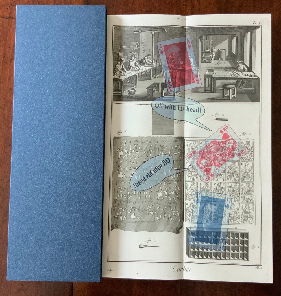 More directly to the artistic quality of Doctor Diderot’s and Mister d’Alembert’s Adventures: The photos here do little justice to the work’s precision, the sound of the slipcase’s snug fit, the layering of colours on the page, the motion of the spine, and the different textures of the 21st century cloth binding, the slipcase, endpapers and leaves of engraving papers so neatly adhering to each other that they feel like a single leaf. It is refreshing to see Alice appear outside the tableaux to which so many book artists have turned when inspired by Carroll. It is genius to have merged Carroll’s fictive exploration of logic and epistemology with the Enlightenment’s attempt to encompass humankind’s knowledge of the sciences, arts and industries or crafts.