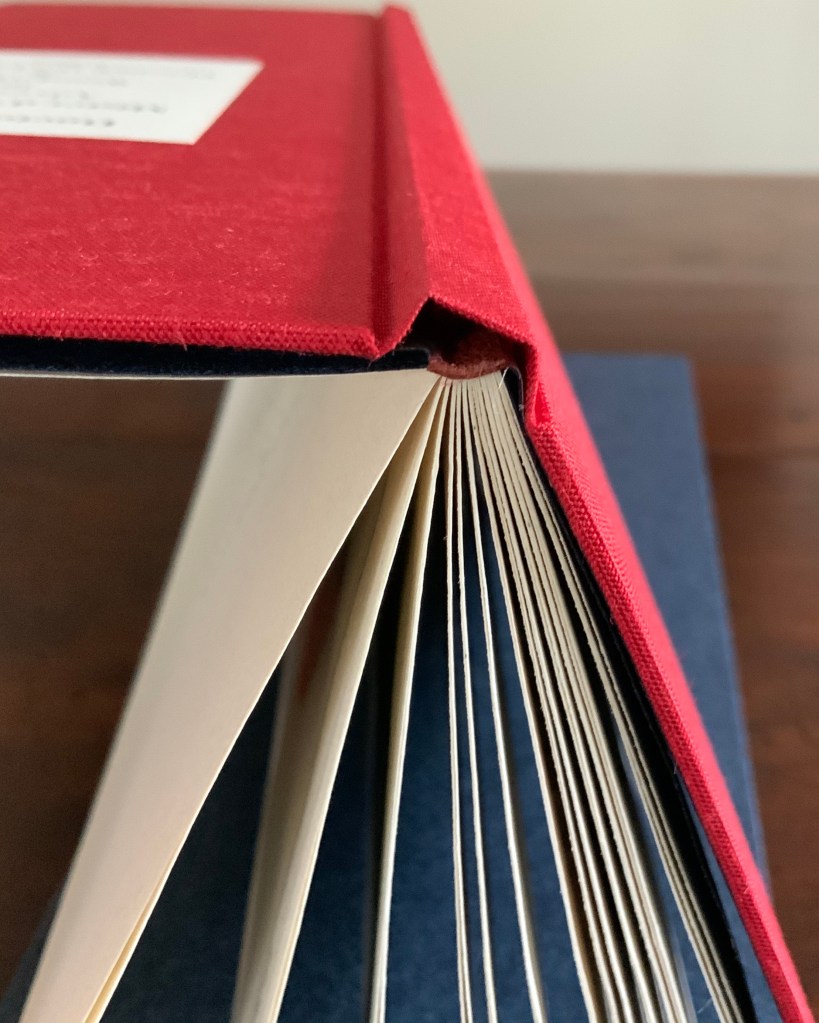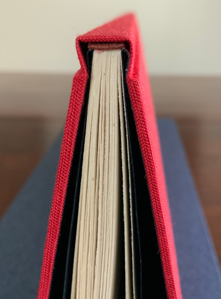 The endpapers are dyed through, and the fly-leaves are glued on the fore-edges to the first and last leaf of the book-block. The dark blue material used for the end-papers and the slipcase is an industrial one (Napura Khepera marine by Winter & Company) and is used for the endpapers. The Xian scarlet cloth for the cover also comes from Winter & Company. Throughout the book’s brief narrative, the dark blue associates with Diderot, and the scarlet with d’Alembert.