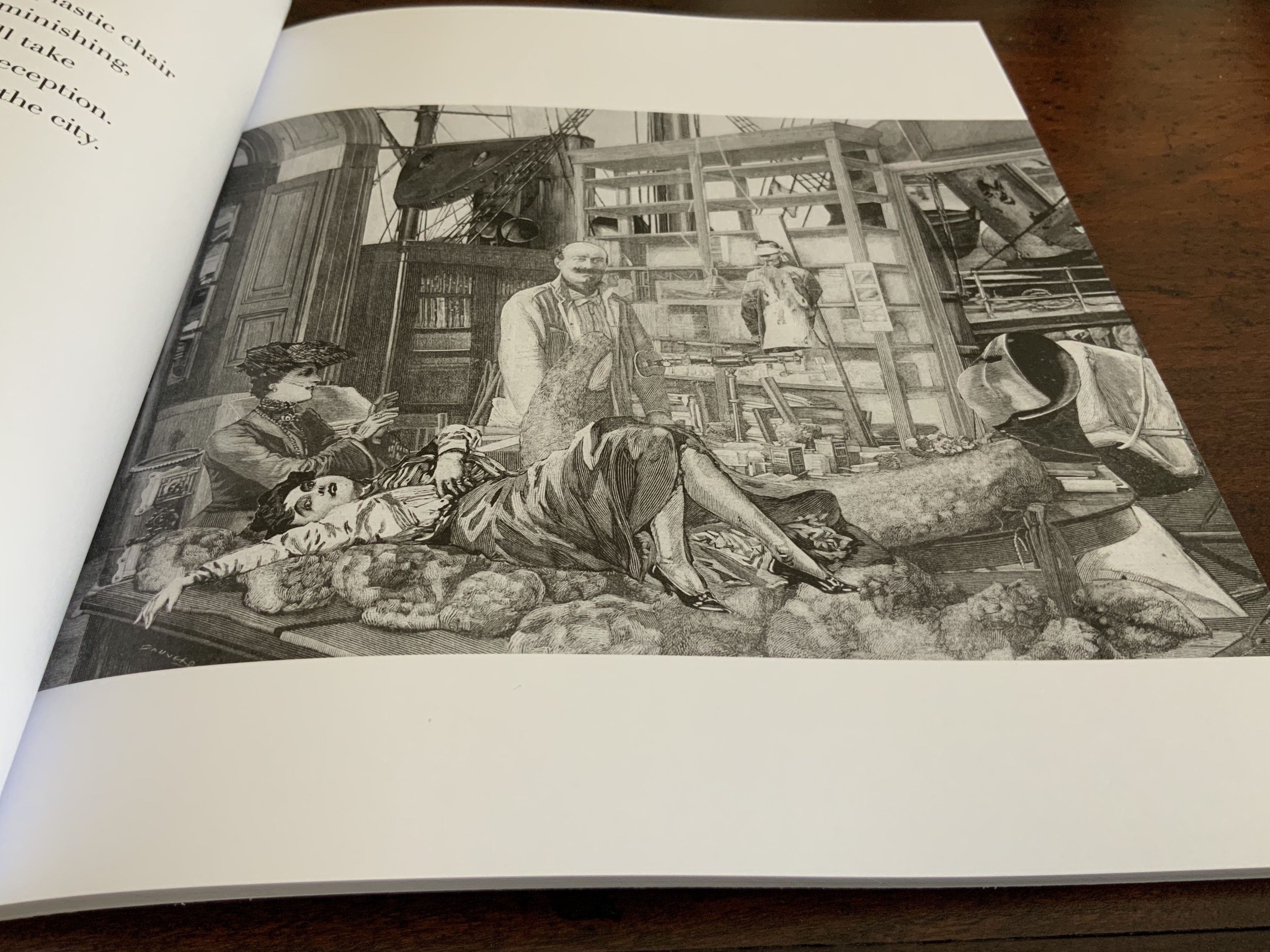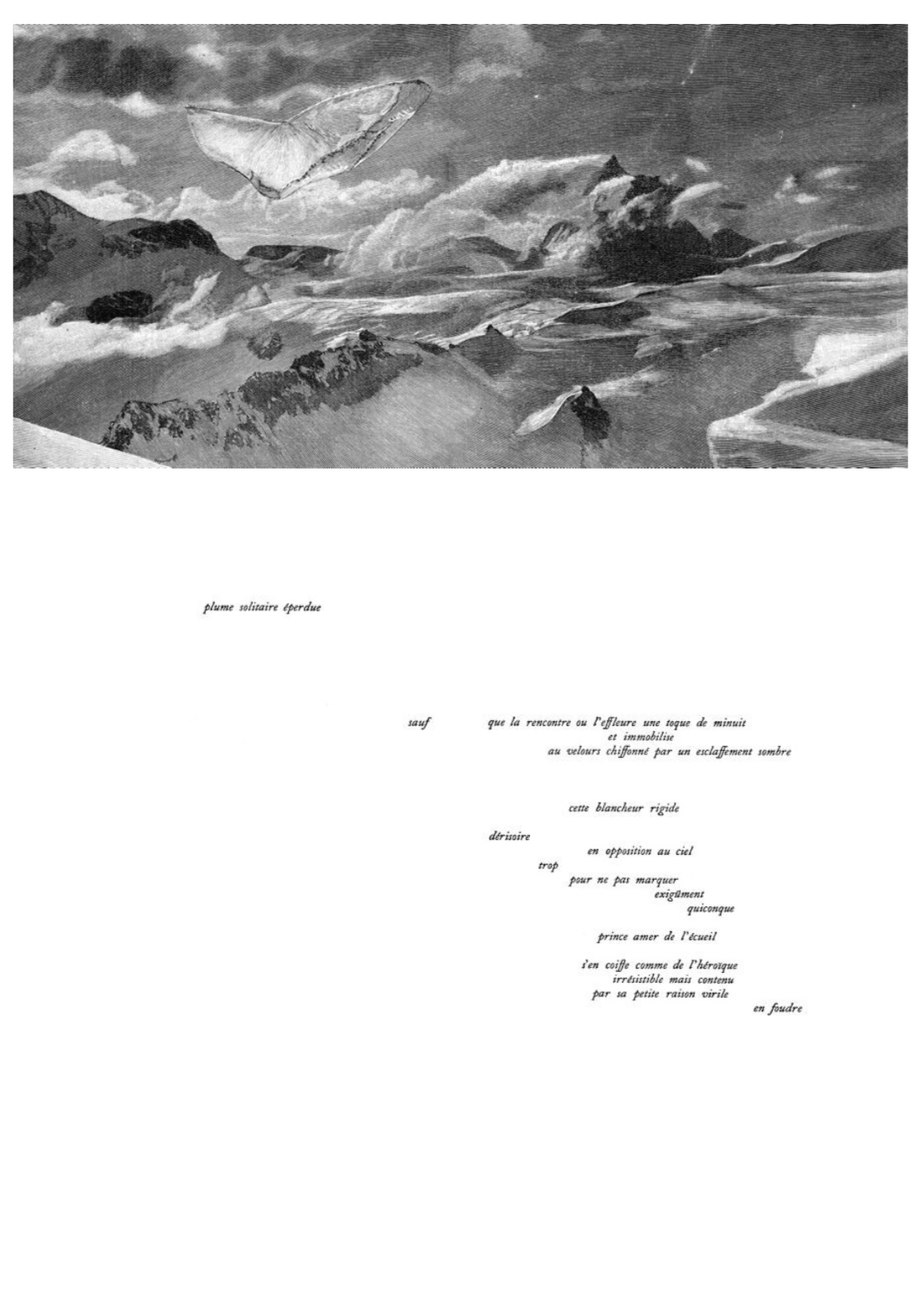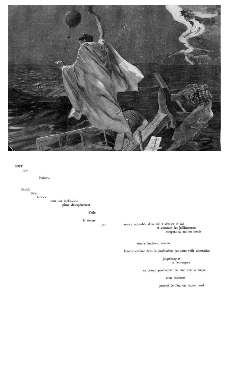 Working in the tradition of the collage novel, and with original engravings from the popular French newspaper Le Grande Illustré (1904), [they] work with the thematic structure and spatiality of Stéphane Mallarmé’s revolutionary poem Un Coup de Dés written a few years earlier. (P. 324)