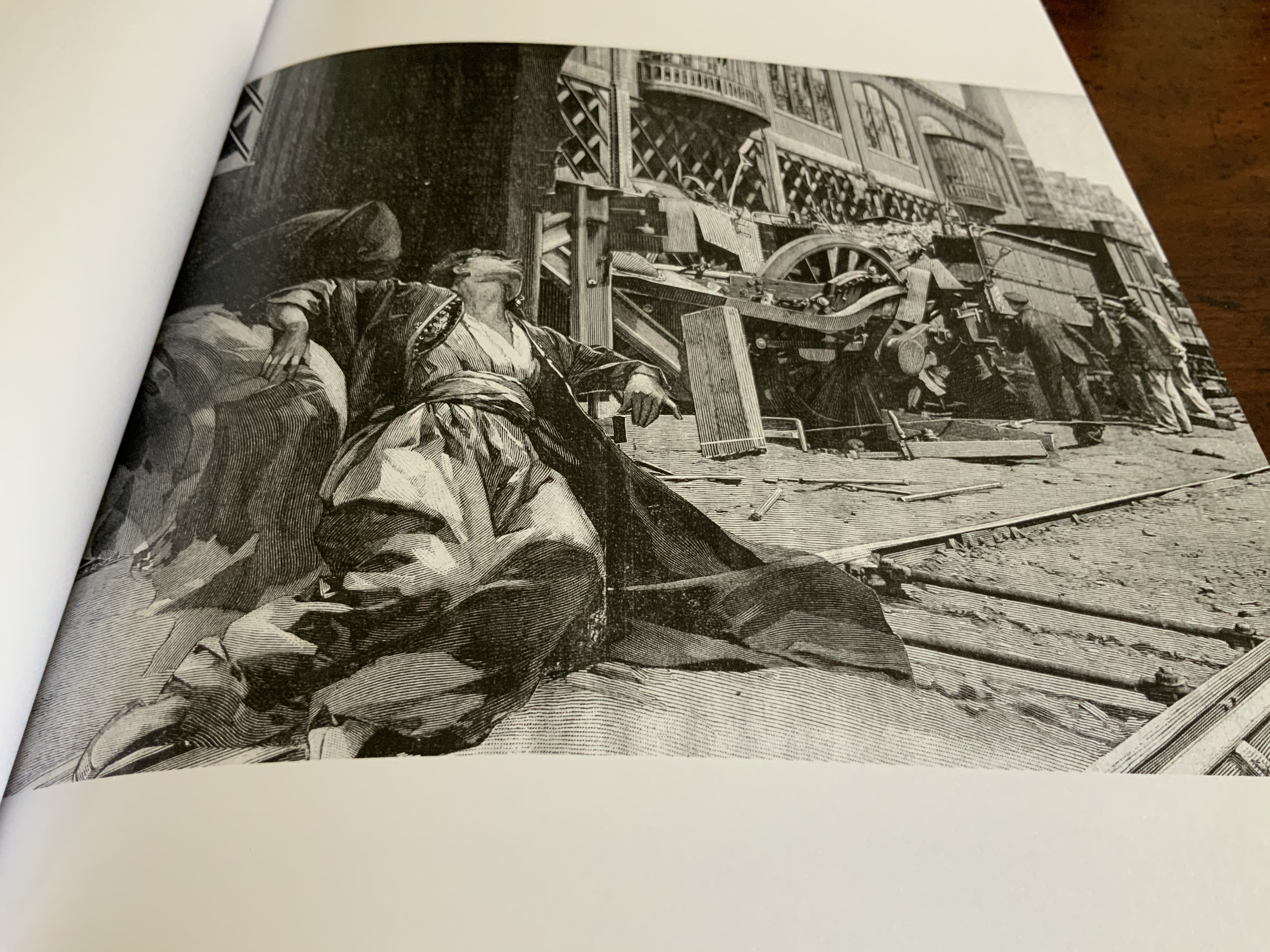 Like the poem, the collages are heterogeneous and their protagonists are “found”, both in terms of their scale and detail, in the dramatized newspaper of the period. The engravings are a snapshot of the terrible uncertainties, reported disasters and social unrest that colored Parisian life at the time. The re-invented figures, scenes and architectural settings are offered as spatial analogues to the poetic passages, exploring the non-perspectival space of the text, its content and poetic imagery as much as its solipsism and incoherence. (Pp. 330-31)