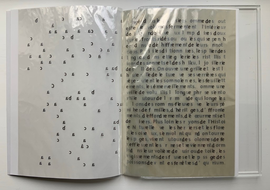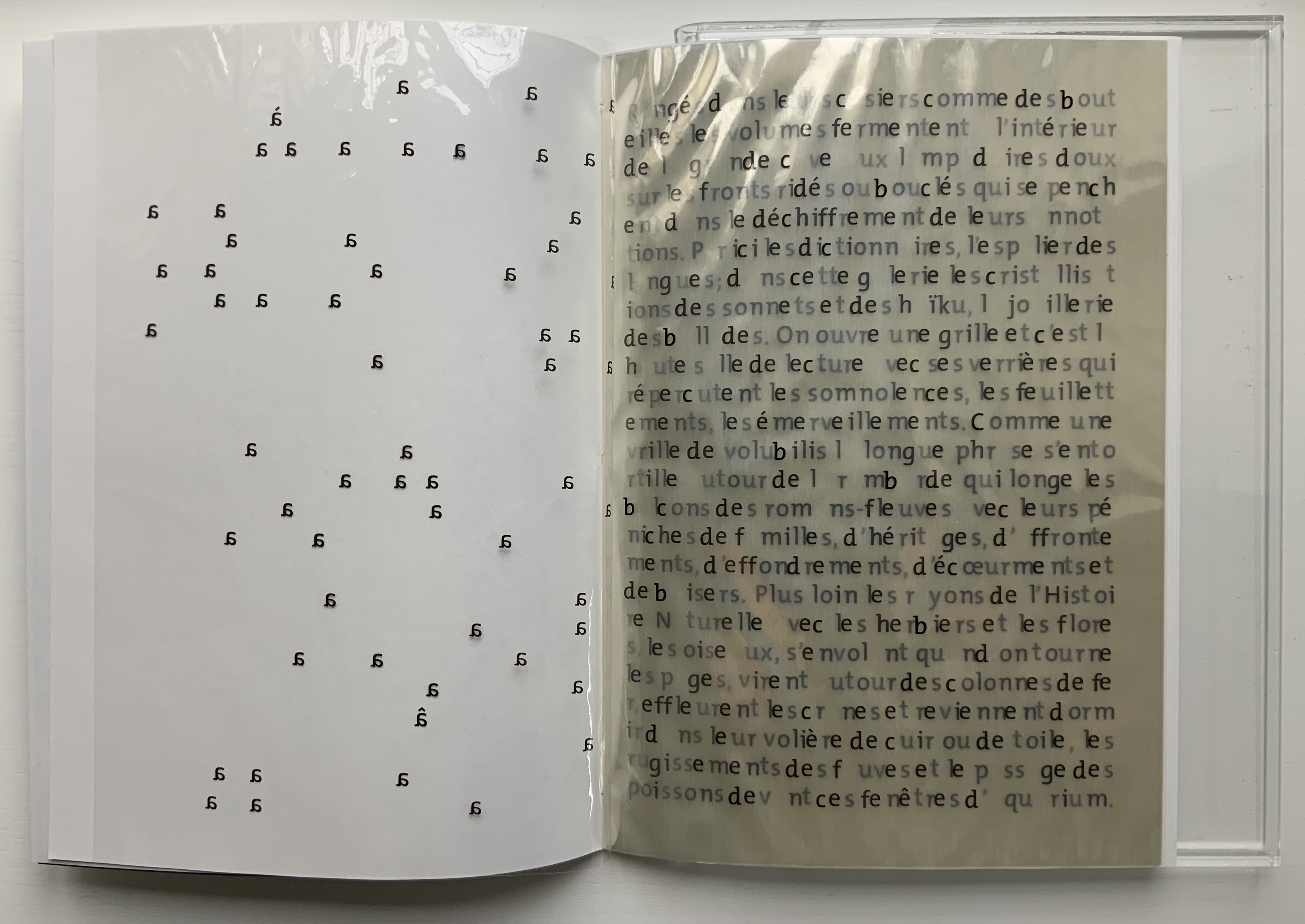 With Alpha Beta, we are reader, spectator, listener and actor. Its plexiglas slipcase must be shaken sharply to start the two thin volumes slipping out. On acetate, the first recto page presents an extract from an essay by Michel Butor describing a fantastical library. The acetate pages crinkle and mesmerize as they turn. Alphabetically, letter by letter, the transparency lifts from Butor’s text all the instances of that sans serif character into the air, falls leftward and settles onto the accumulation of clear verso pages showing the letters reversed.