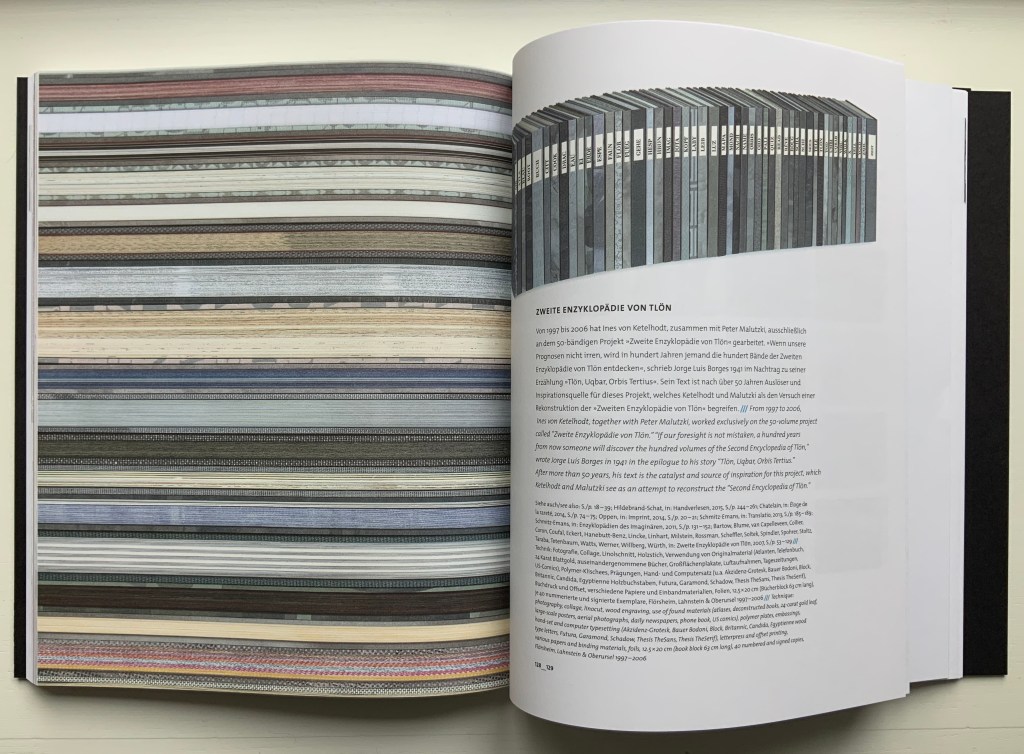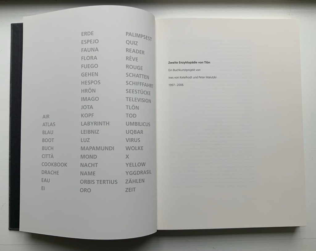 Zweite Enzyklopädie von Tlön (2007) Ines v. Ketelhodt and Peter Malutzki Catalogue casebound, thread-stitching, in printed linen-over-board cover with embossed spine title. H302 x W217 x D25 mm, 256 pages. Acquired from the artists, 21 August 2017. Photos: Books On Books Collection, displayed with permission of the artists.