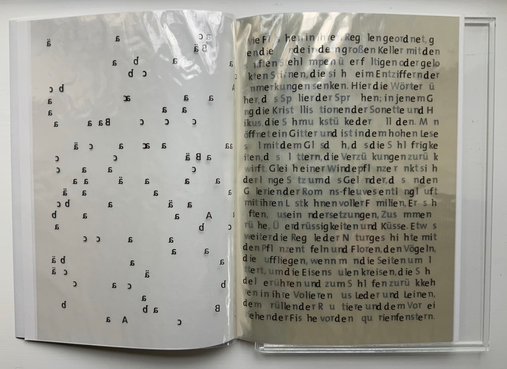 Alpha Beta (2017) Ines von Ketelhodt, text by Michel Butor Plexiglass slipcase (287 x 203 x 14 mm) containing two volumes (278 x 198 x 3 mm), 48 unnumbered pages. Edition of 35, of which this is #18. Acquired from the artist, 14 December 2020. Photos: Books On Books Collection, displayed with the artist’s permission.