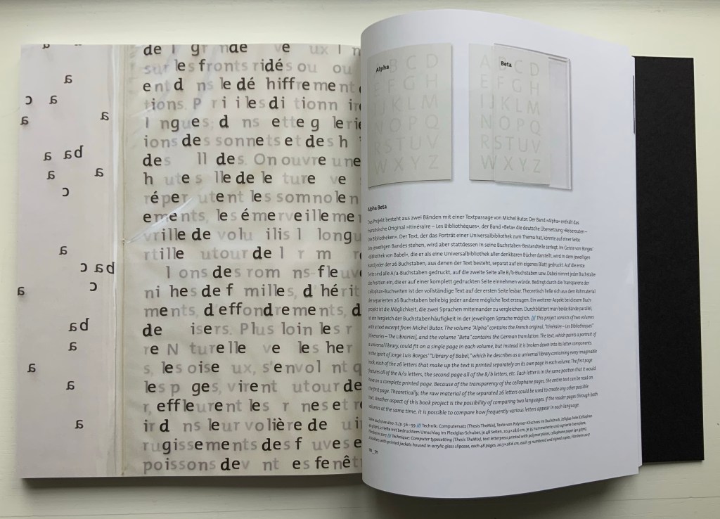 So why this particular text from Michel Butor? A bilingual market advantage was probably decisive for Campus Verlag, publisher of Butor’s volume of essays in which von Ketelhodt found the text. If a trilingual market advantage had outweighed the additional production costs for Campus Verlag, von Ketelhodt might have created Alpha Beta Gamma instead. The essay she selected from Butor is “Les bibliothèques/Die Bibliotheken” (“The libraries”), which appears in the collection’s second part: “Itinéraires à travers l’univers de Maria-Helena Vieira da Silva/Reiserouten durch das Universum von Maria-Helena Vieira da Silva” (“Itineraries through the universe of Maria-Helena Vieira da Silva”). None of Butor’s essays are about the alphabet. So, still, why this particular text?