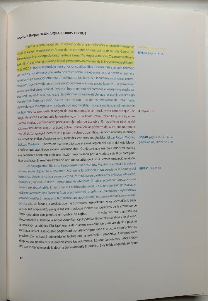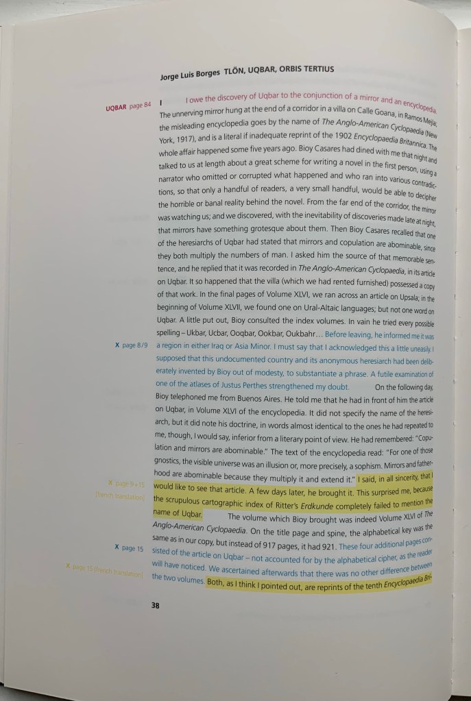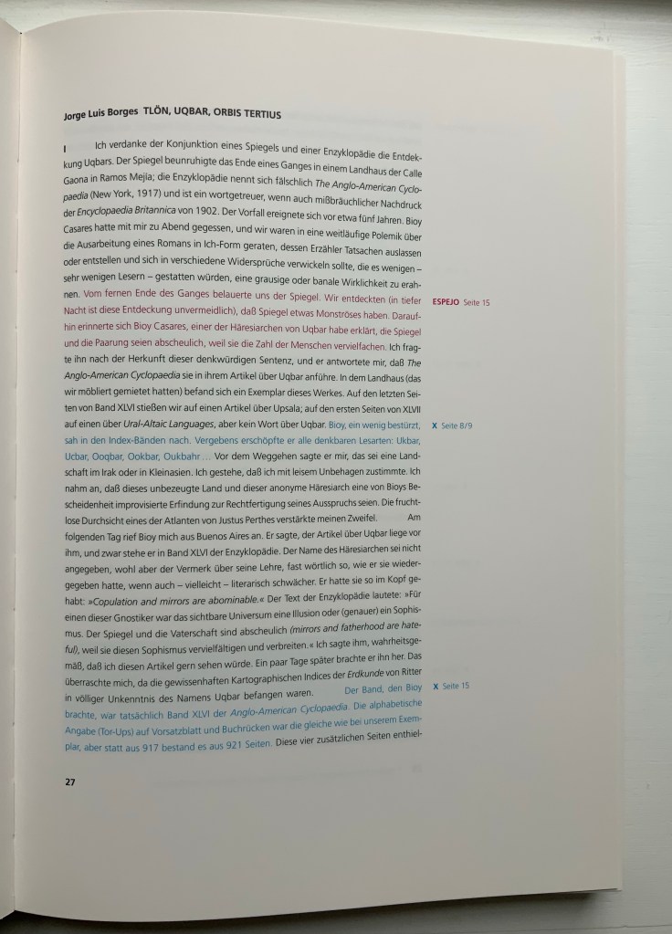 The fifty-volume work’s residence in libraries and collections around the world matters to the artists not only financially but conceptually. Only in that setting or frame does the artwork “converse” multilingually with simulacra of the Tlön library. The catalogue includes text in English, French, German and Spanish, and its own system of internal and external cross-referencing is enacted typographically and in color across Spanish, German and English in that order. After all, Borges’ short story was the origin of the work, and it is in Spanish.
