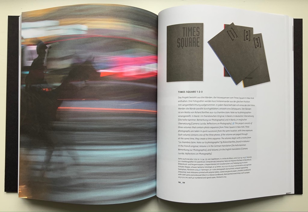 Why this multilingual materiality? Could it be the advantage of appealing to two language markets? Could it be as simple as the text’s being available in French and German? There’s no denying von Ketelhodt’s multilingual proclivity. Many of her solo works involve multiple languages, but it is how and why that count. Consider her sequential photographic work Times Square 1-2-3 (2014). In it, she uses a quotation from Roland Barthes’ Camera Lucida: Reflections on Photography in its French original for volume 1, German for volume 2, and English for volume 3. Von Ketelhodt took three photos in quick succession, with time exposure, from the same spot in Times Square. She then split the photos across the three volumes. To see the sequence, we have to look across the three volumes. By virtue of its focus on the effects of photography on the spectator and its availability in three languages, Camera Lucida was the ideal source from which to draw a quotation as inspiration and compositional material for Times Square 1-2-3.