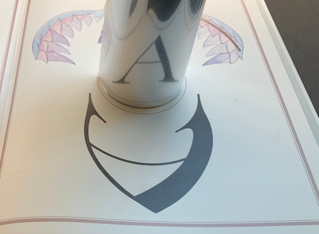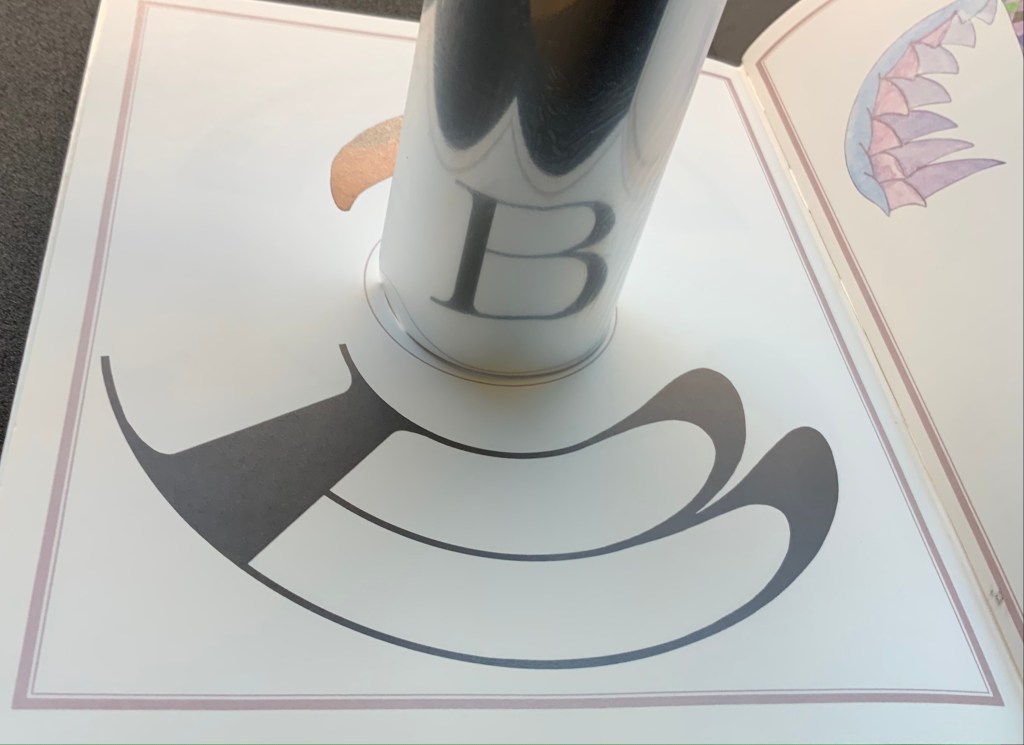 The usual presentation of letter and animal image undergoes a transformation that requires the reader/viewer to move around the book (or turn the book, best aided with a Lazy Susan) to see the anamorphic letter and animal transform into their more easily recognizable shapes.