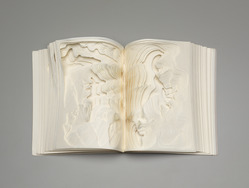 At 104 leaves, this was one of the larger works in the exhibition. The three small black-and-white images of double-page spreads in the catalogue do not do the work justice, nor does the one in The Cutting Edge of Reading by Renée Riese Hubert and Judd D. Hubert. With the latter, however, we have this bit of description to aid in visualising the work: