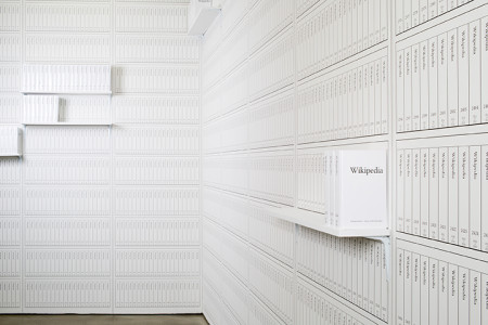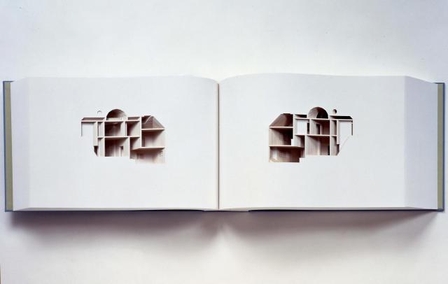 The catalogue also teases with its title and design by suggesting that once books have been placed on display like this, the setting is no longer a library but a “white cube gallery“. As the catalogue progresses, black-and-white photos of items from the exhibition appear on the verso page in frames that appear to be hanging on the trompe l’oeil cube’s rear wall.