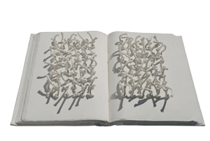 While Abt’s introductory essay rings the historical changes on the roots of book art — once there was Mallarmé’s Un Coup de Dés, but before Mallarmé, there was William Blake — the works included and the catalogue’s design ring some chimes of their own about book art. One way or another, all book art self-consciously draws attention to some particularly bookish element. For the most part, the 49 works listed in the catalogue ring true. The catalogue design itself, however, chimes not only to that notion of self-reflexiveness but also to wider notions about the nature of book art within contemporary art.
