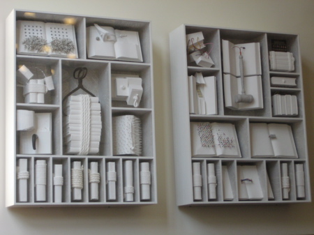 Kid leather gloves, hand made paper, housing a collection of utilitarian antiques and collectibles from the mid to late 20th century.