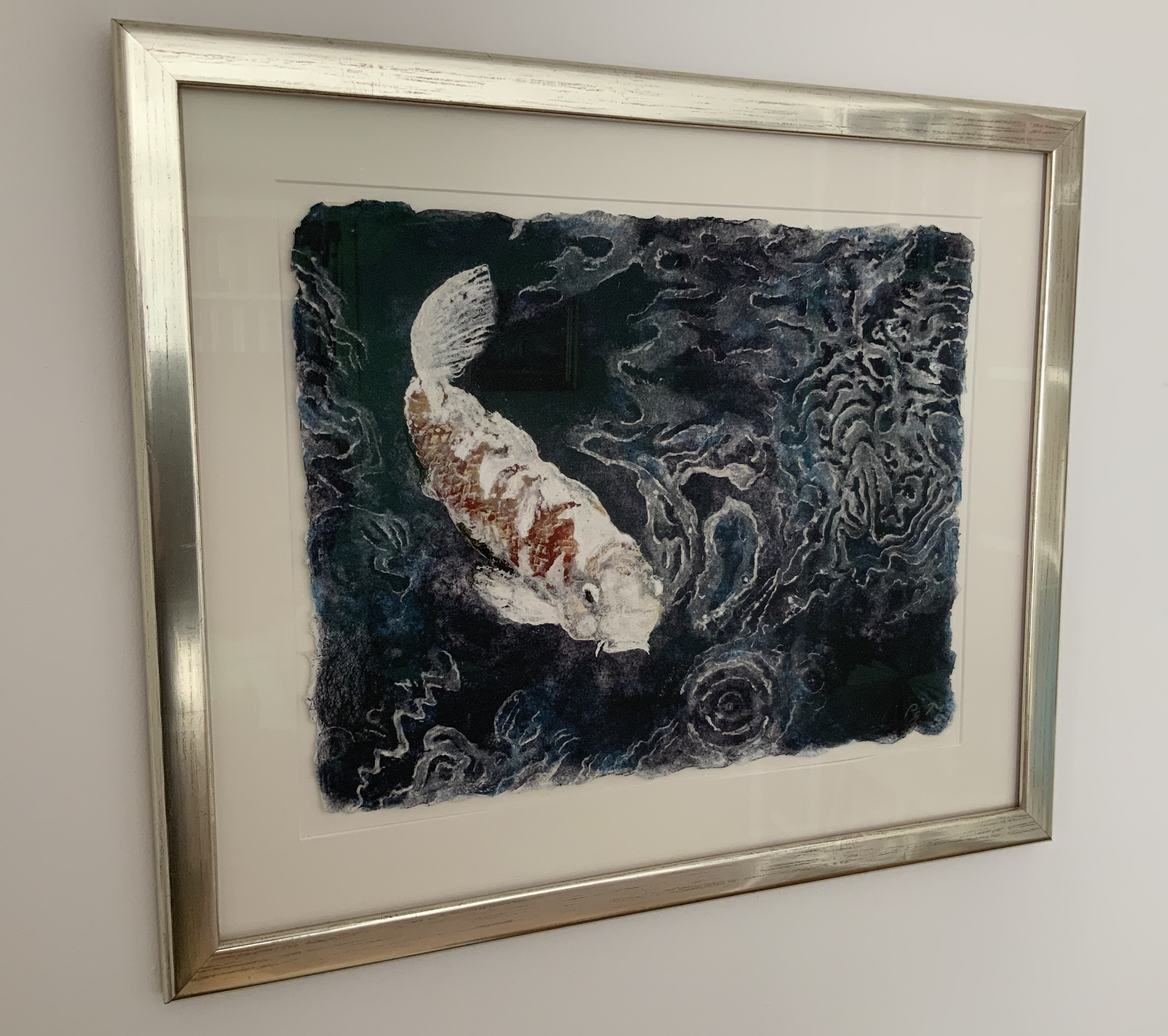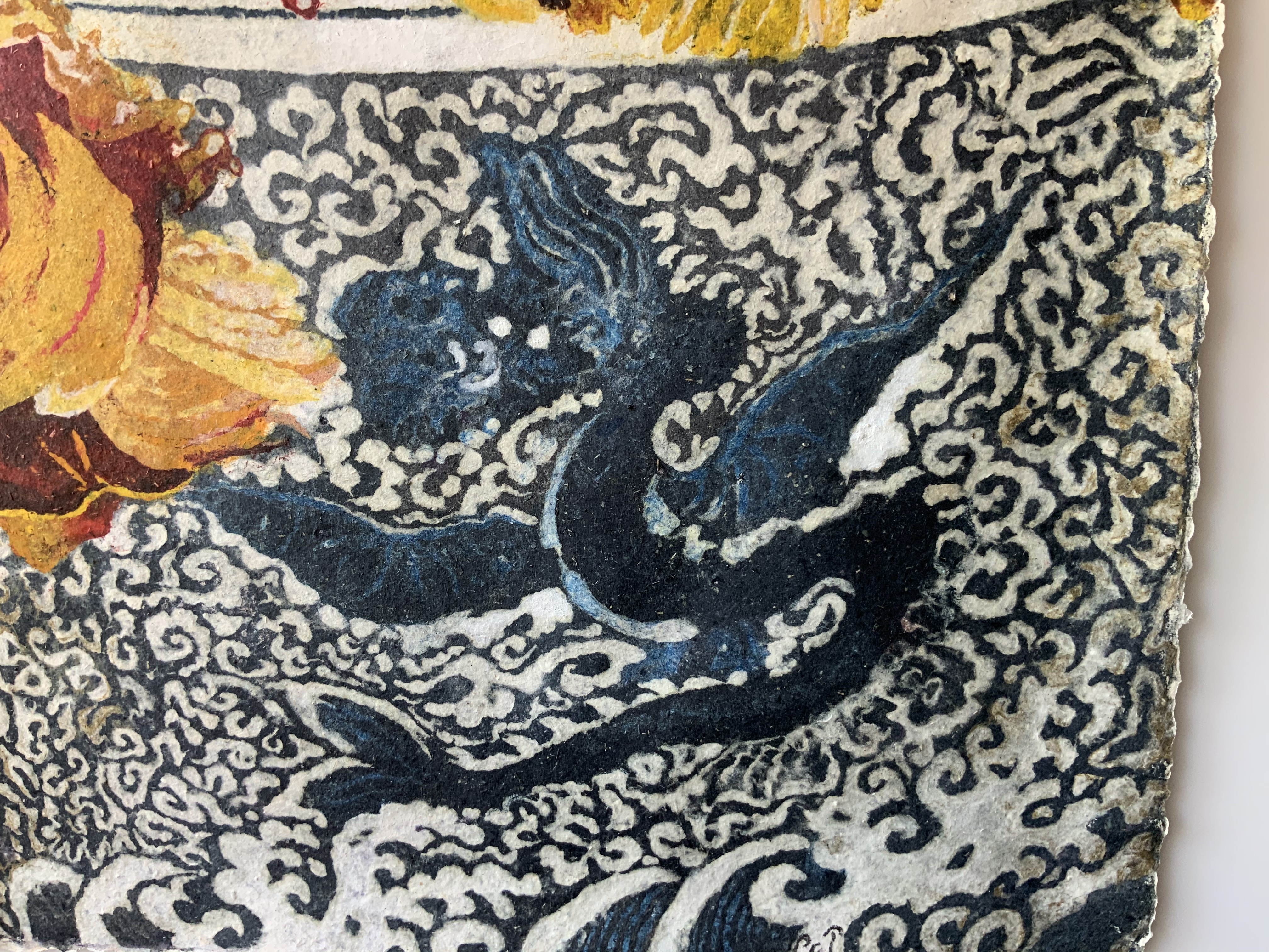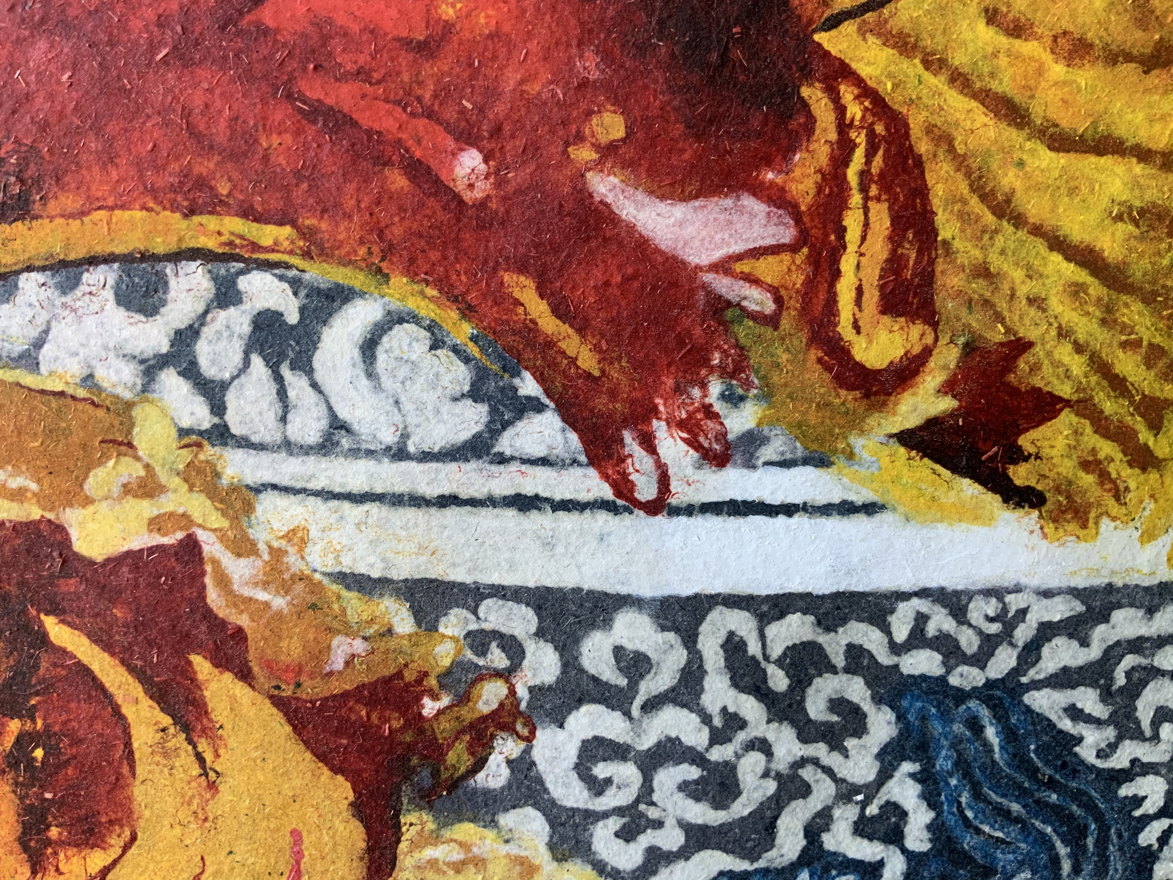 The next two papers demonstrate the curator’s attraction to painterly surfaces. Silkscreen printed by hand with a lacquer-like ink, the Red and Blue Dragonfly Pattern Japanese Lacquered Yuzen Paper (140 gsm, 330 x 485 m) has the depth, texture and glow Japanese lacquer ware, which the first three images attempt to convey. The painting base consists of kozo and wood sulfite. The sheet of paste paper (230 x 305 mm) in the last image comes from the late Louise Lawrence (Larry Lou) Foster. It has an op-art feel to it. More of her unique papers painted with pigmented paste can be found in the limited-edition book The Paste Papers of Louise Lawrence Foster and in the Metropolitan Museum’s Thomas J. Watson Paper Legacy Project.