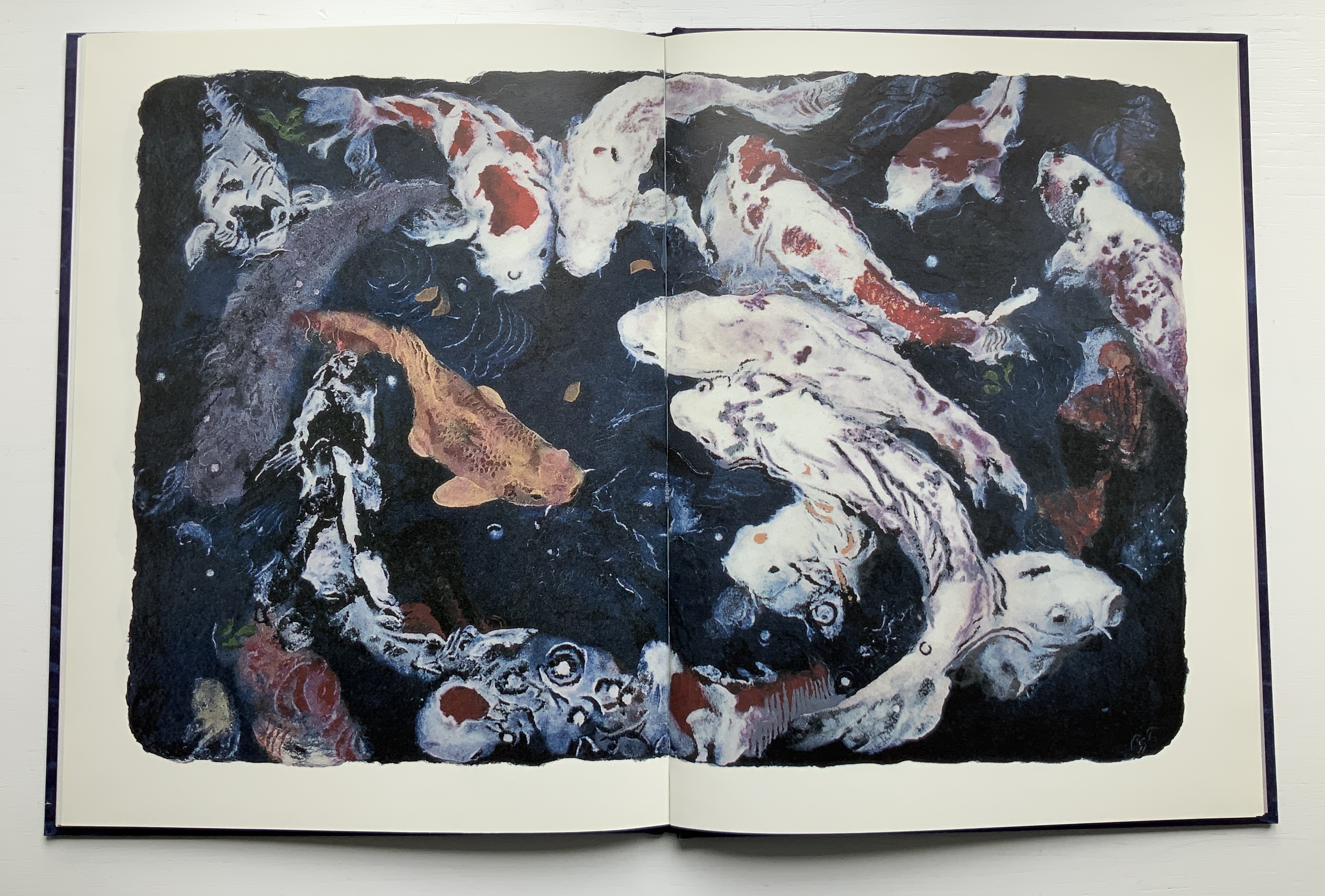 Images of tools — whether for preparing flax or for making the products from it — also recur on the inside of the front and back covers and throughout the book. The human figures alongside the tools, however, appear engaged in more than manufacturing. Elsewhere in the book, they dance, they sit and meditate or write, they row on ponds beside the growing flax. The fairy tale, too, has these Romantic juxtapositions of nature, art and craft. So, again, the spirit of Andersen’s tale finds another way into Tau blau / Dew Blue.