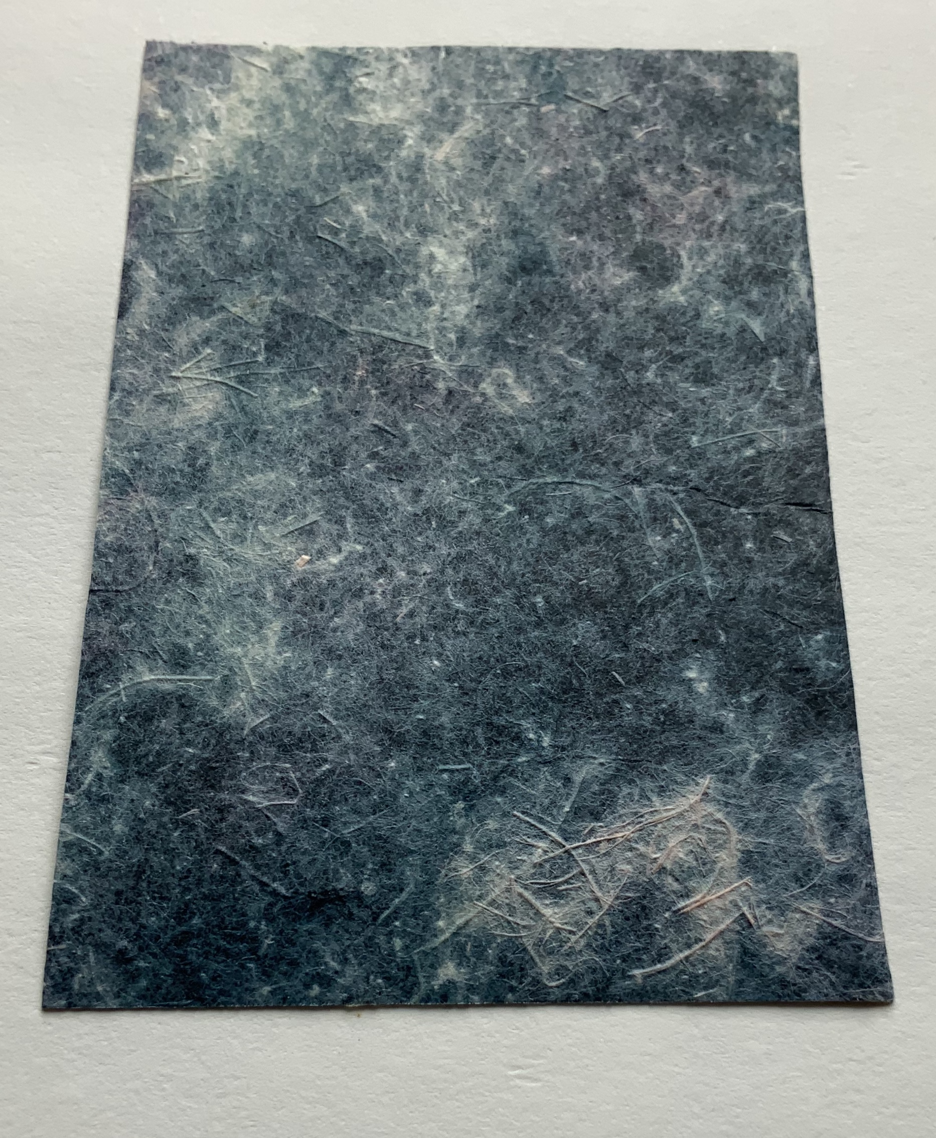 Like Shibori, this paper below is thin or tissue washi that has been folded and dyed. The dark, irregular lines where the dye has accumulated in the folds create a sharp contrast with the translucence of the laid lines and chain lines imprinted by the mesh in the papermaking frame.