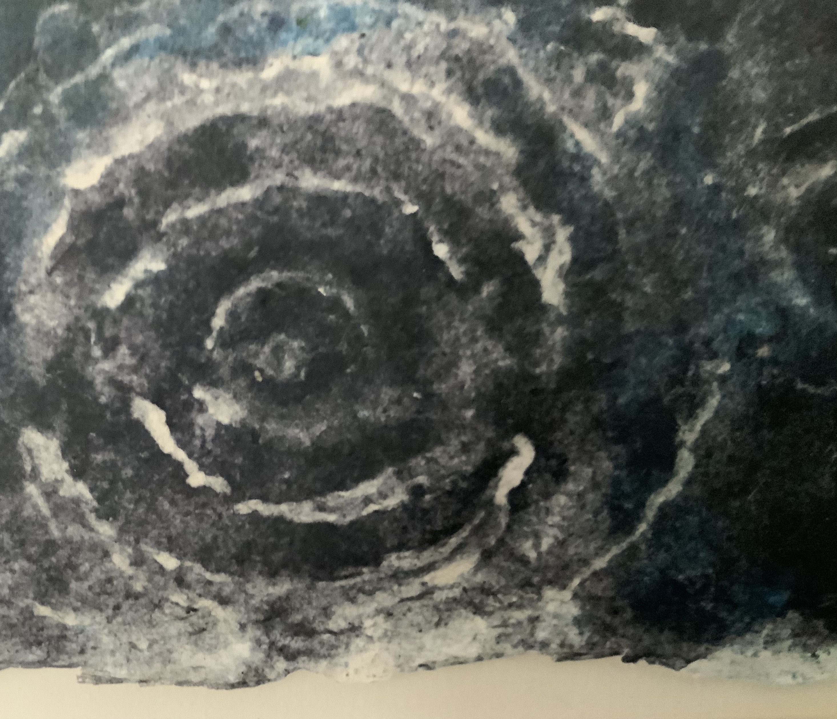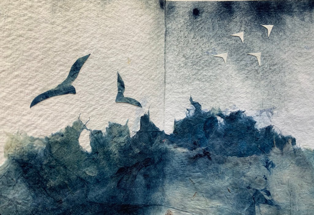 Madeleine Durham’s paste paper is also part of the Watson Library Digital Collection. In her artist’s statement, she refers to samples “representative of my landscape artwork”. With the sample that follows, dunescapes and seascapes come to mind.