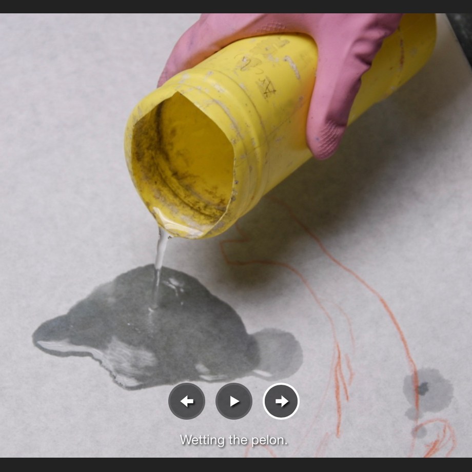 Like Minoru Fujimori above, Iris Nevins is a cultural treasure. Specializing in the reproduction of early marbled papers, she has delved into its past prior to the advent of marbling machines during the Victorian era and creates her “own marbling colors using, where possible, the same pigments used during the period”. On what shelves and in what crusty containers do such pigments reside?