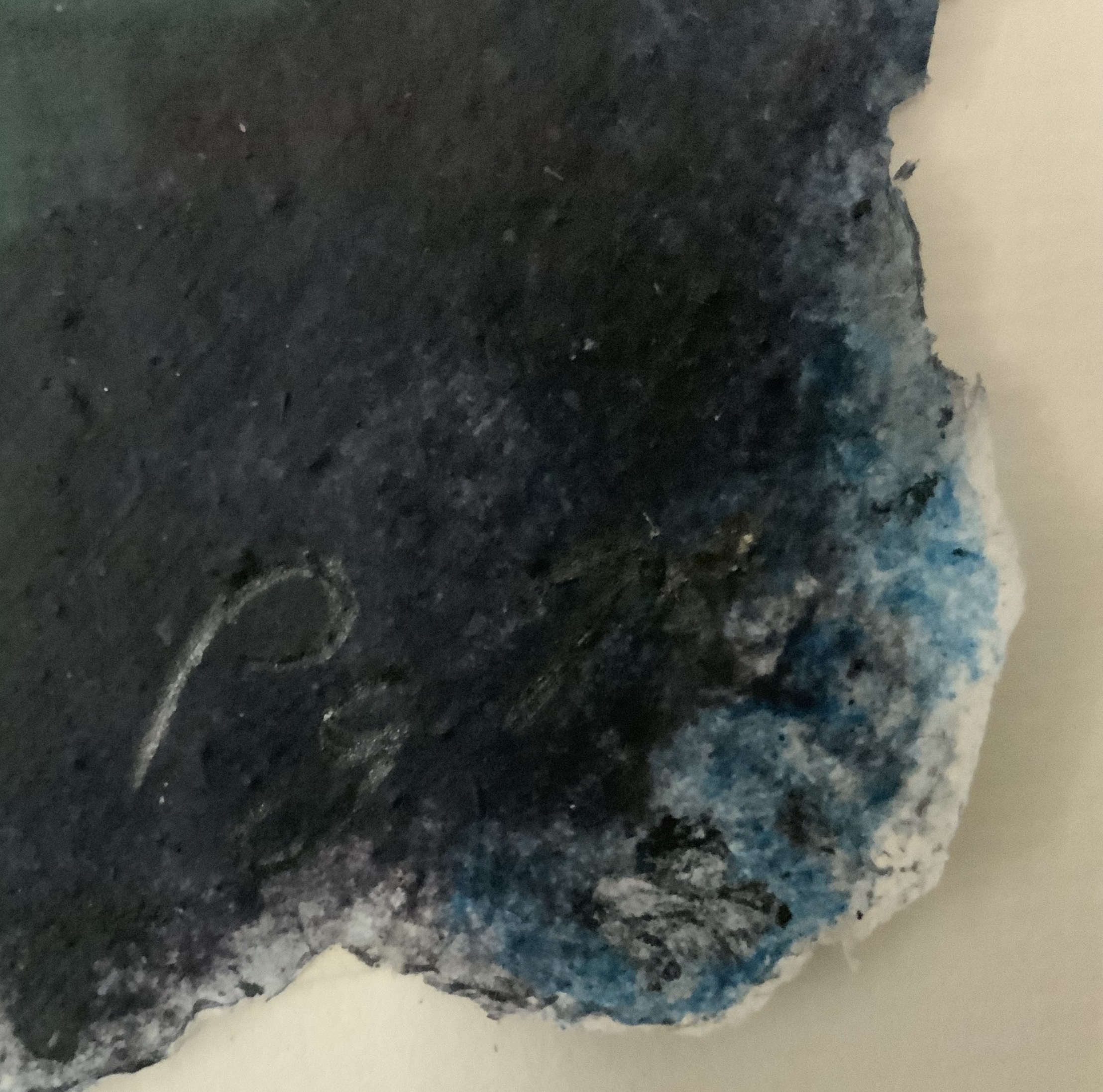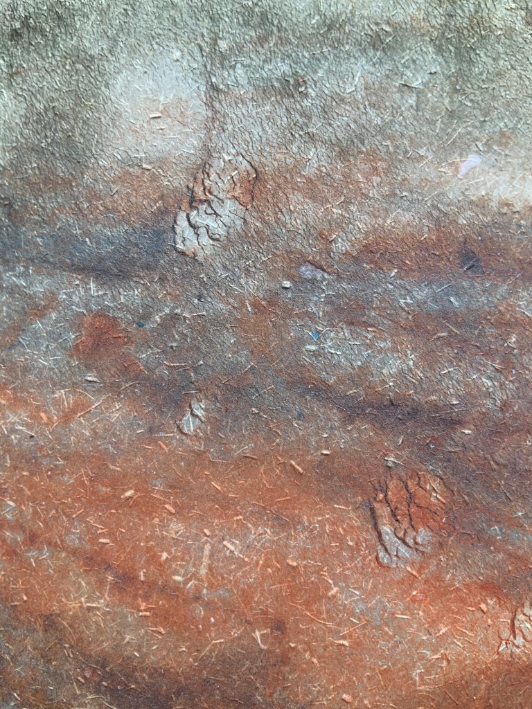 A blend of abaca fibers and cotton rag, Bistre Mixed Media (150 gsm, 280 x 360 mm) from Kelsey Pike’s Sustainable Papercraft in Kansas City, Kansas, is at once hard, resilient, durable, bulky, thick and soft. The images below attempt to show the sheet’s homogeneous surface and smooth, fine grain texture, intended as the name suggests for all fine art media – pencils, charcoal, conte, pastel, acrylic, watercolor, ink, gouache, etc.