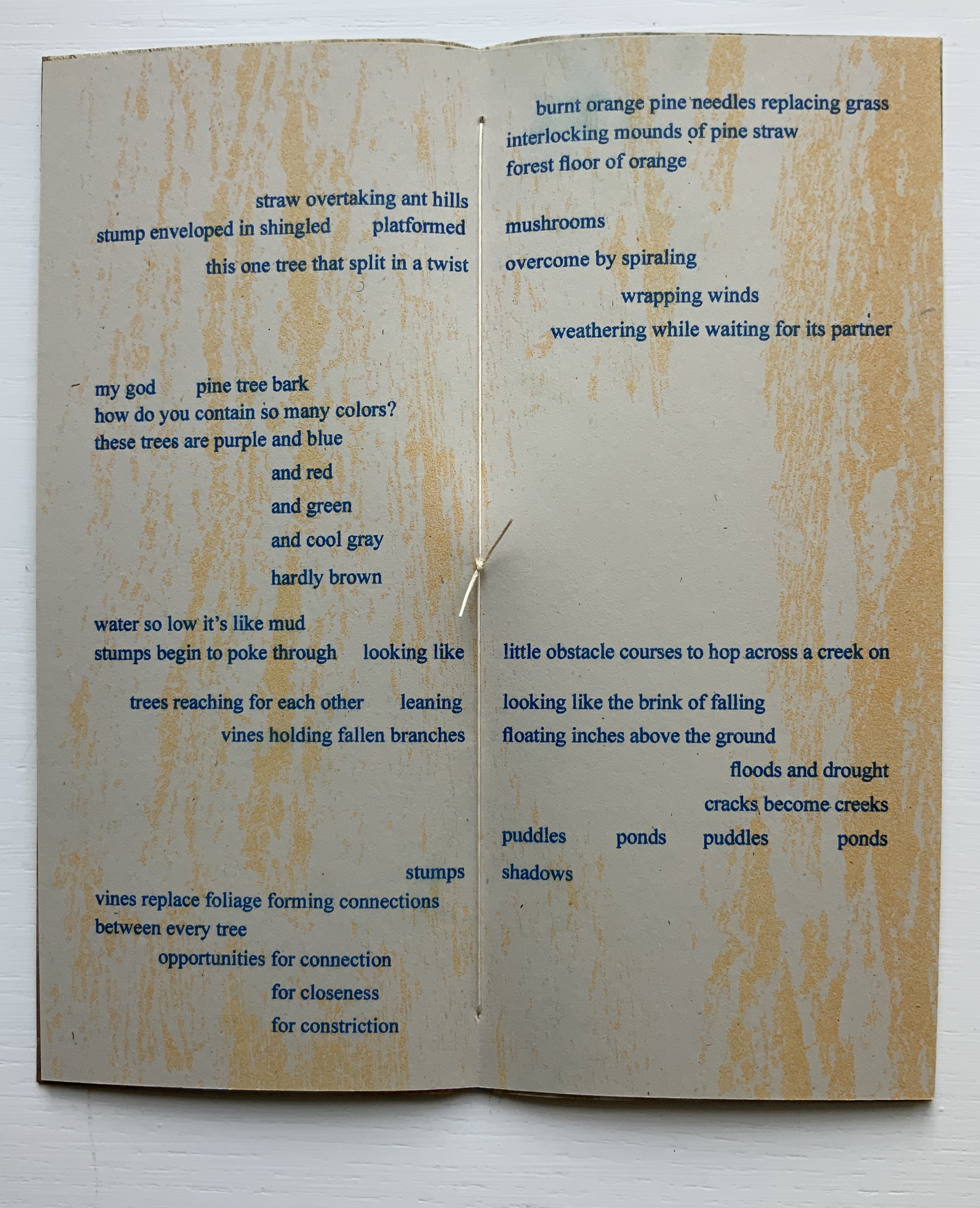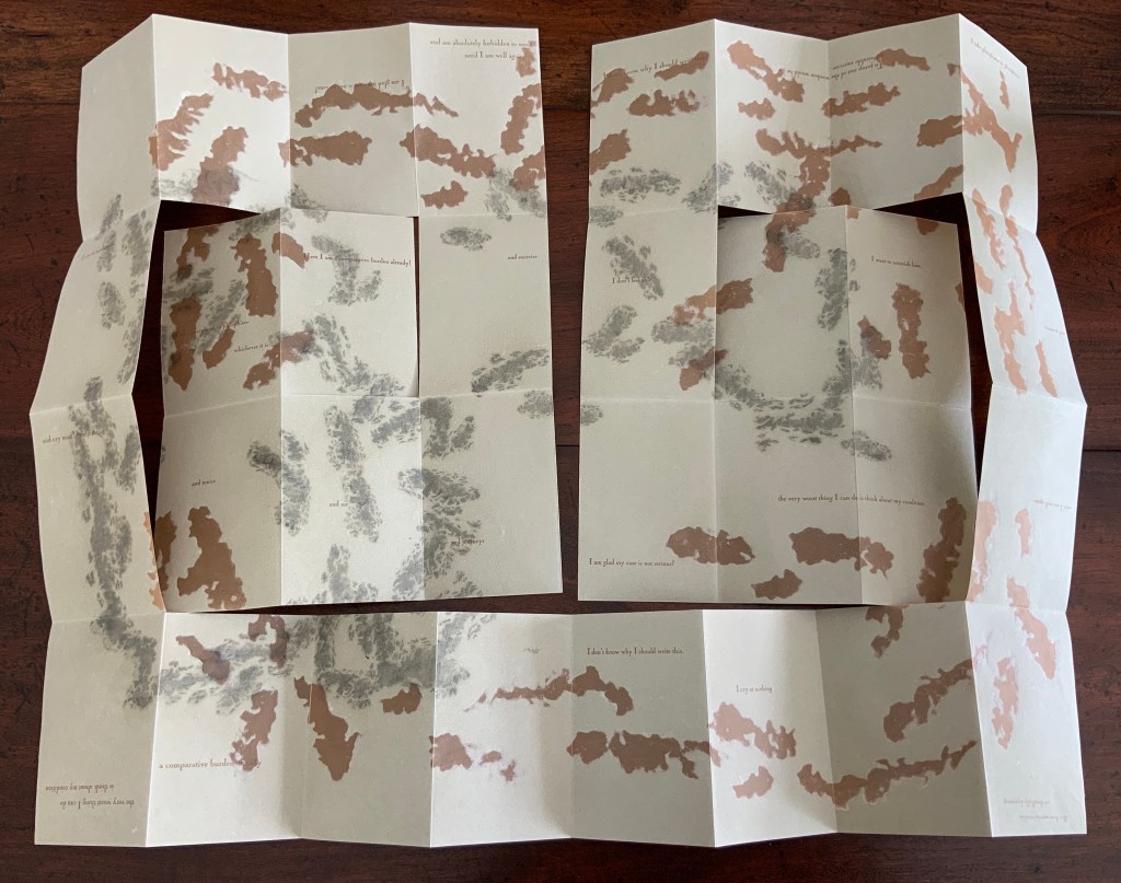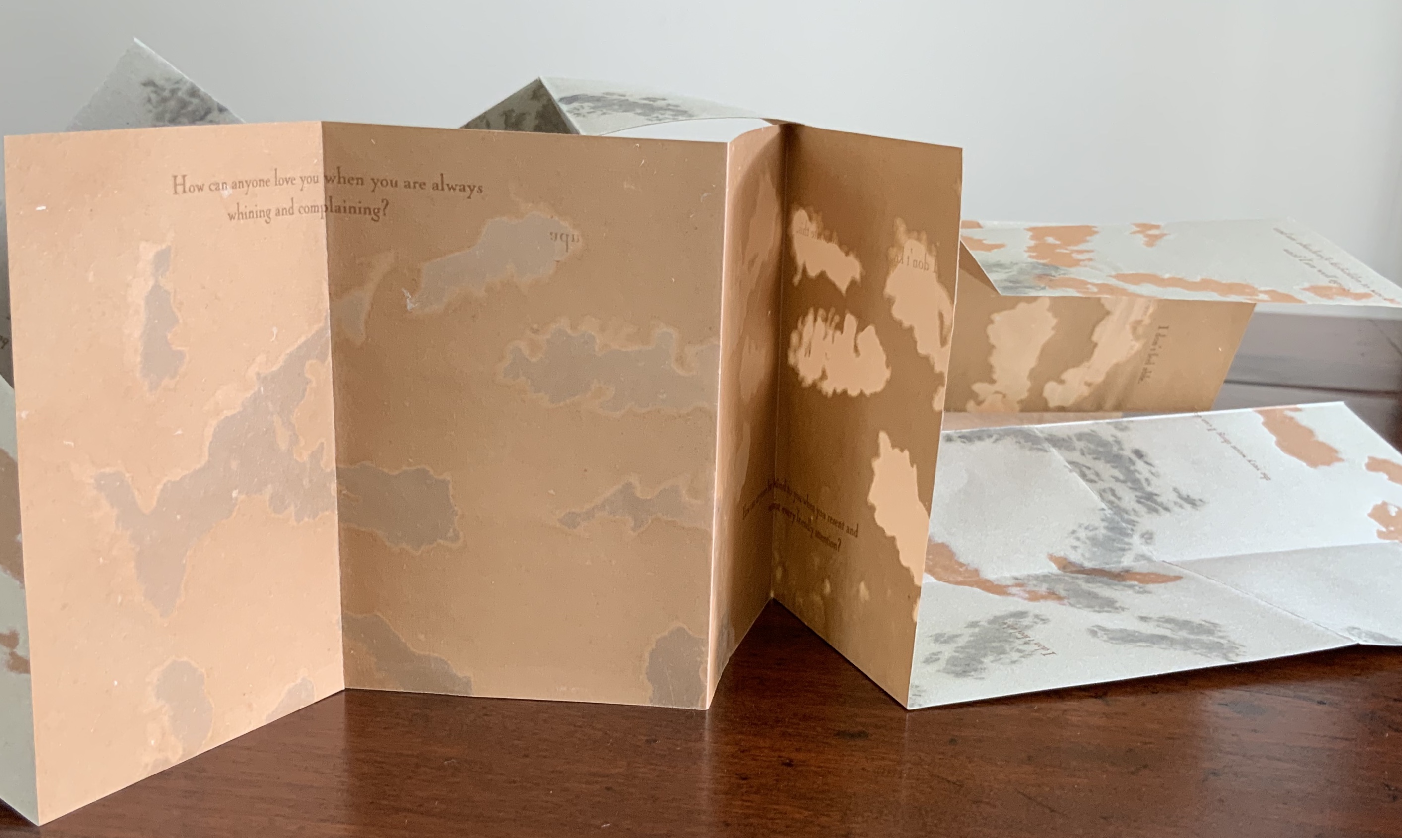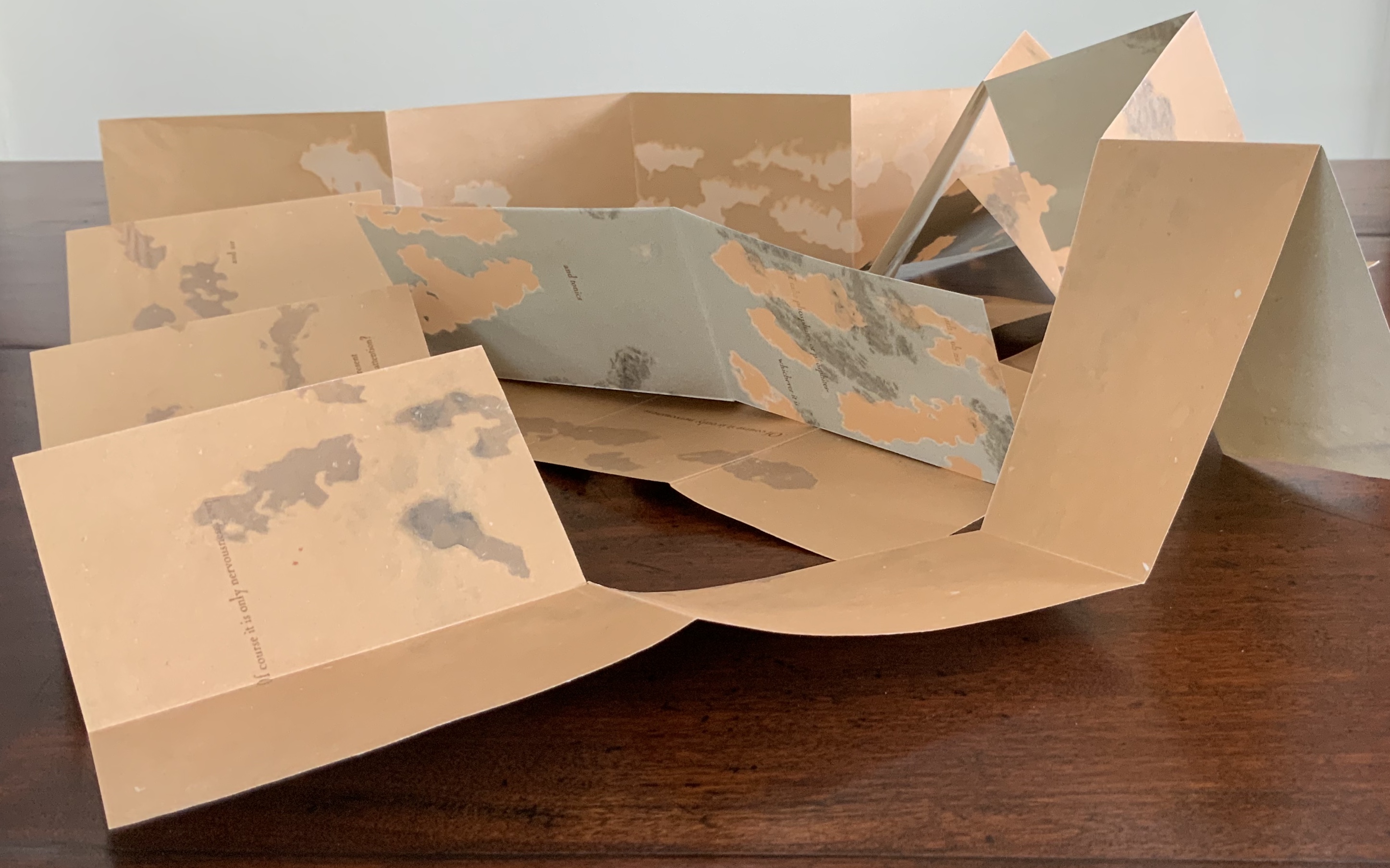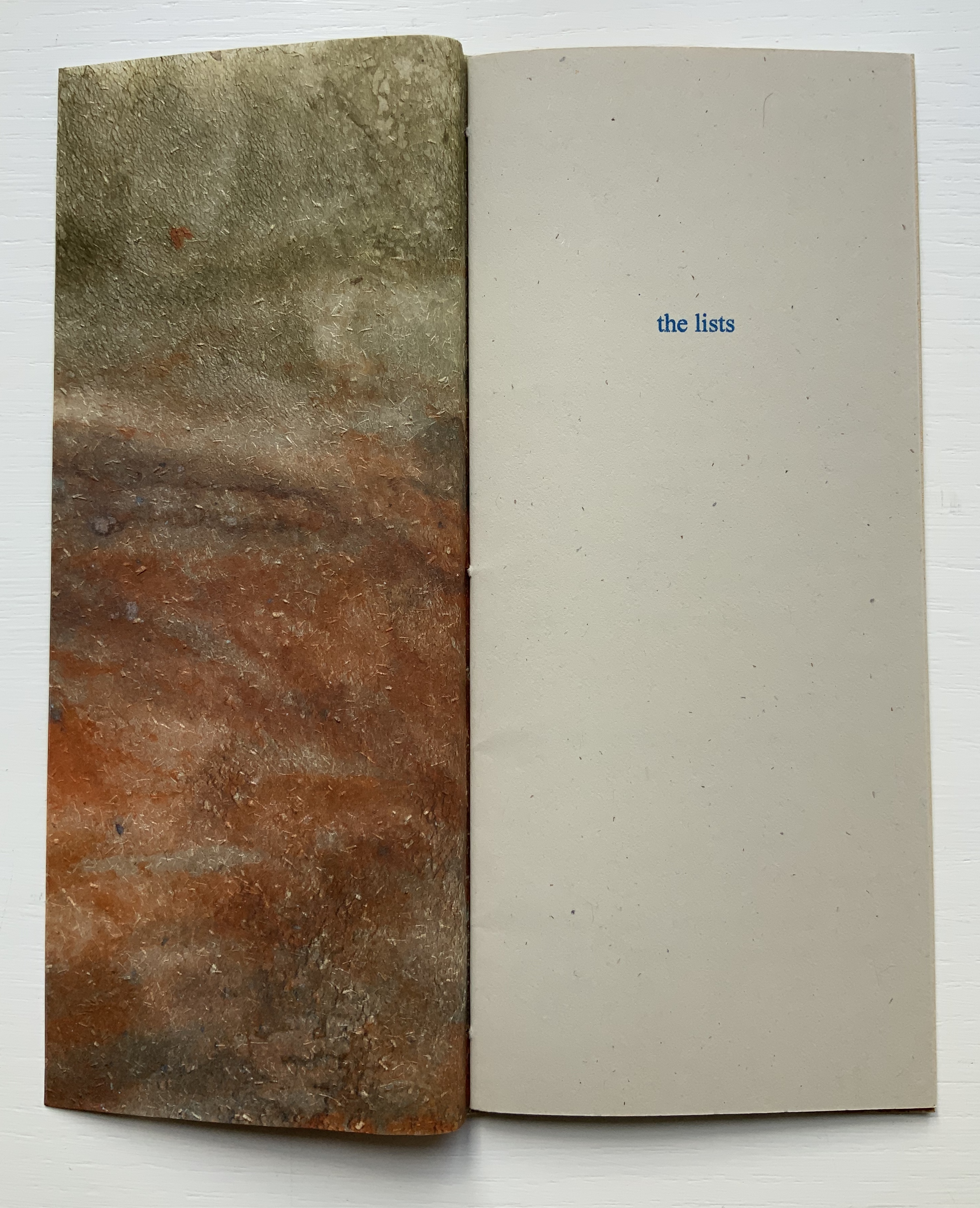 To organize and weave her motives together, Beisinghoff uses an accordion spine to whose peaks eleven sets of folios are sewn with linen thread. Three of the eleven are 4-page folios consisting of blue handmade paper. Another three 4-page folios consist of pure flax paper (handmade by John Gerard). The remaining five gatherings have 8-page folios, each consisting of a pure flax paper folio around a blue or plain one.
