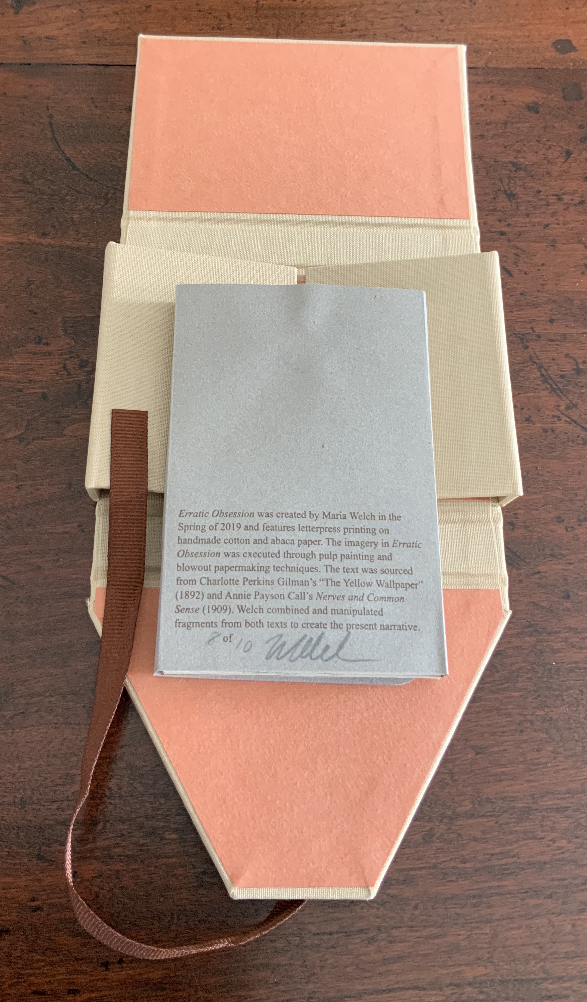 Catalogues like this are works of art about works of art. It came about as a result of an exhibition held at the Kalamazoo Book Arts Center and the Waldo Emerson Library at Western Michigan University. The catalogue contains an illustrated chronology of the artist’s art and career up to 2015-16. Not only does it contain that work of string art in its center, its cover is hand bound and features a pulp stenciled handmade paper.