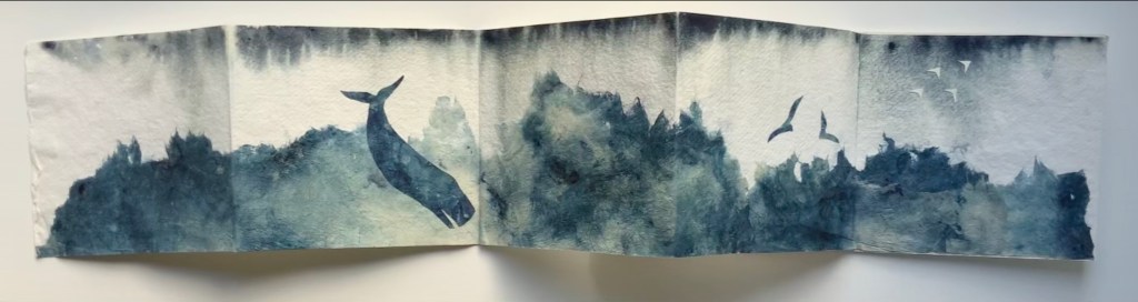 Below is the final folio of the work. Like the first, it is made completely of flax paper, but its center spread offers a fuller image: flax blossoms and stalks float in the foreground, and in the background is a sketch of Beisinghoff’s residence where she grows her flax. Like the Fibonacci spiral on the front and back covers, the first and last flax folios round out the work. But go back and listen for the hidden sound installations accompanying Dew Blue. Noticing Beisinghoff’s abstract musical notation, indulge yourself with recordings of a Swedish folk song (“Today is supposed to be the big flax harvest” here or here) to which the notation and phrases allude, and as the flax papers turn and wave on their accordion peaks, listen carefully for their musical rustle.