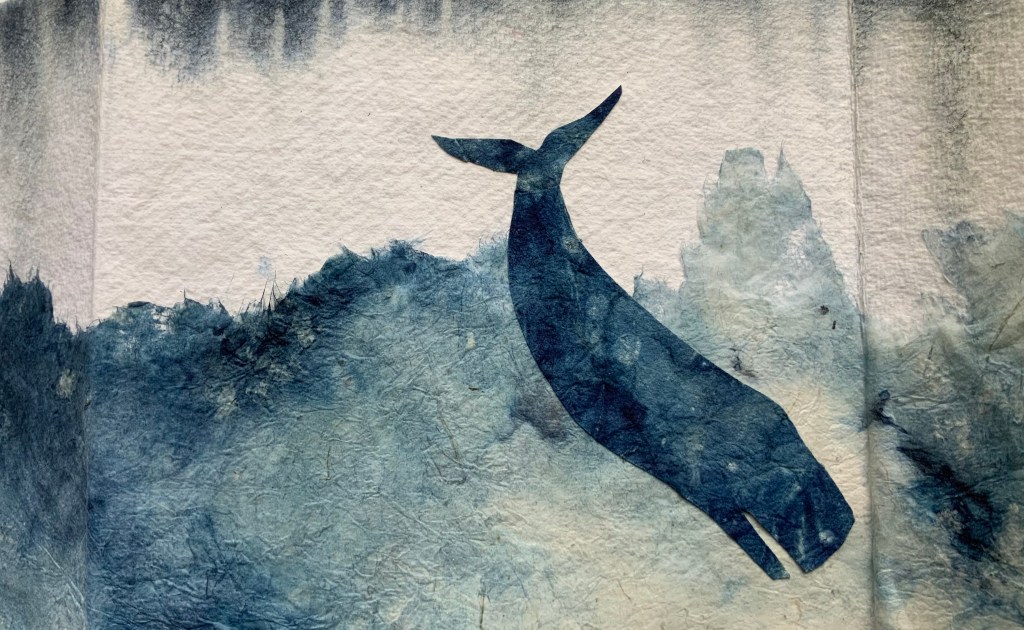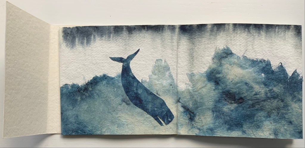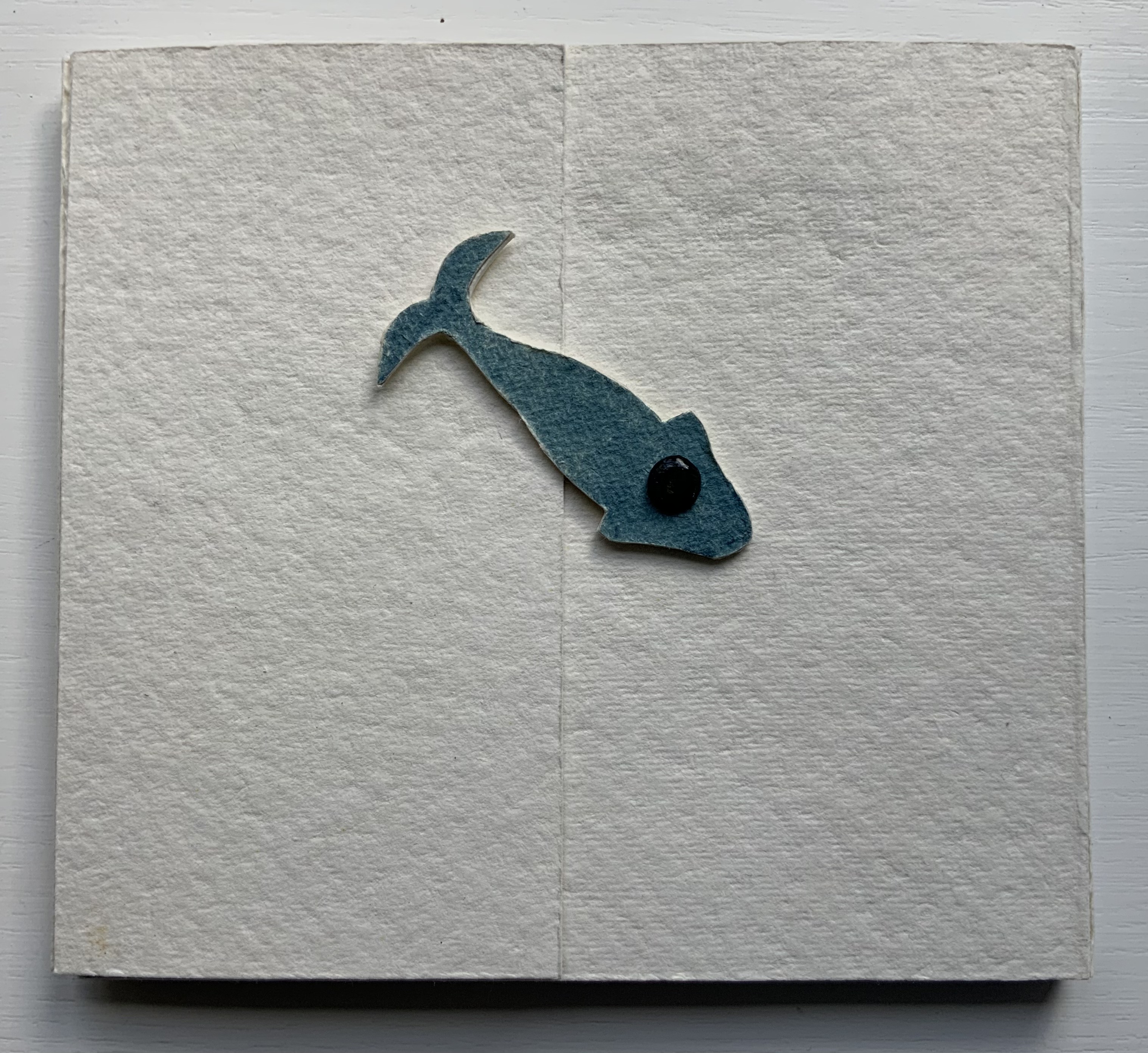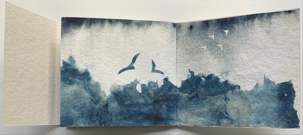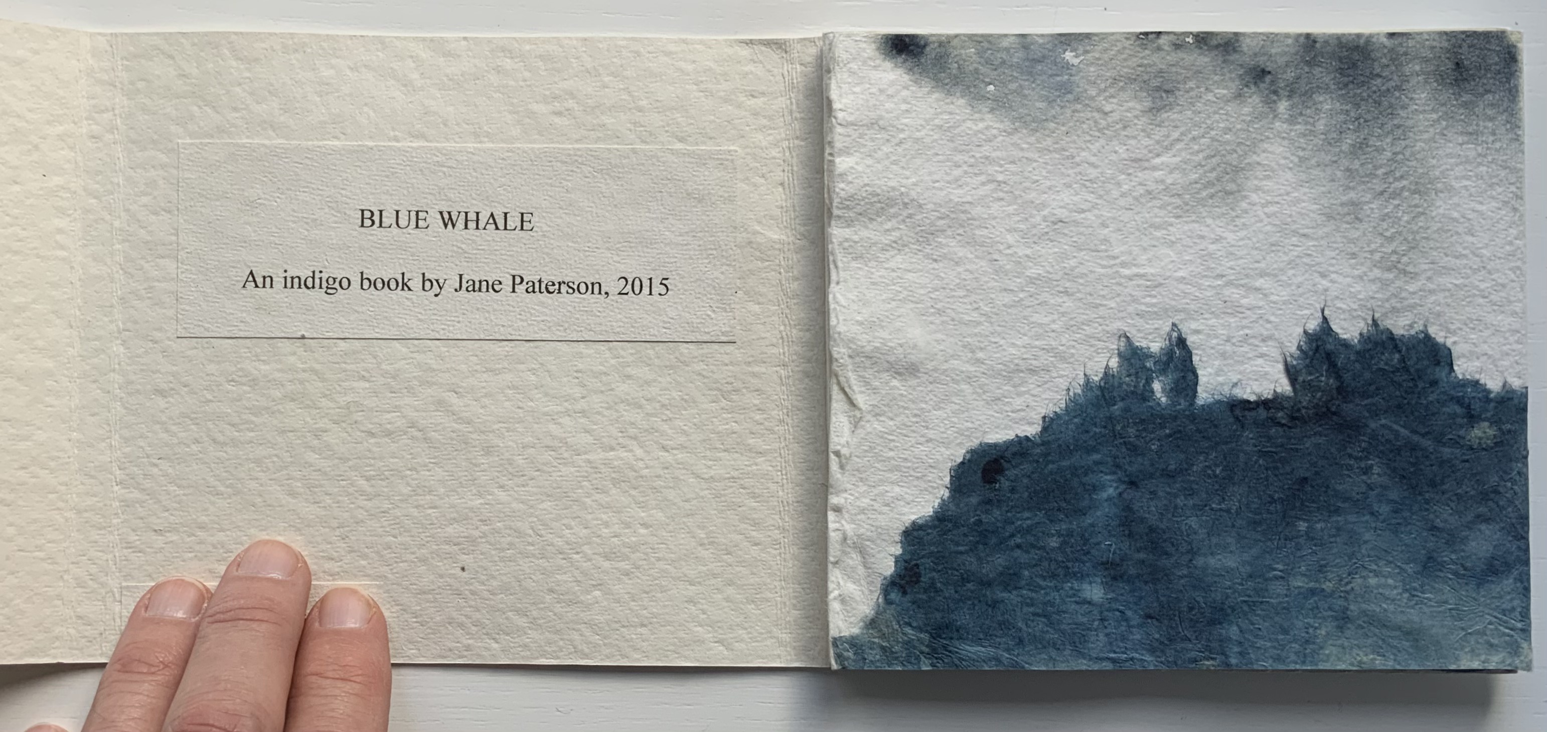 Dew Blue title page and etching, loop of flax fibers, first page of blue handmade paper folio; note its boating image repeated from the prior center spread.