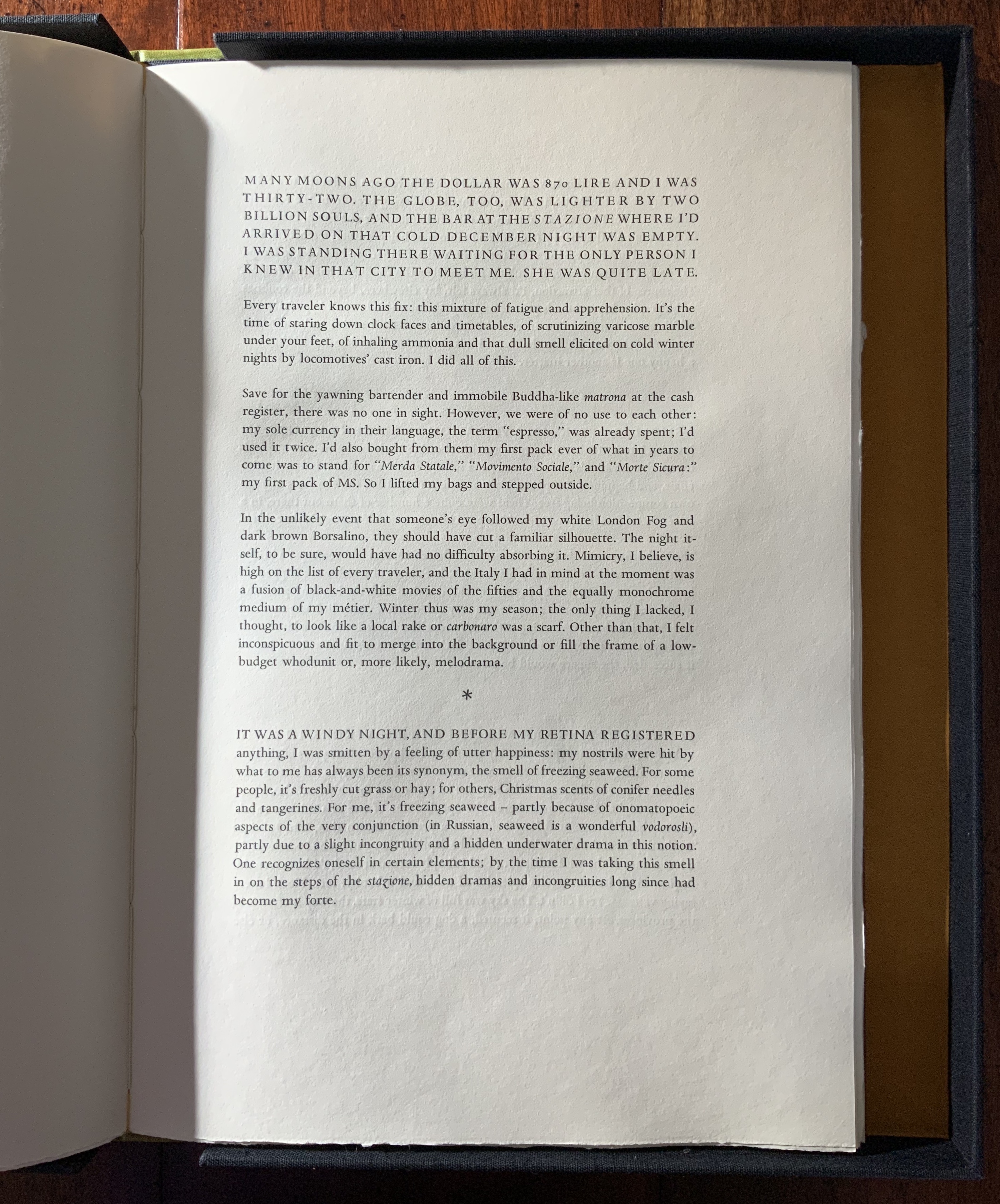 The text was set in Monotype Dante types cast in lead at the Olivieri Typefoundry in Milano. Once the printing at the Scuola Internazionale di Grafica Venezia was completed, the sheets were shipped to Koch’s studio in Berkeley where the book was bound in richly pigmented papers made by hand at Cave Papers in Minneapolis, MN.