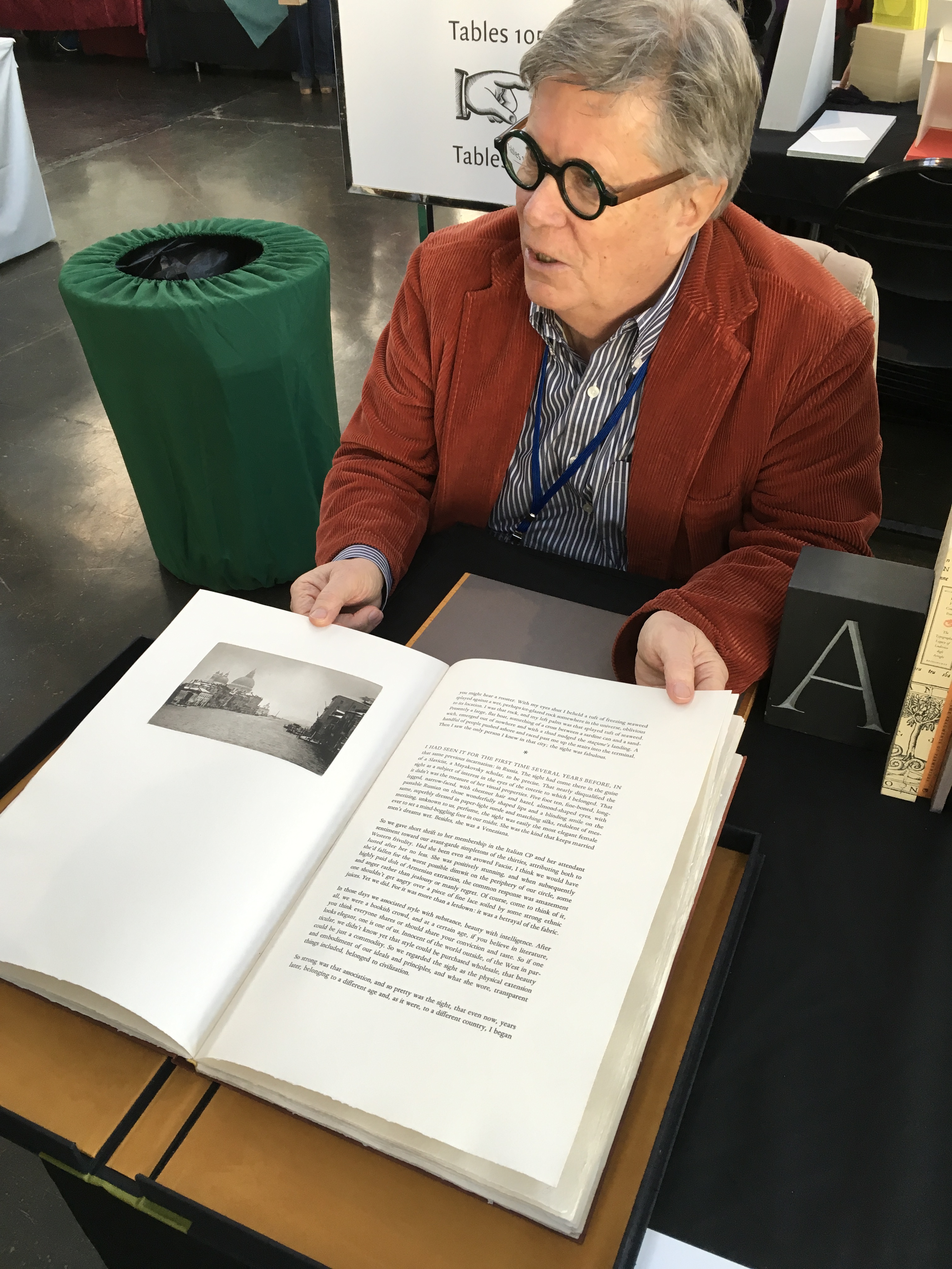 The bus from the symposium in Berkeley to the fair itself in Richmond is another chance for chance to play its role. One day I’m sitting next to Amanda Degener (Cave Paper), who delights in our common acquaintance with Ioana Stoian and Eric Gjerde; the next, it’s Jeanne Drewes (Library of Congress), who introduces me to Mark Dimunation (Library of Congress), who regales us and the collector Duke Collier with tales of the British artist Ken Campbell. But the terrible thing about chance is that it takes up so much time and, at the same time, shows you what you wish you had more time for.