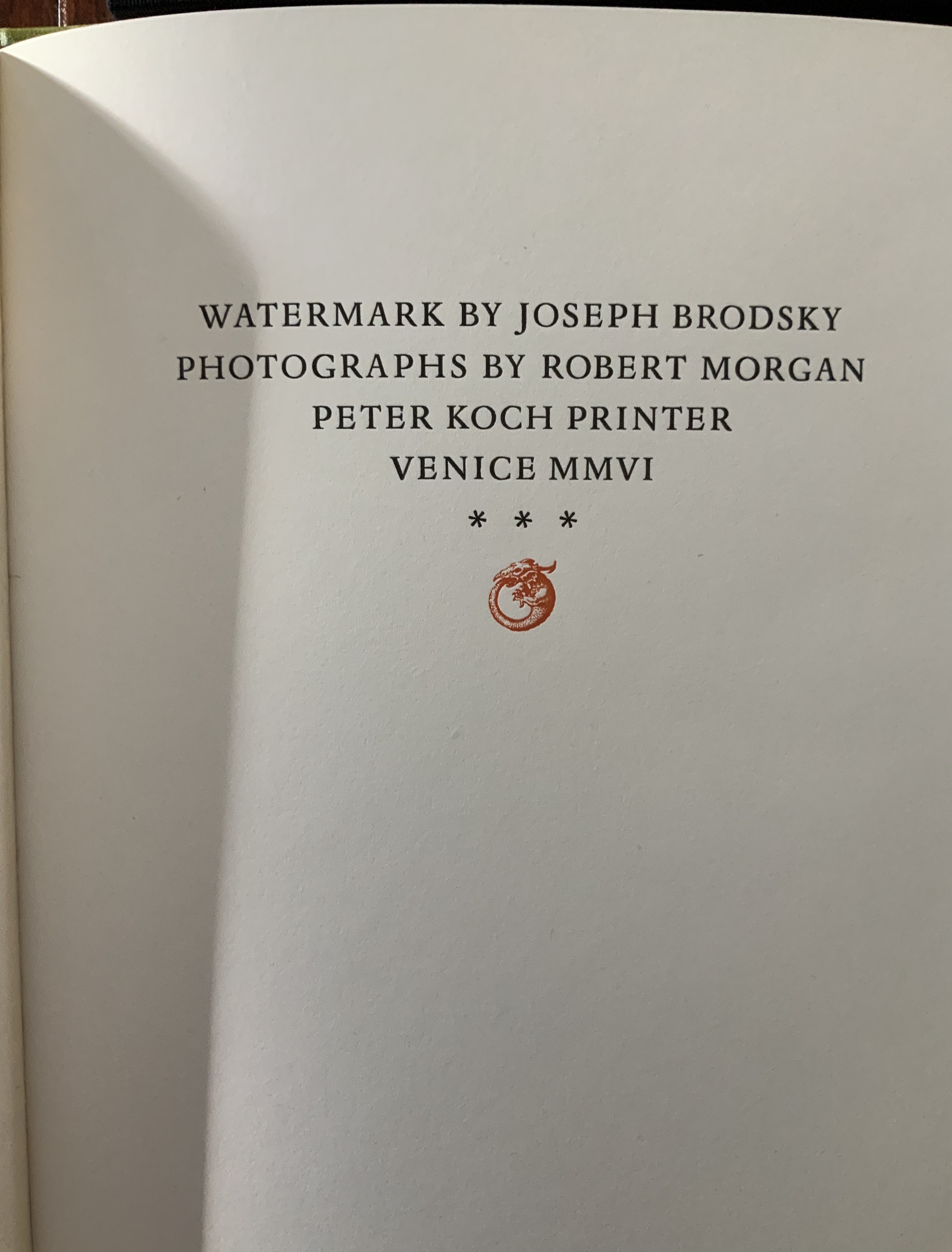 Joseph Brodsky dedicated Watermark to his friend the American painter, Robert Morgan who has lived in Venice for more than 30 years. Koch celebrates Brodsky’s evocative text with this artist’s book, illustrated with 14 photogravures made from Morgan’s original photographs.