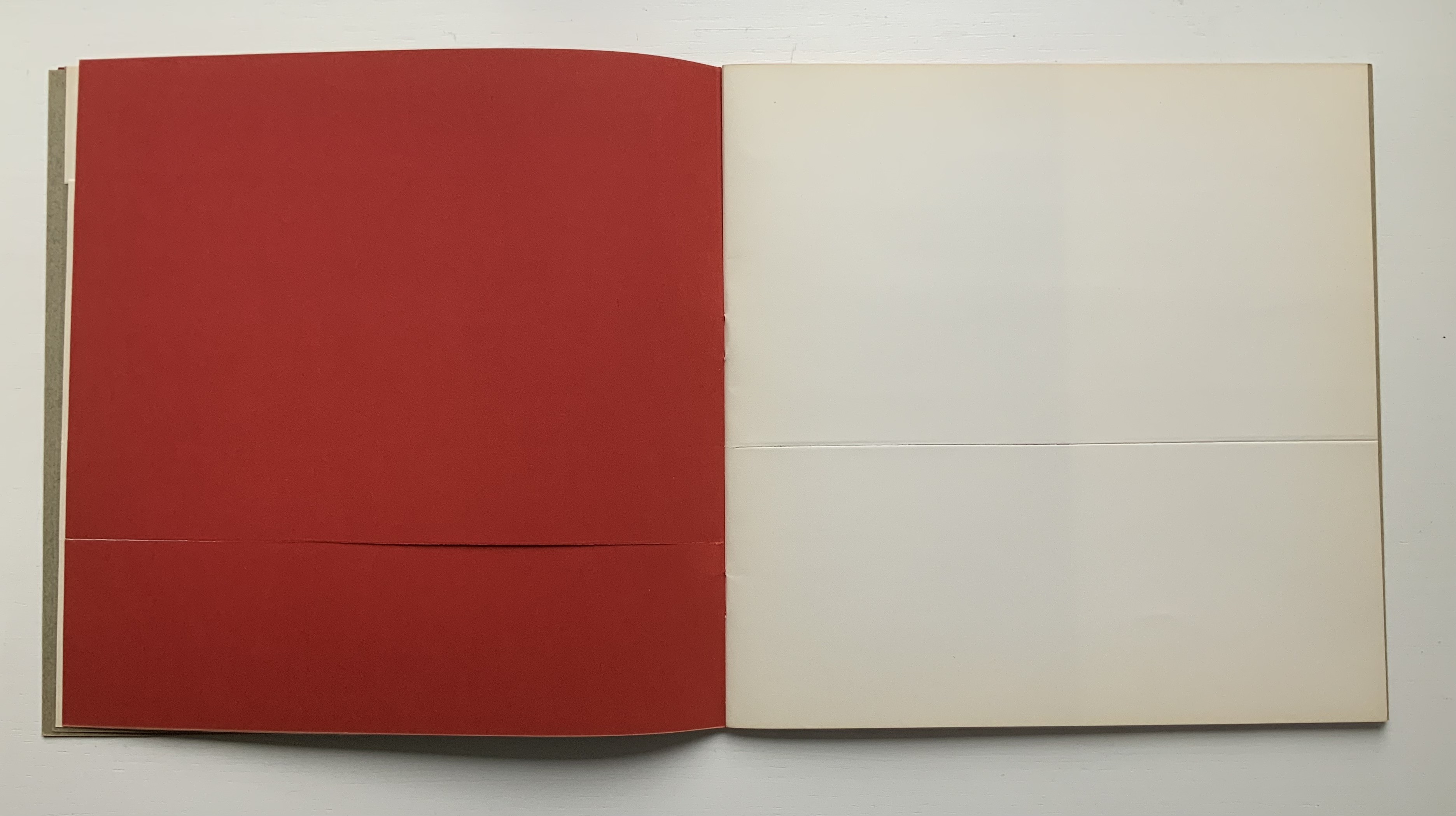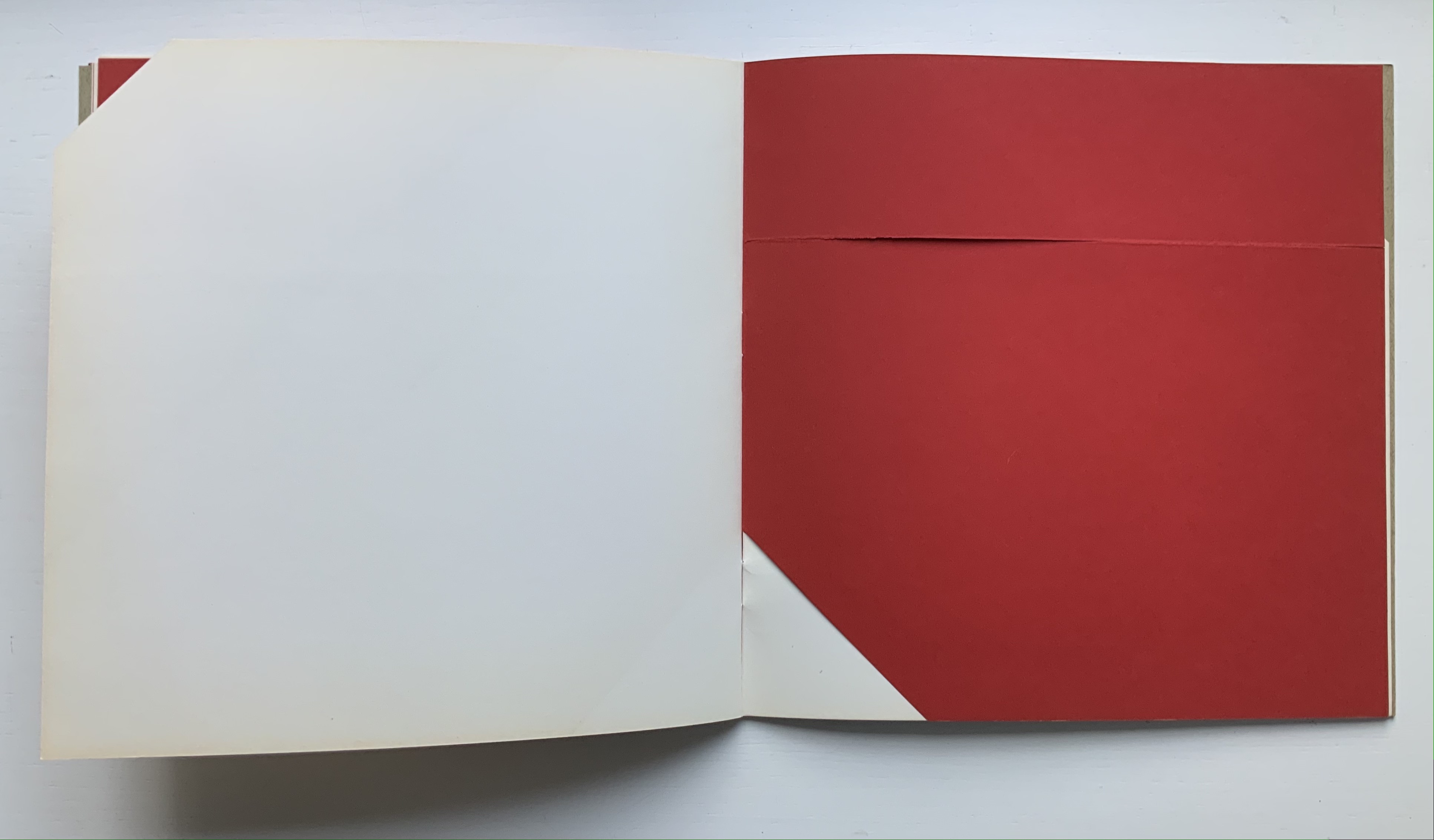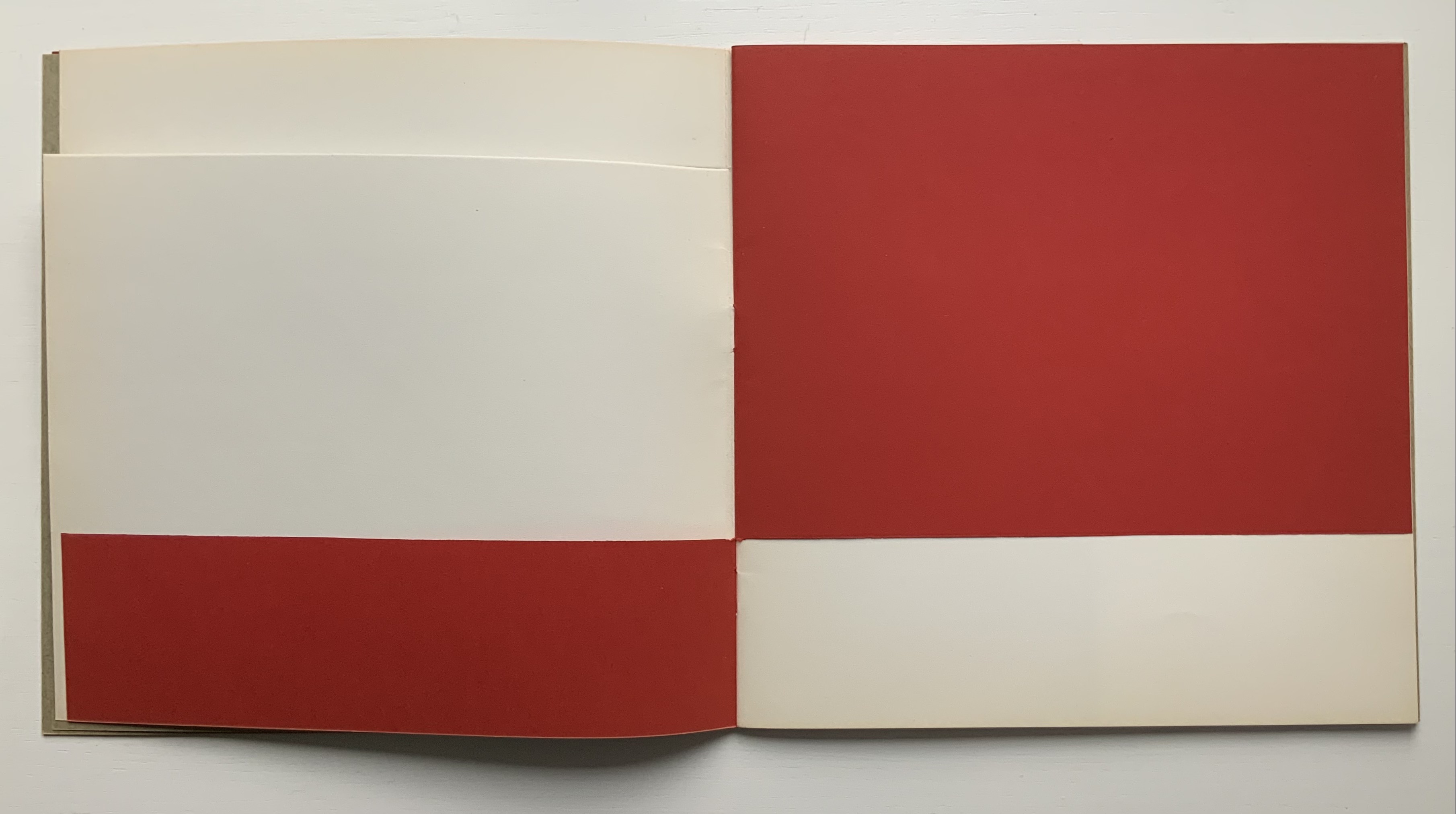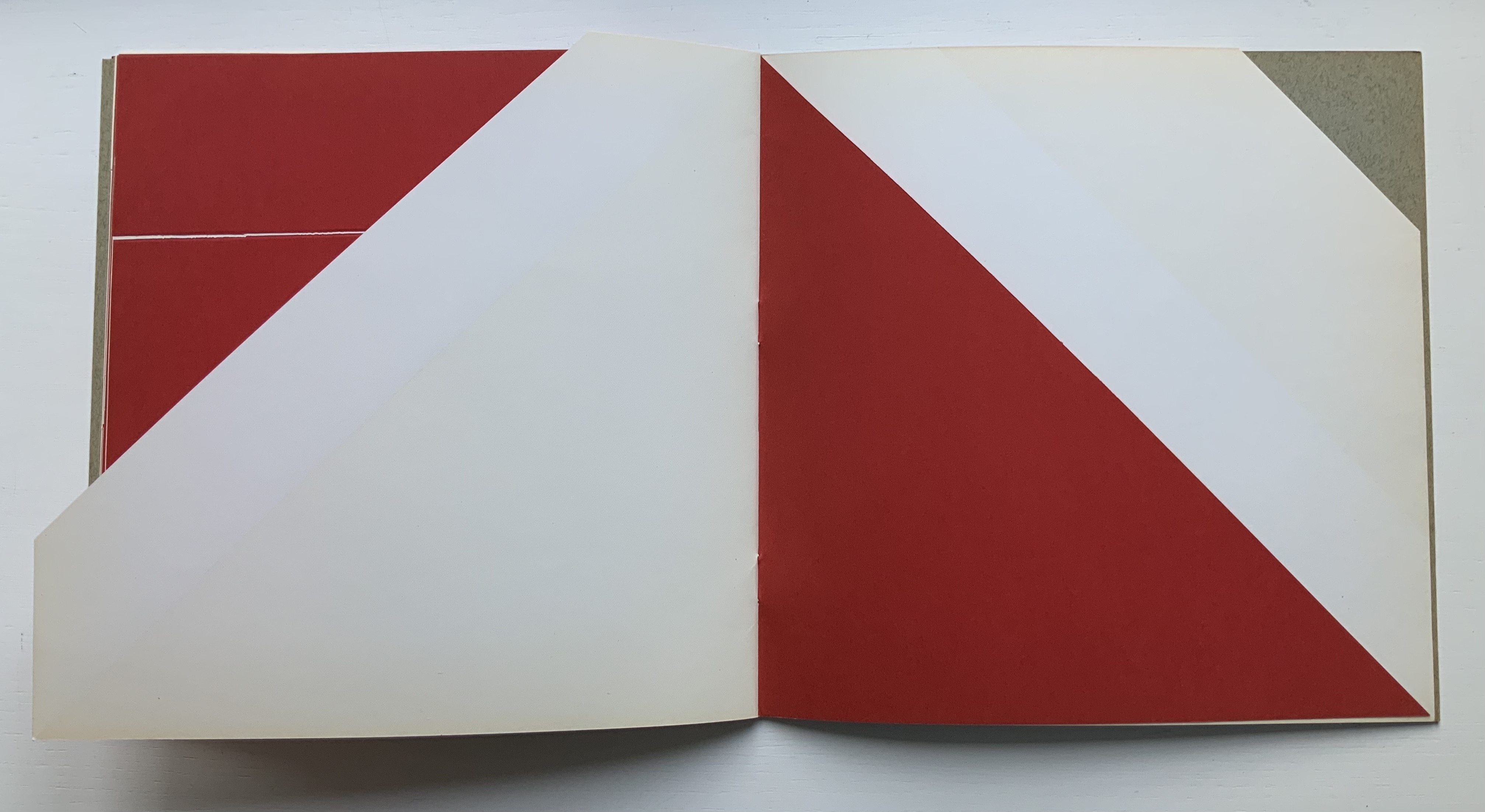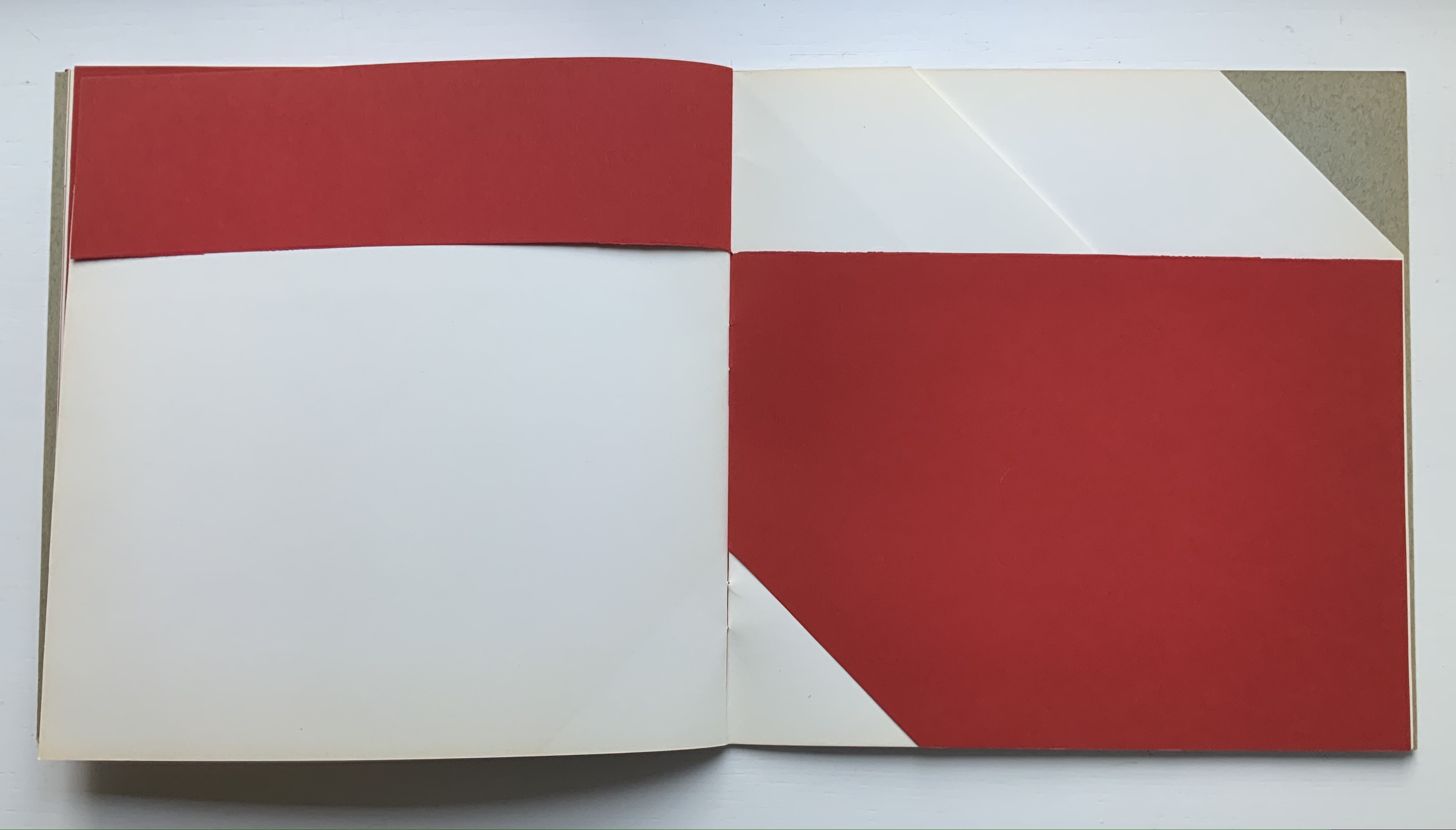 Although there are no words on numbered pages that have to fall in the right order, An Unreadable Quadrat-Print still presents the author/printer/binder with a challenge in imposition. White and red alternate, which is easy enough, but to cut or not cut a folio on the left and right, how to cut it, how to place the differently cut folios in the right order to achieve the variation in images when the pages turn, how to ensure a sewable area down the center for each folio whether it has a horizontal cut extending into the spine or a diagonal one extending from some point along the spine — that is impressive. It speaks to the sculptural process and result in making books, as well as the sculptural process of reading them.
