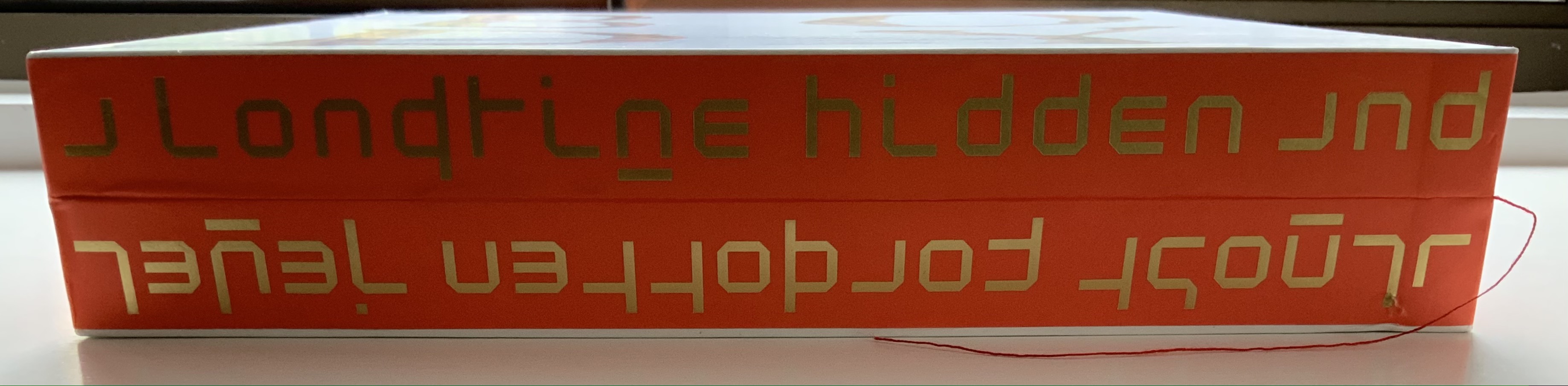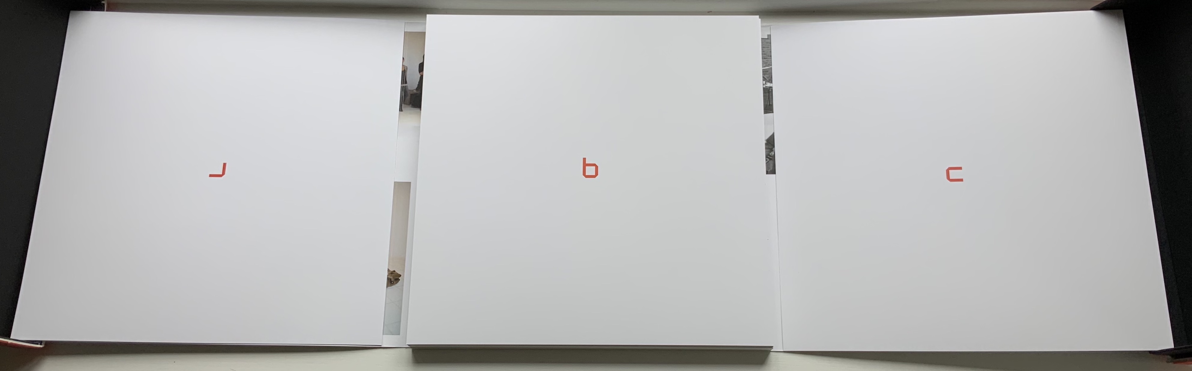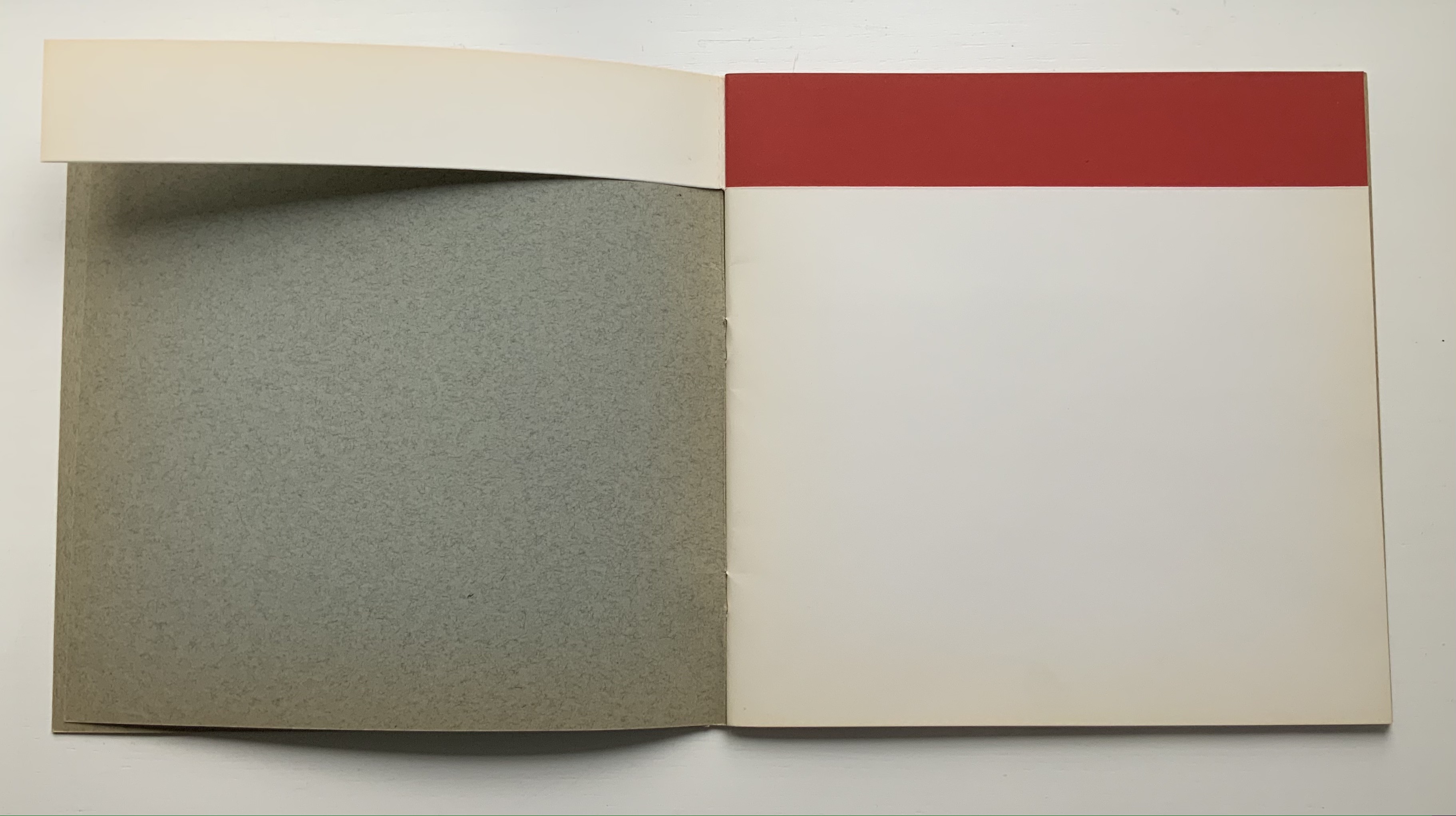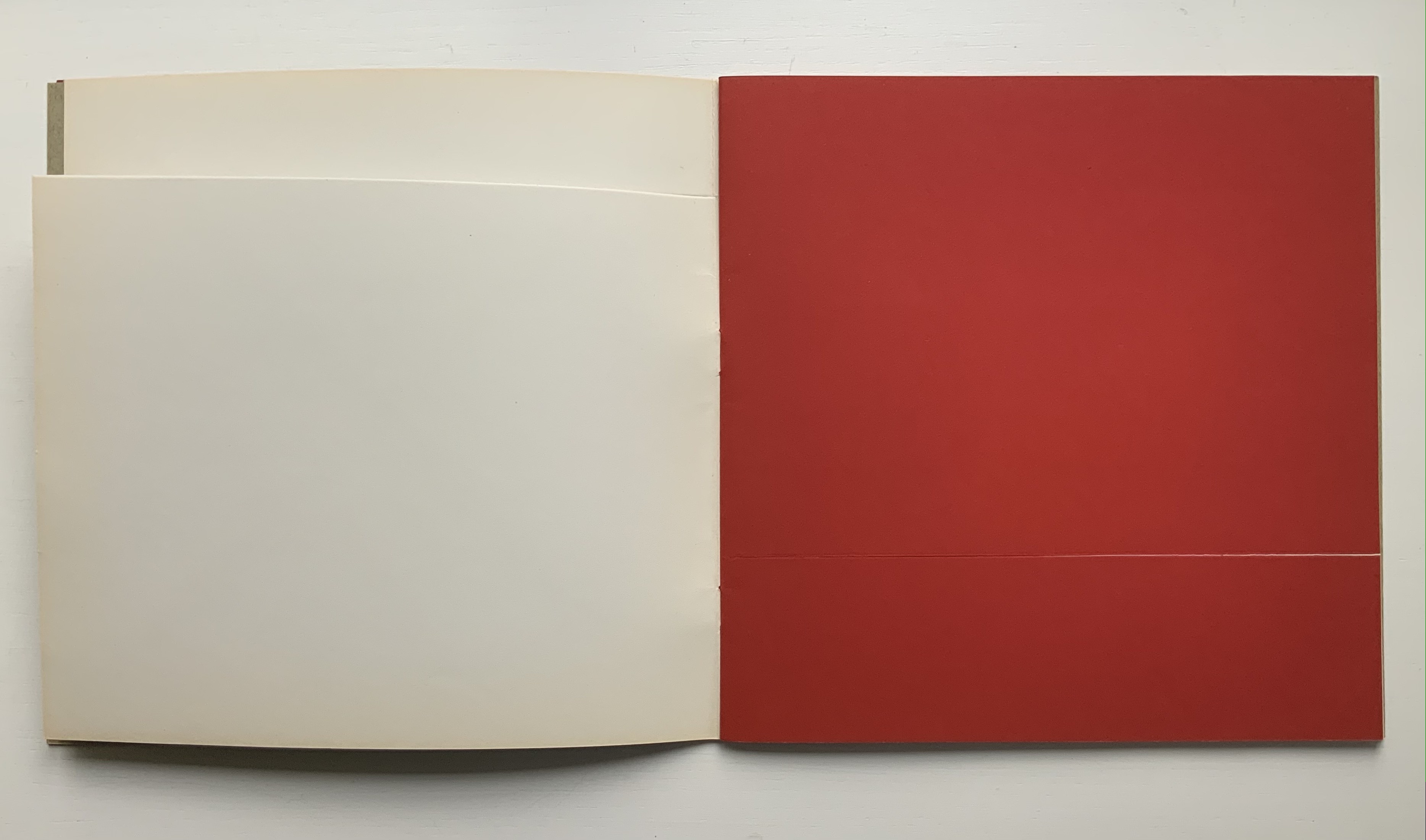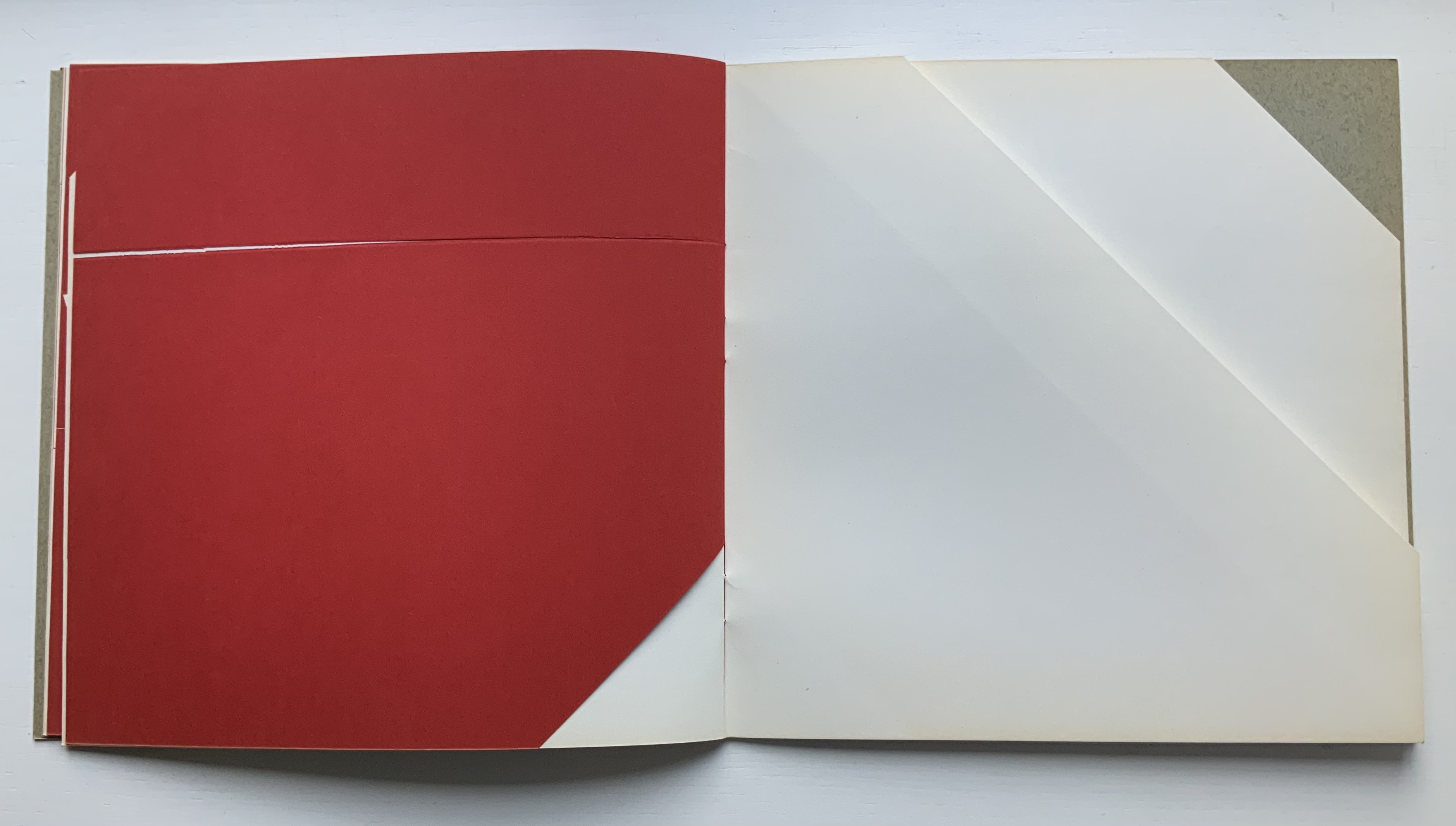Although there are no words on numbered pages that have to fall in the right order, An Unreadable Quadrat-Print still presents the author/printer/binder with a challenge in imposition. White and red alternate, which is easy enough, but to cut or not cut a folio on the left and right, how to cut it, how to place the differently cut folios in the right order to achieve the variation in images when the pages turn, how to ensure a sewable area down the center for each folio whether it has a horizontal cut extending into the spine or a diagonal one extending from some point along the spine — that is impressive. It speaks to the sculptural process and result in making books, as well as the sculptural process of reading them.