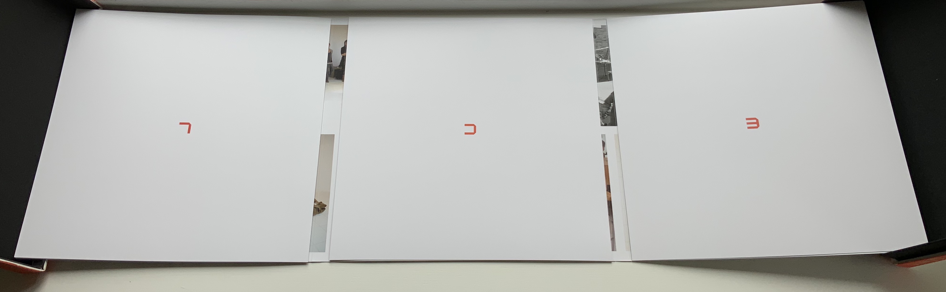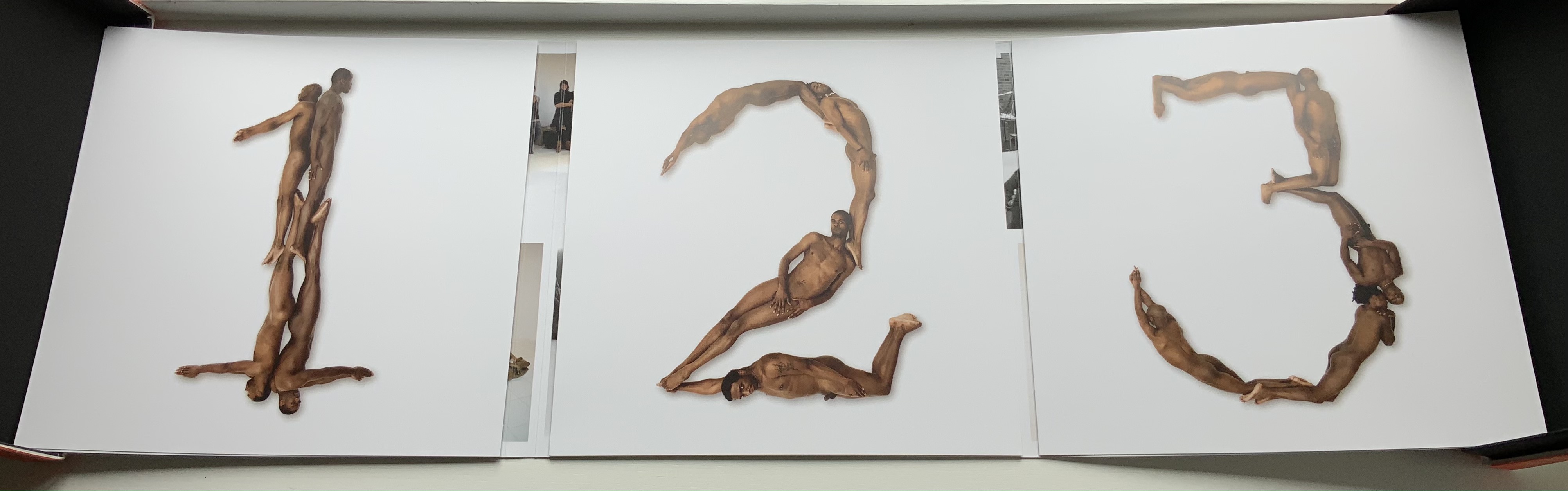 The second work in the box is a portfolio containing a full-color recreation of the original 1969 alphabet and punctuation marks with the addition of Naked Numbers. On the inner side of the portfolio’s wraparound, Ed van der Elsken’s black-and-white production shots sit side by side with the new color production shots. The full color folios themselves present on one side the character constructed with human bodies and on the other side the corresponding character from Crouwel’s New Alphabet.