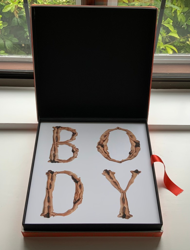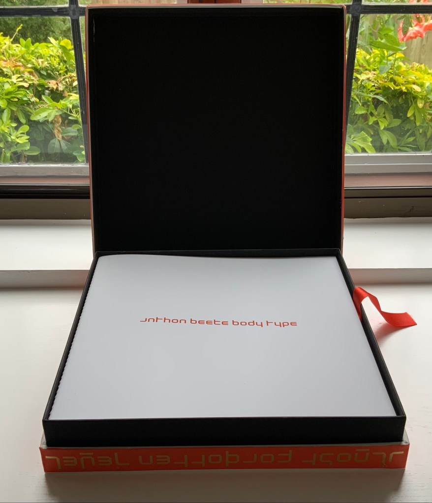 Designer René Knip and Spinhex & Industrie Drukkerij have preserved two important artifacts in typographic and design history and brought them to renewed artistic life. In a way, the collector gets to participate. Body Type arrives as a sealed time capsule requiring a razor to open it and let out the past. Inside are three glossy works lying atop a ribbon pull. The first work is a softcover book, its spine sewn with red thread to match the title on the front cover. Announcing the renaming of Beeke’s Alphabet (1969) as Body Type, it is cheekily set in Crouwel’s New Alphabet (1967) to which Beeke’s original “naked ladies alphabet” had responded. These are the two artifacts preserved, in Crouwel’s case, by use of his alphabet for the titles and section headings and, in Beeke’s case, by extension of his typeface and recreation of the photoshoot that originally realized it. Given their deaths at the end of the last decade (Beeke in 2018, Crouwel in 2019), Body Type provides a valuable juxtaposition of their reflections (Crouwel’s preface and Beeke’s essay).