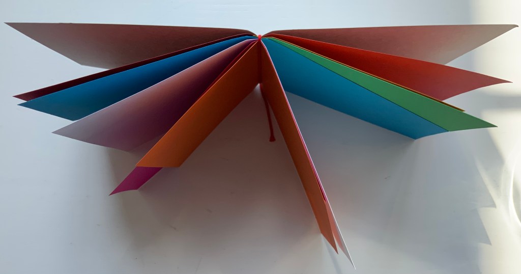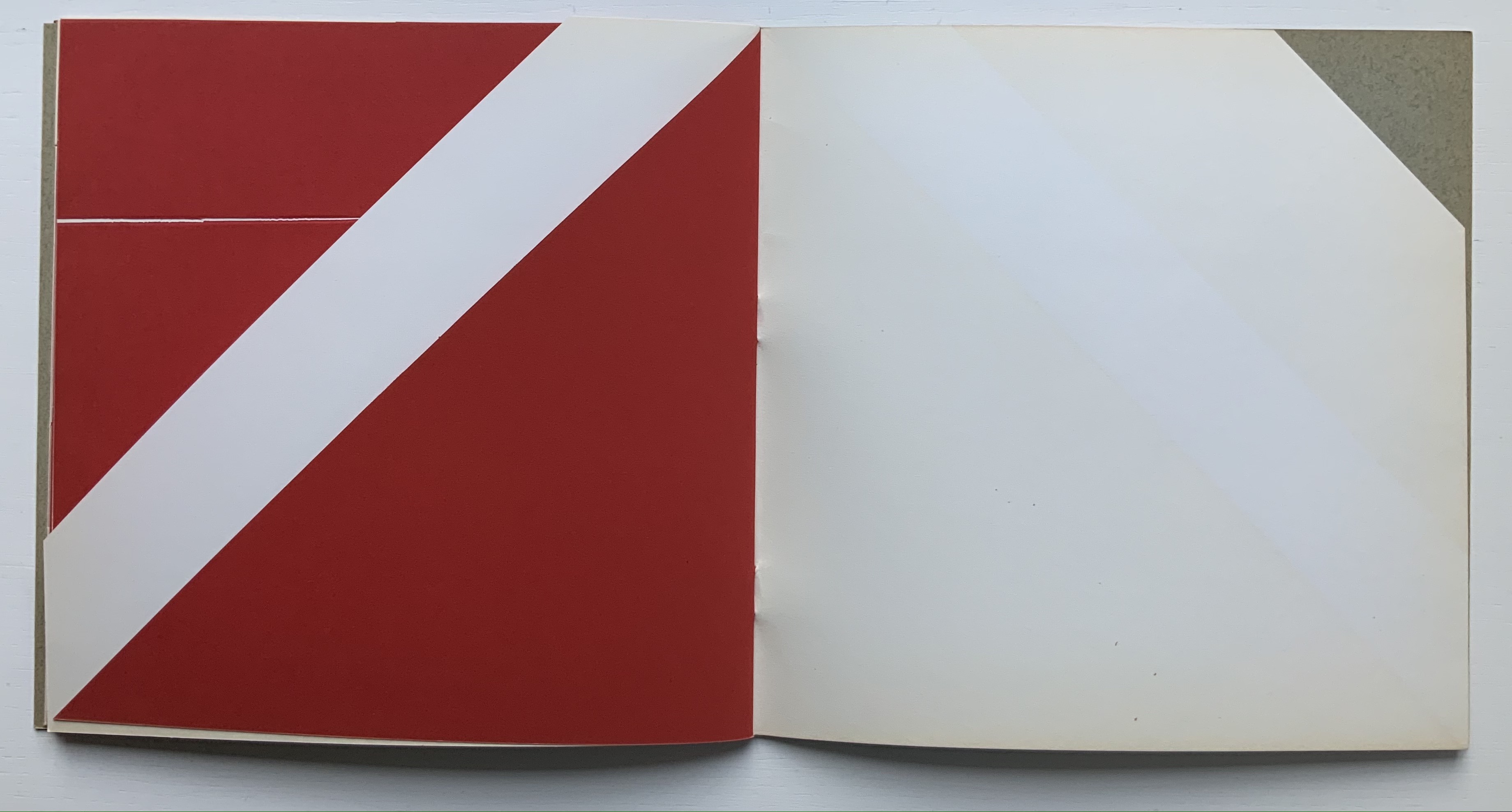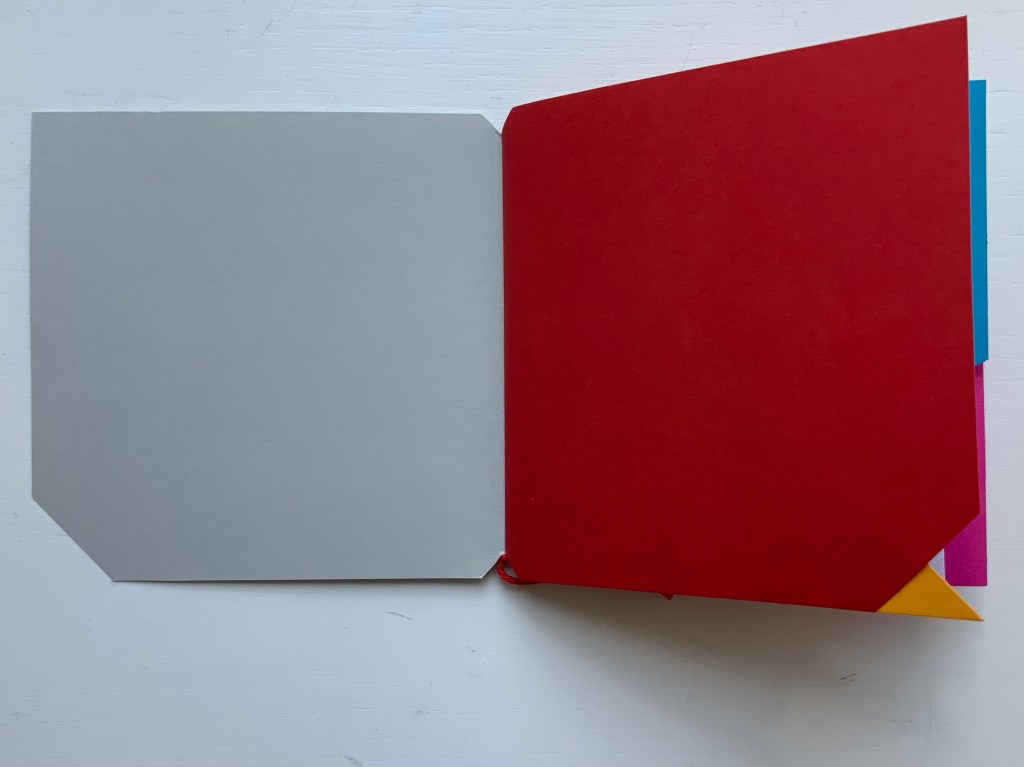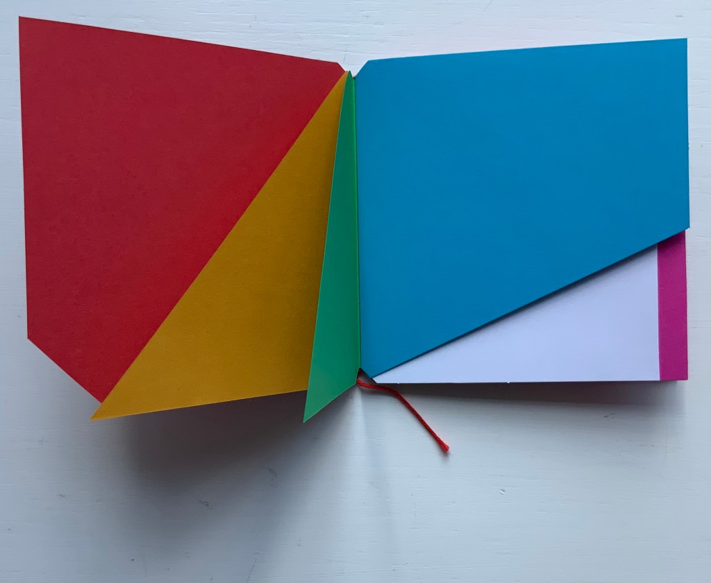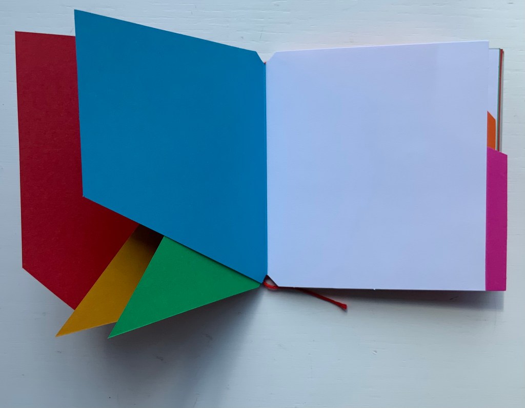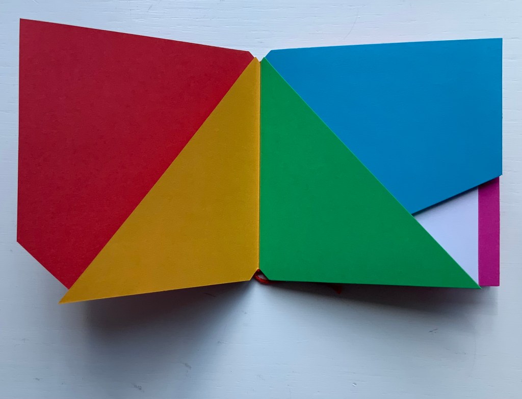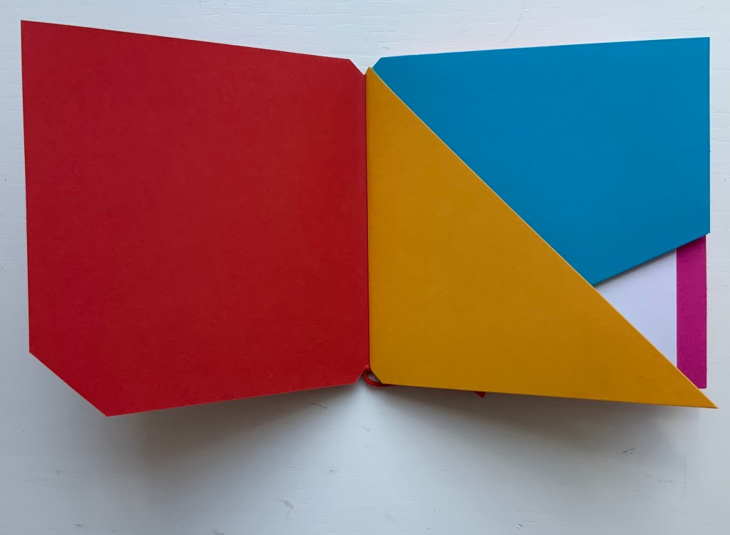 The following sequences — the book’s first five double-page spreads and then its last six — take a normal page-turning approach, always turning from the upper right corner of whatever shape/page is available. Note how, in the last six double-page spreads, the pages and shapes become more complex.