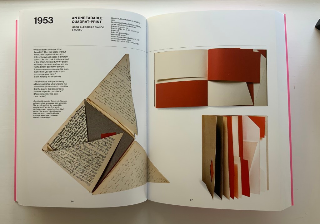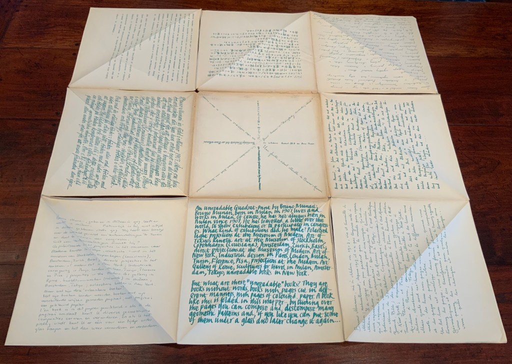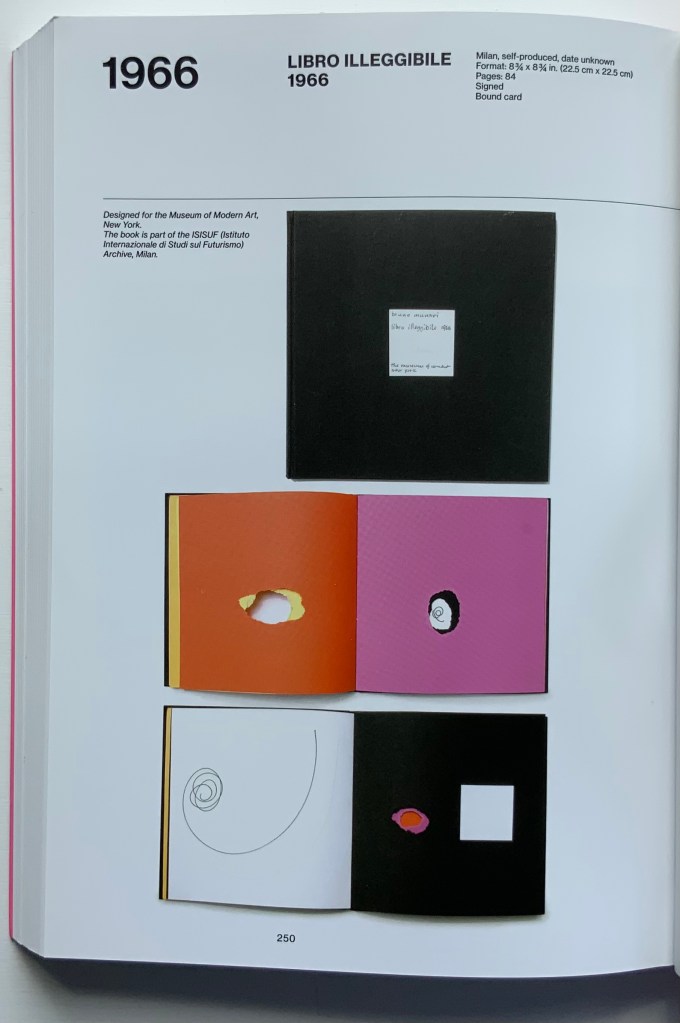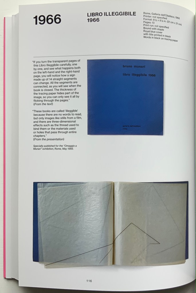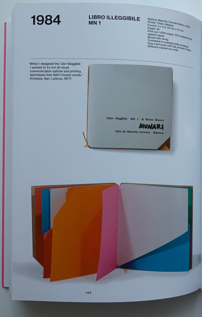 Although not a book of Munari’s making, David A. Carter’s Le sculture da viaggio di Munari is one way of bringing the spirit of Munari’s “travel sculptures” into the collection. Carter’s homage carries the blessing of Corraini Edizioni, further justifying its inclusion.