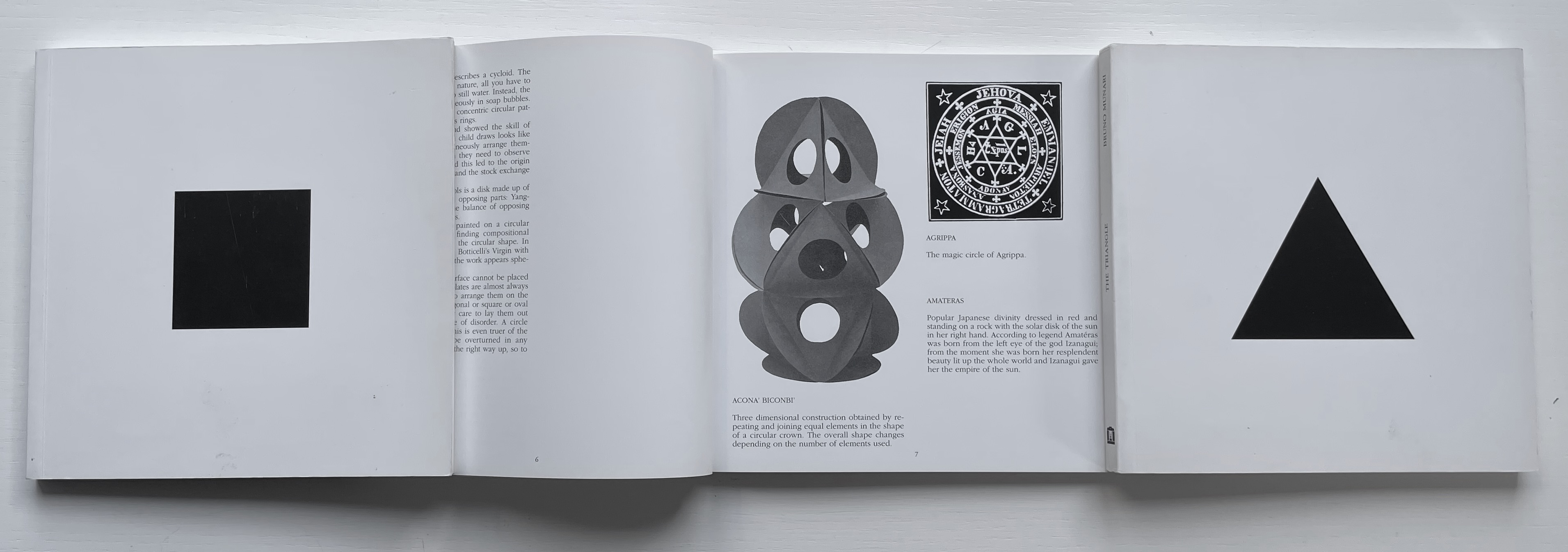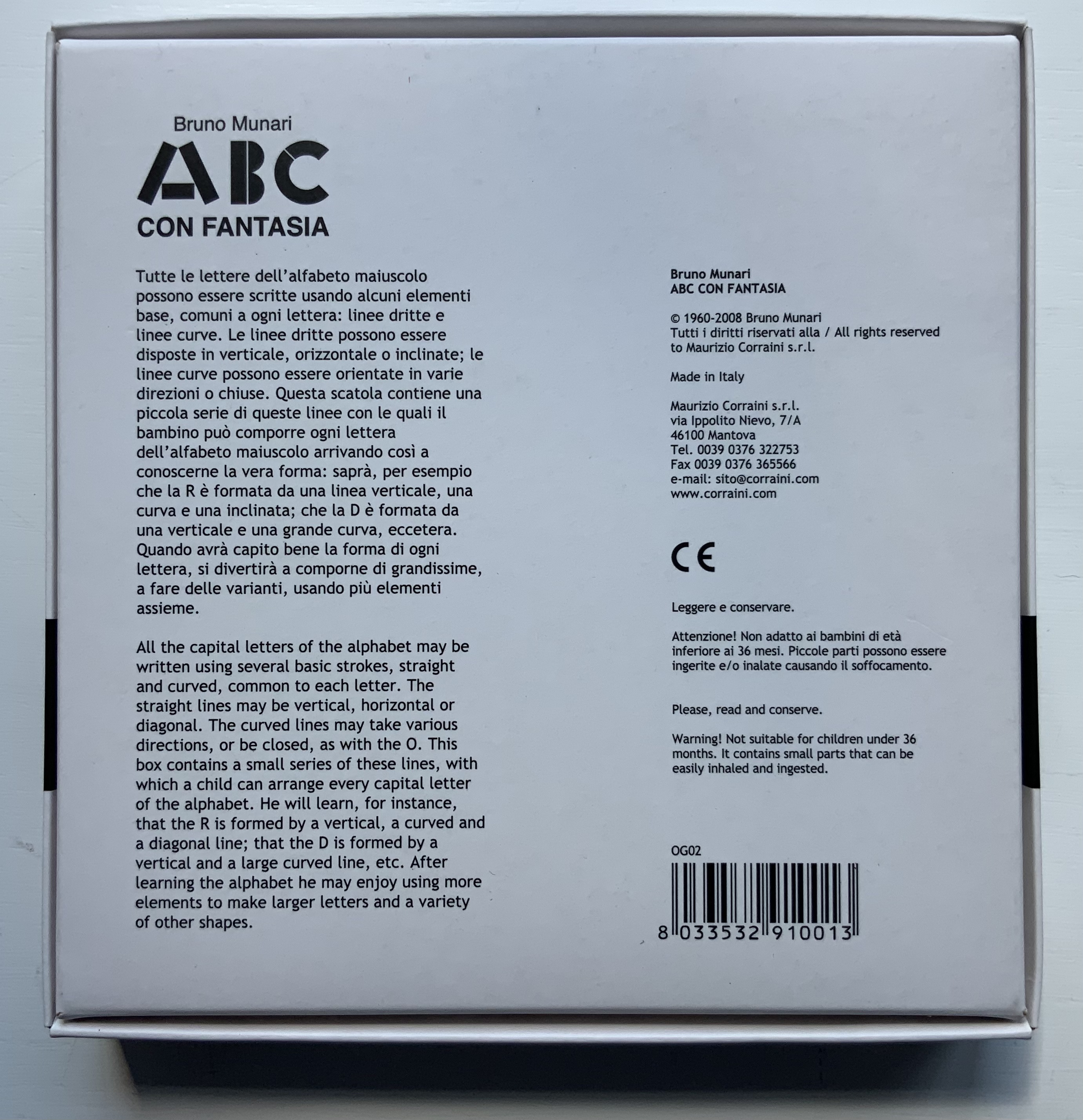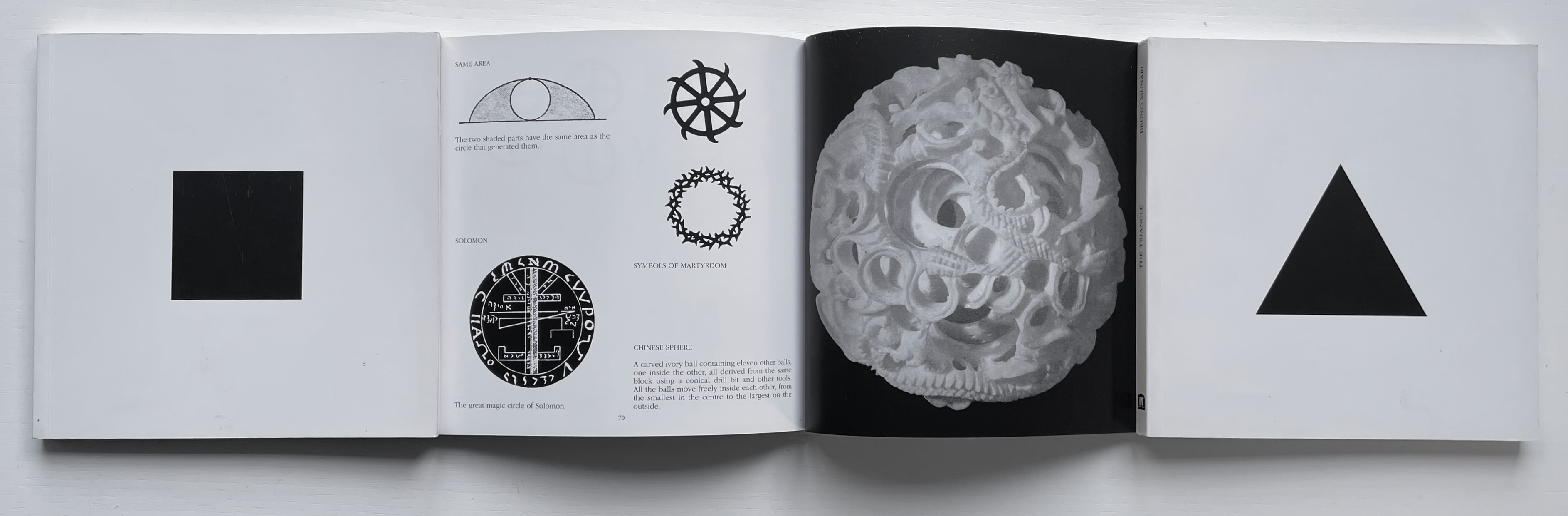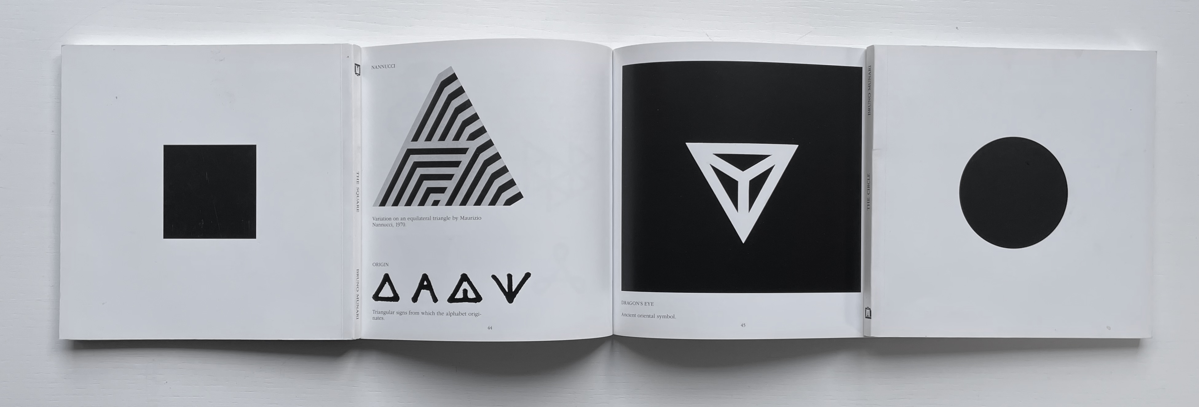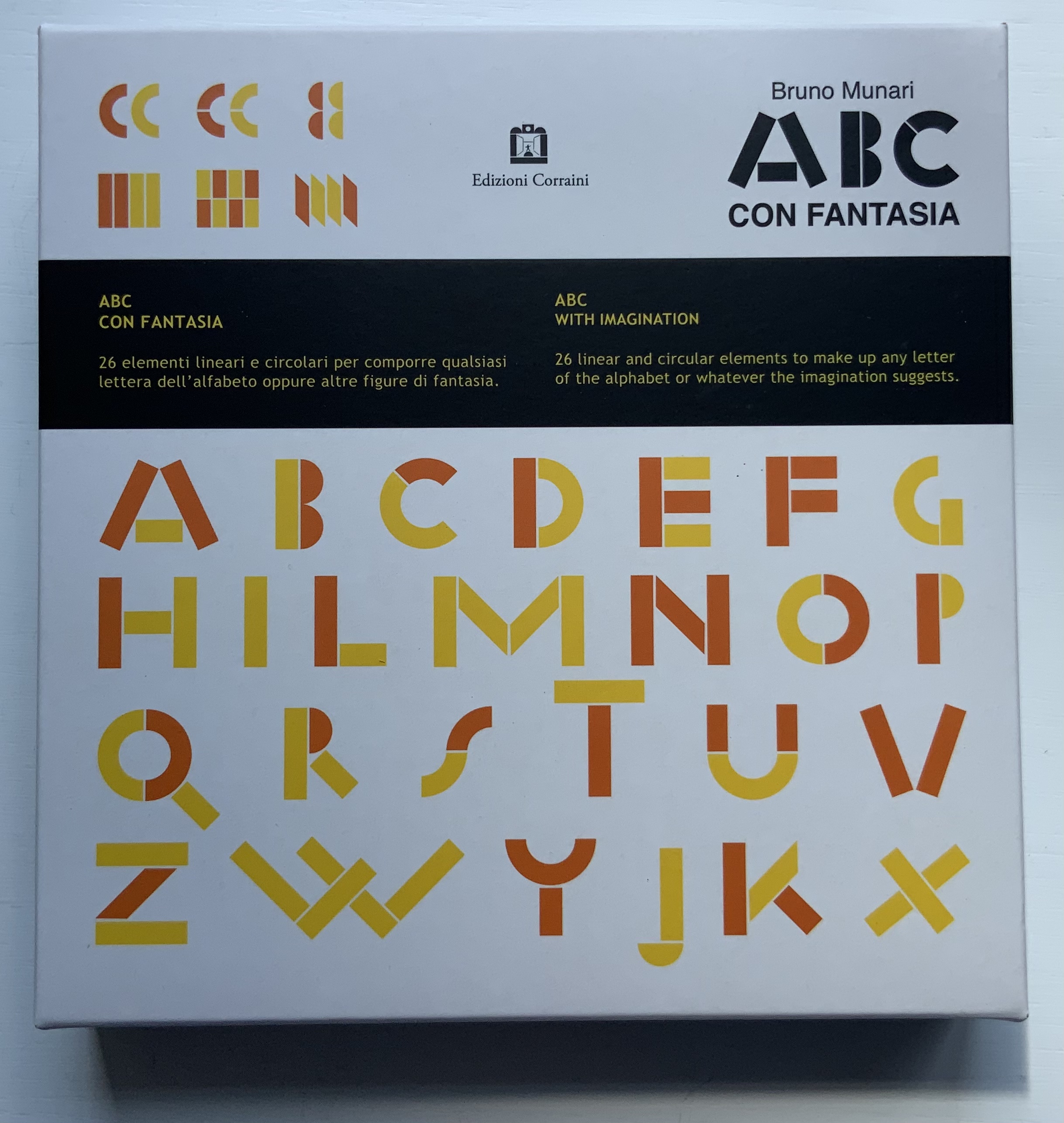 Although not shown in Munari’s Books, an alphabet-related work that underscores Picasso’s calling Munari “our Leonardo” is ABC con fantasia (1973/2000). If we are to believe Fra Luca Pacioli, it was Leonardo da Vinci who inspired his “straight lines and curves” exposition for creating letters. Following in their footsteps, Munari provides the linear and curvilinear basics for the collector and offspring to join the game.