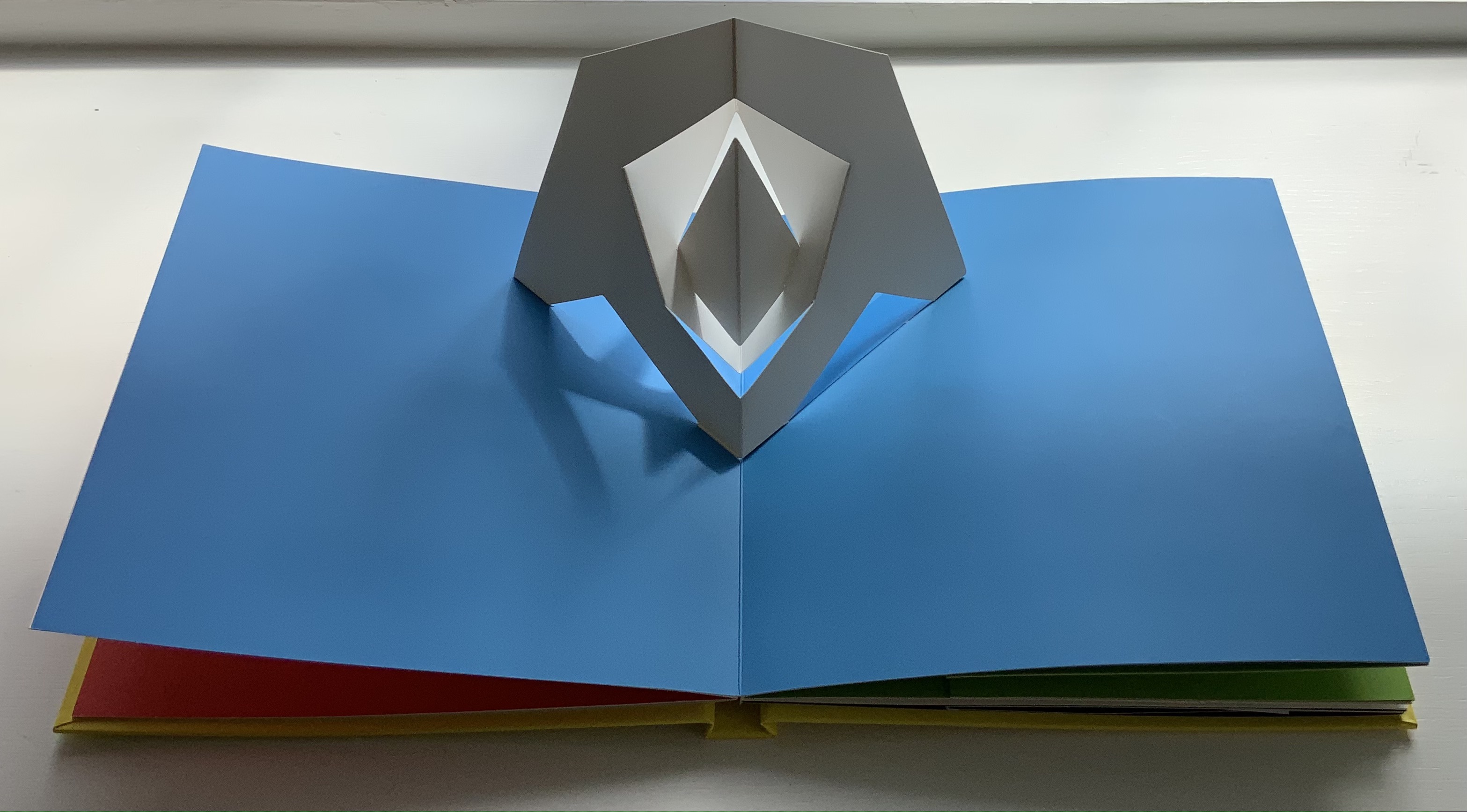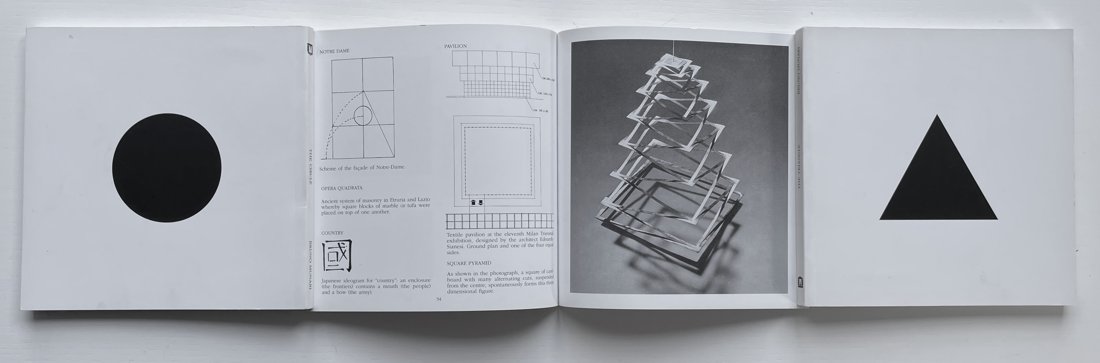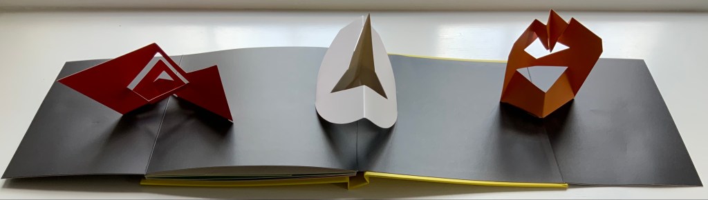 Travel sculptures started off as small sculptures (some even pocket-sized) to carry with you, so you could take part of your own culture to an anonymous hotel room. Later they were turned into ‘travel sculptures’, five or six metres tall and made of steel. One of these was seen for a few months in Cesenatico, another one in Naples. Others are sleeping among huge trees in the Alto Adige region.’ This is how Italian designer Bruno Munari (1907-1998) described his ‘travel sculptures’, which in turn inspired American illustrator and designer David A. Carter for this pop-up book. –Corraini Edizioni website. Accessed 3 August 2021.