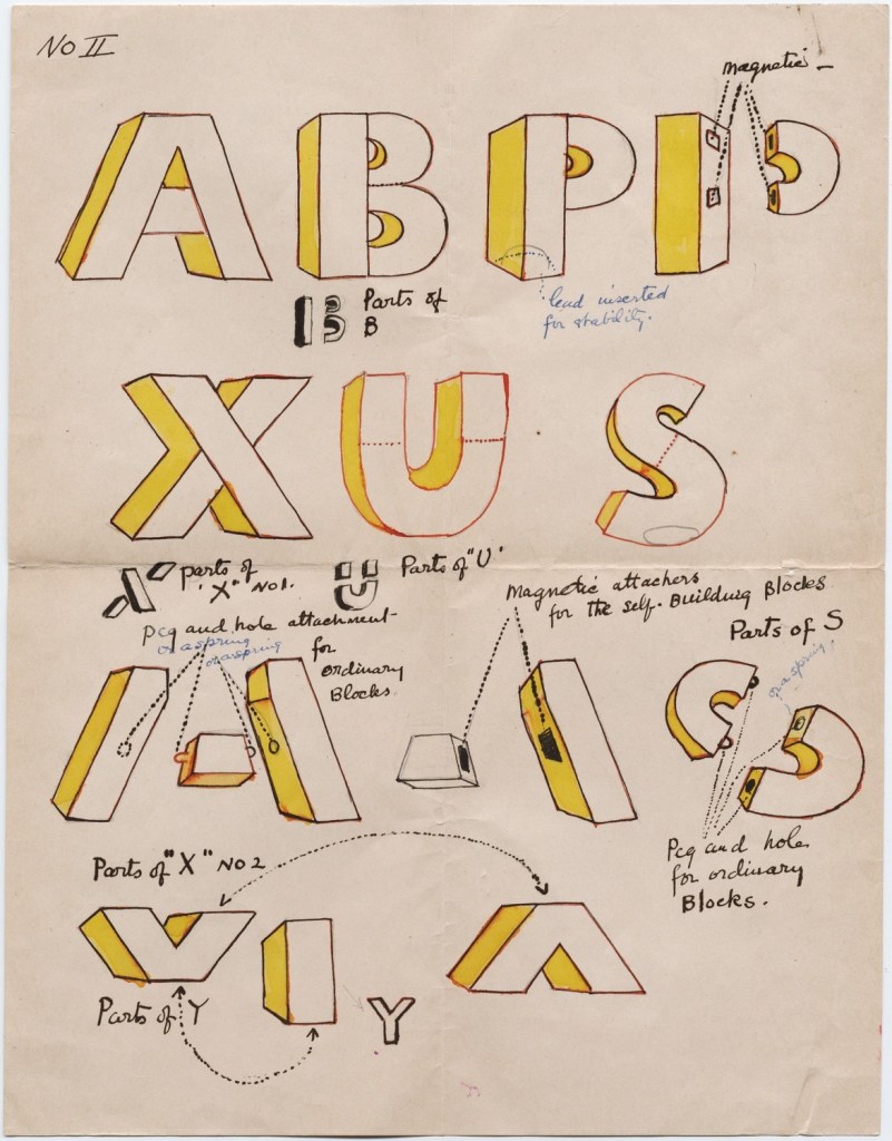 This is the alphabet that inspired Raffaella della Olga’s LINE UP (2020), also in this collection. At the UK’s National Physical Laboratory, Epps and Evans created their alphabet in 1969 in response to the challenge to overcome machine-readable typefaces’ human-unreadability. Perhaps because it was the second of three responses to Wim Crouwel‘s New Alphabet (1967), published in the Kwadraatblad/Quadrat-prints series, the Dutch graphic designer and series editor, Pieter Brattinga, snatched it up for publication in his series of experiments in printing ranging over the fields of graphic design, the plastic arts, literature, architecture and music. This particular issue was designed by John Stegmeijer at Total Design.