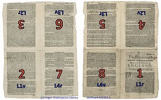 Above is a numbered example of the same newsbook that I used as an image in my last post. The red numbers are page numbers: folded in the right way, you’d get an 8-page booklet in the order indicated. But if you look closely, you’ll see that the actual news sheet doesn’t have page numbers. Instead, there are signatures: at the bottom of the first page is a tiny, blotted “L”; at the bottom of the 5th page is a tiny “L3″ (the “L2″ has been cut off at some point when the page was trimmed). These are signature marks that count off by leaves. What’s a leaf, you ask? It’s a physical unit of paper: when you turn the page in a book, you are actually turning a leaf of paper. Early modern printers would have thought in terms of sheets and leaves, not pages, when they were figuring out how to print a work. Depending on the imposition (how the text is laid out on the sheet), you could end up with different numbers of leaves: 1, 2, 4, 8, 12, 16, 24. A quarto imposition results in a sheet of paper being turned into 4 leaves; there are 2 pages to each leaf (a recto side and a verso side), so there are 8 pages in all. The blue letters and numbers show the signatures. One thing that throws off beginners is understanding how recto and verso relate to each other. They do not mean right and left but front and back.