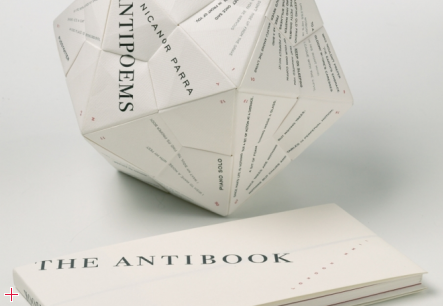 The reader must fold the pages of the book (20.5 x 10.5cm) to form the icosahedron (15 x 17 x 19cm) in order to read Parra’s antipoems in order.