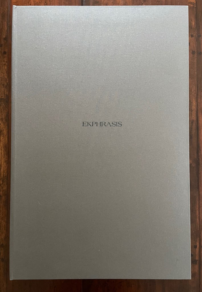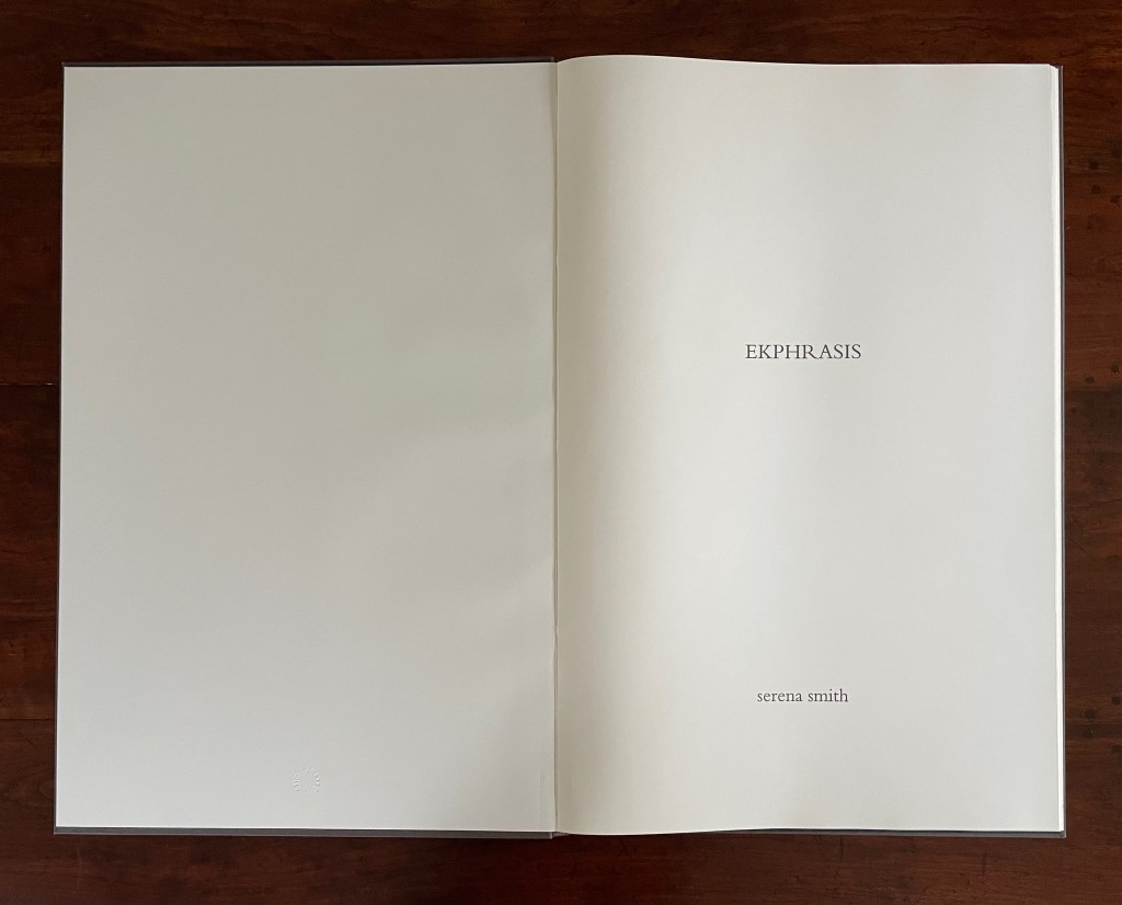 Ekphrasis (2020) Serena Smith Case bound with letterpress printed cloth cover H700 x W460 x D20 mm. 23 folios: 2 end leaves, 1 title, 10 hand-colored images printed on to 225gsm Simili Japon, 10 bronzed text printed onto translucent paper. Edition of 5, of which this is #5. Acquired from the artist, 5 January 2023. Photos: Books On Books Collection. Photos and videos: Courtesy of the artist. Displayed with permission of the artist.