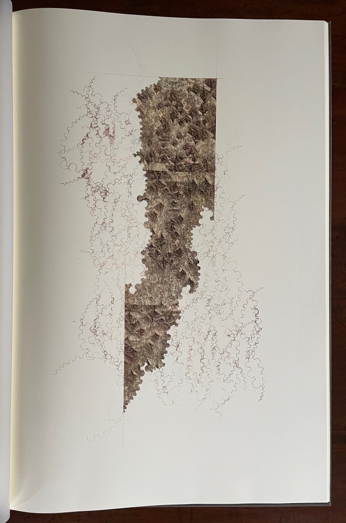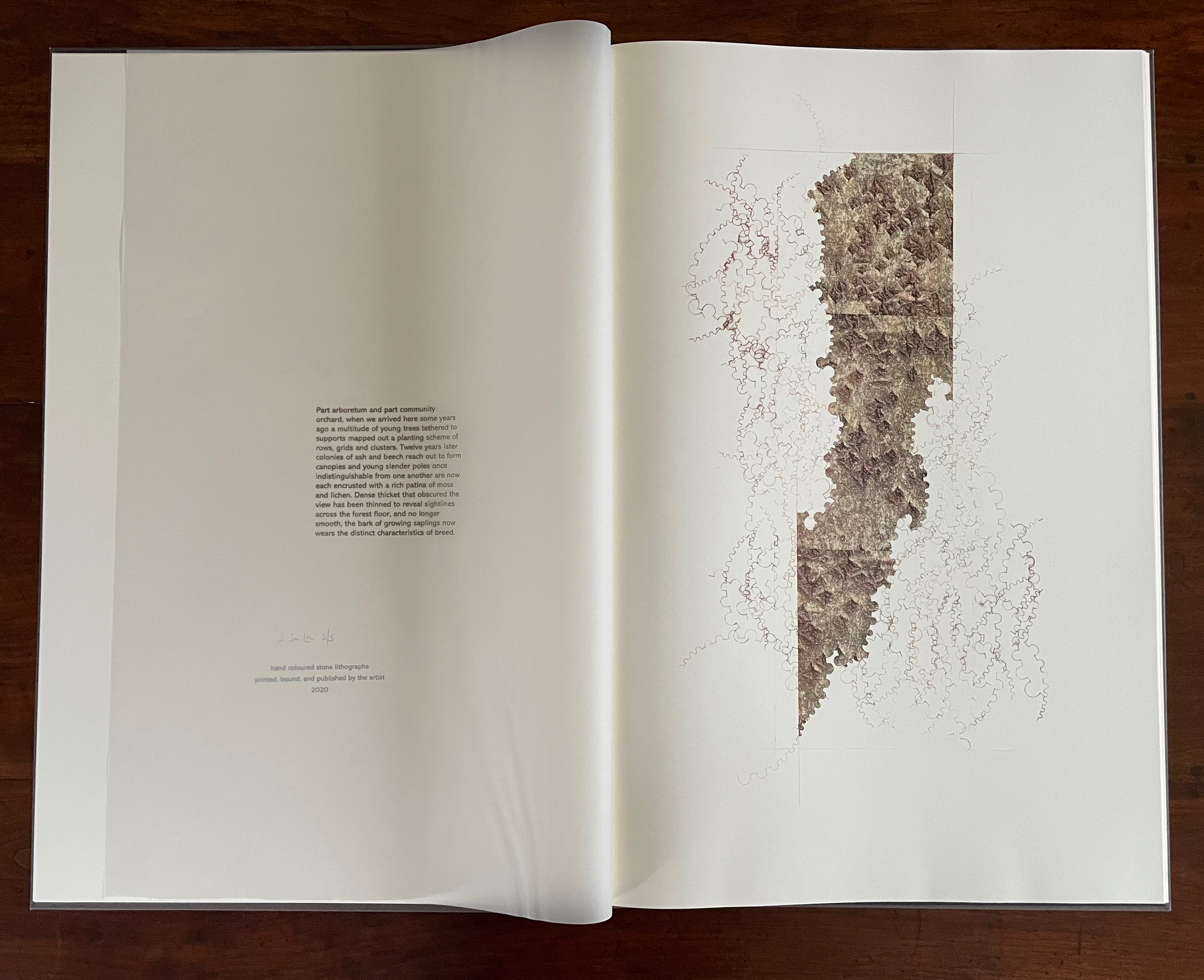 In this bookwork, ten pages of text printed on translucent paper overlay ten images printed from stone. The text reflects on the “wandering, watching and thinking that happens in the parkland”, but then it turns internally to the studio, the ephemera collected from the woodland, and the stage before the images come into being. The process of making becomes an object of the ekphrastic text: smoothing the stone, using a tool to guide the pencil, sharpening the pencil. And gradually the work reveals itself as a self-reflexive meditation on natural and artificial creation, on word and image, and on trace lines of growth and decay.