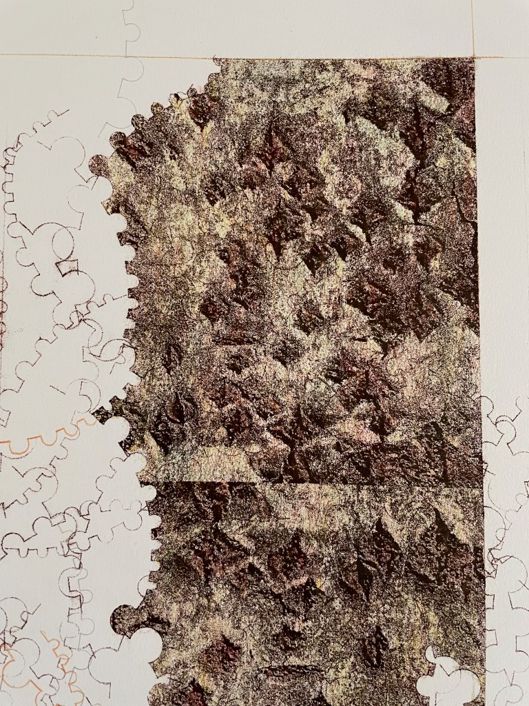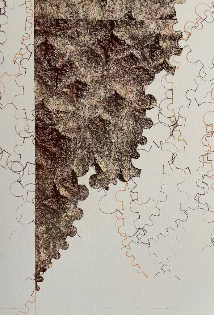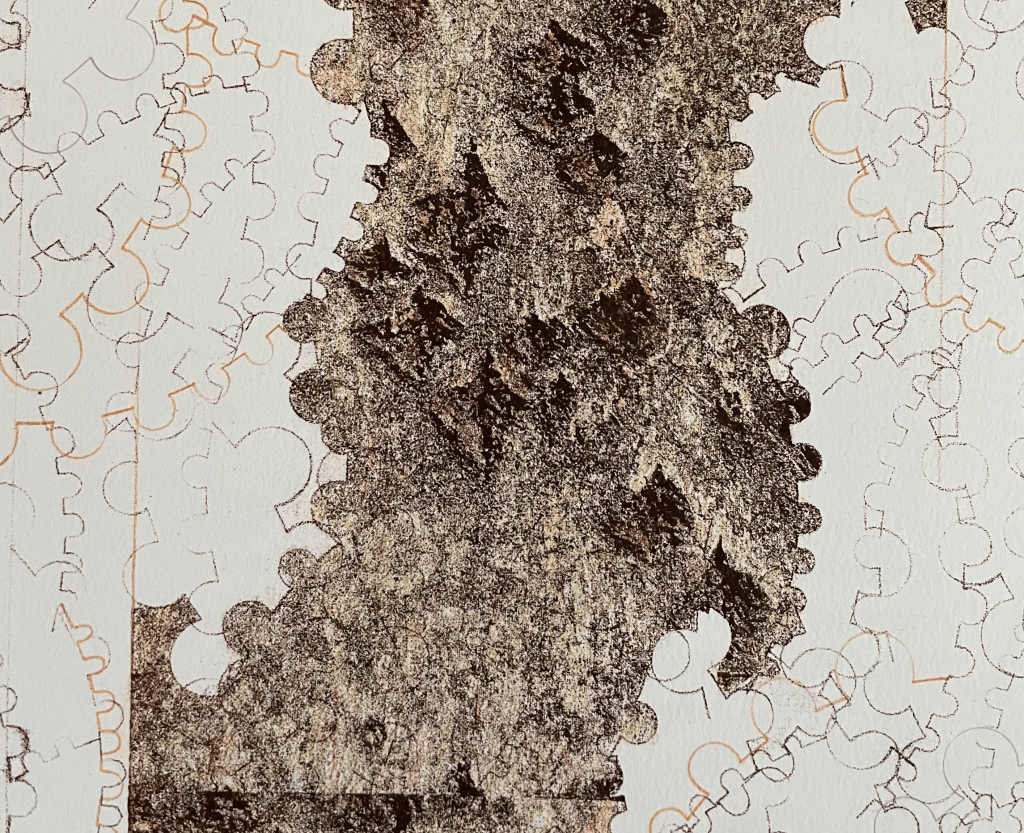 The lithographic image divides into three parts. The jigsaw-like lines around the image of bark come from a stencil tool, and the result chimes with planning lines of landscape architecture, feeding insects’ tracks in the bast, the shape of lichen and ultimately the Ogham runes mentioned in the text and depicted at the end.