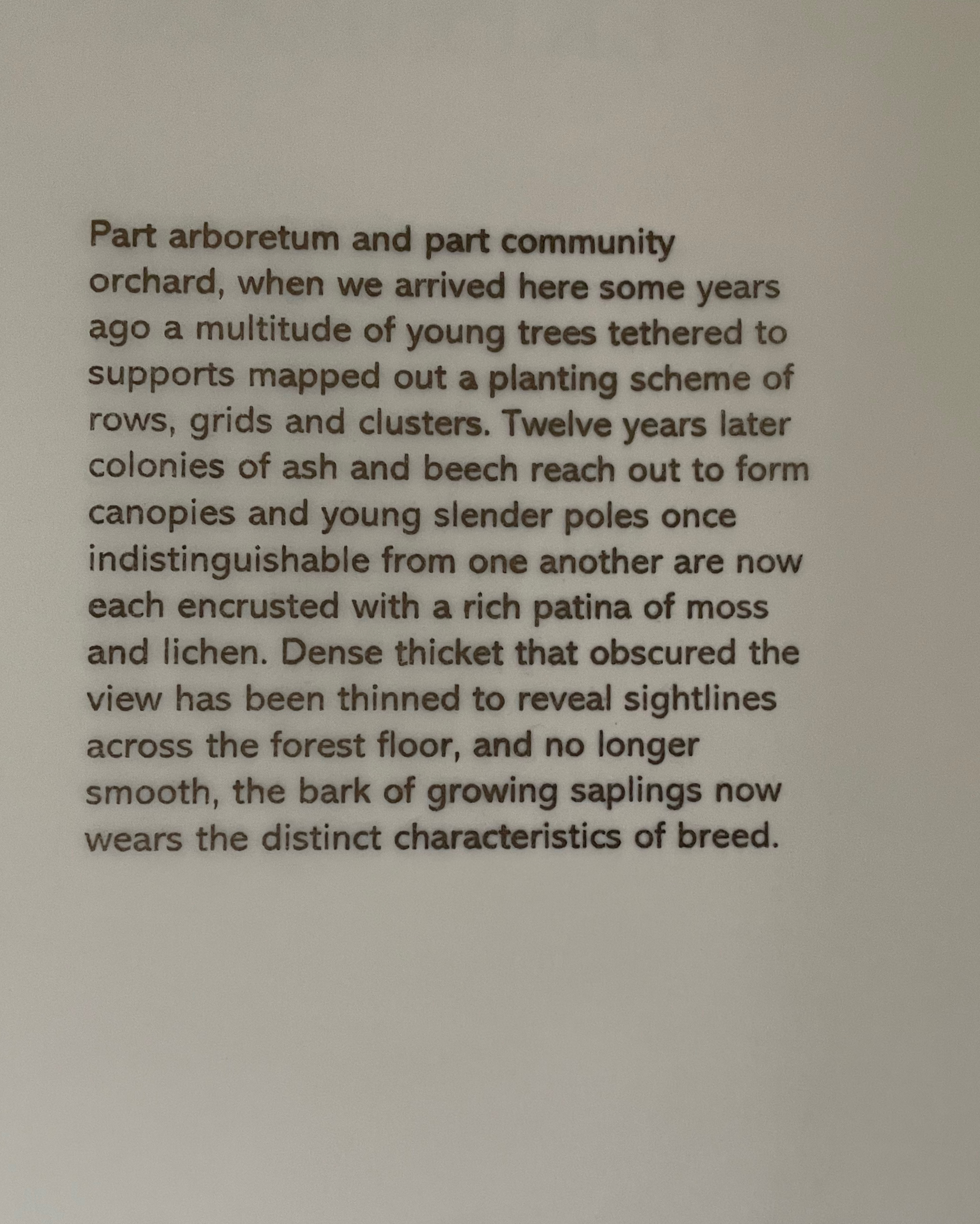 Serena Smith has a different point of departure for Ekphrasis. Her dwelling and studio back onto a Leicestershire country park — “part arboretum and part community”. Highlighted with maple, Tibetan cherry and Himalayan birch, the planted woodland of ash and beech with its defined paths offers up “artefact of living trees” as much a constructed work of visual art as any urn, painting or sculpture.