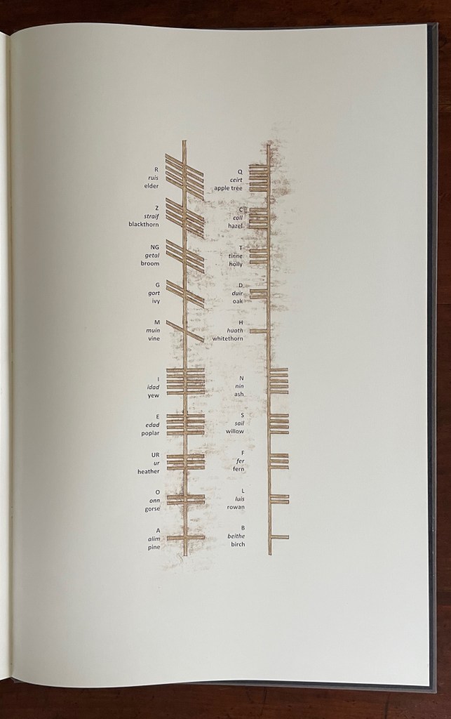 The following ekphrastic words bring the lithographic process to life. Taken together, the glossary, Smith’s descriptive text, and its ekphrastic focus on the lithographic process transform her stone into a kind of Ogham stone itself.